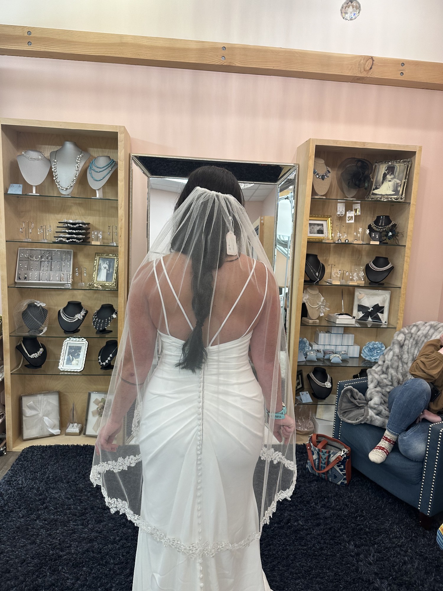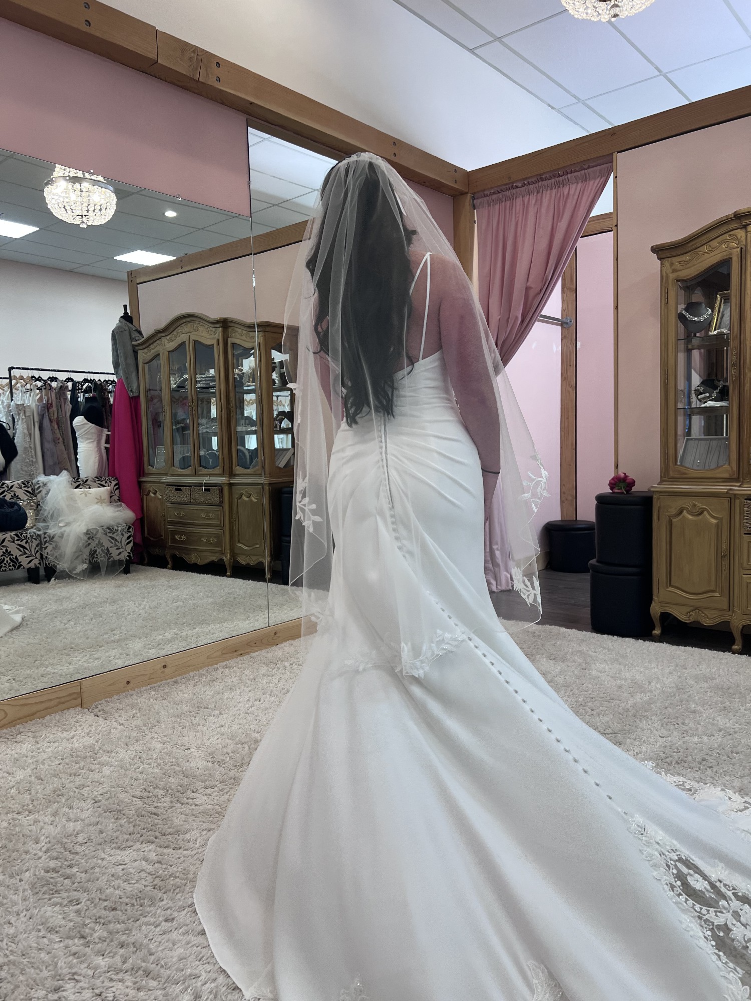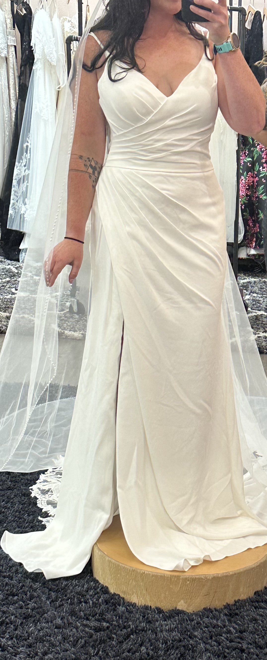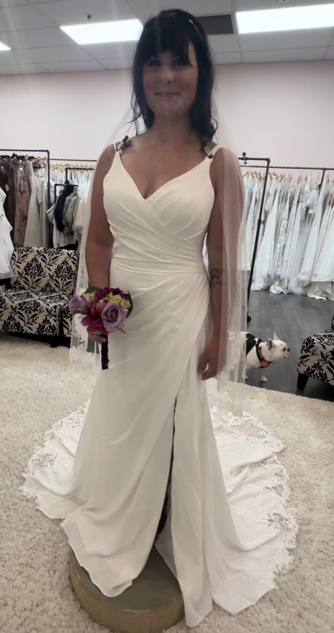 Purchased from Anderson’s bridal - never worn, only tried on (I ended up going with a different dress). Originally purchased for $1,300. Has been stored in waterproof bag. Unaltered size 12, fits more like an 8-10. Has a gorgeous train with lace detailing and a slit on the left side. I adored this dress but went with a completely different vibe. My loss is your gain!