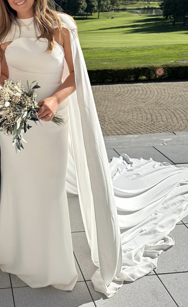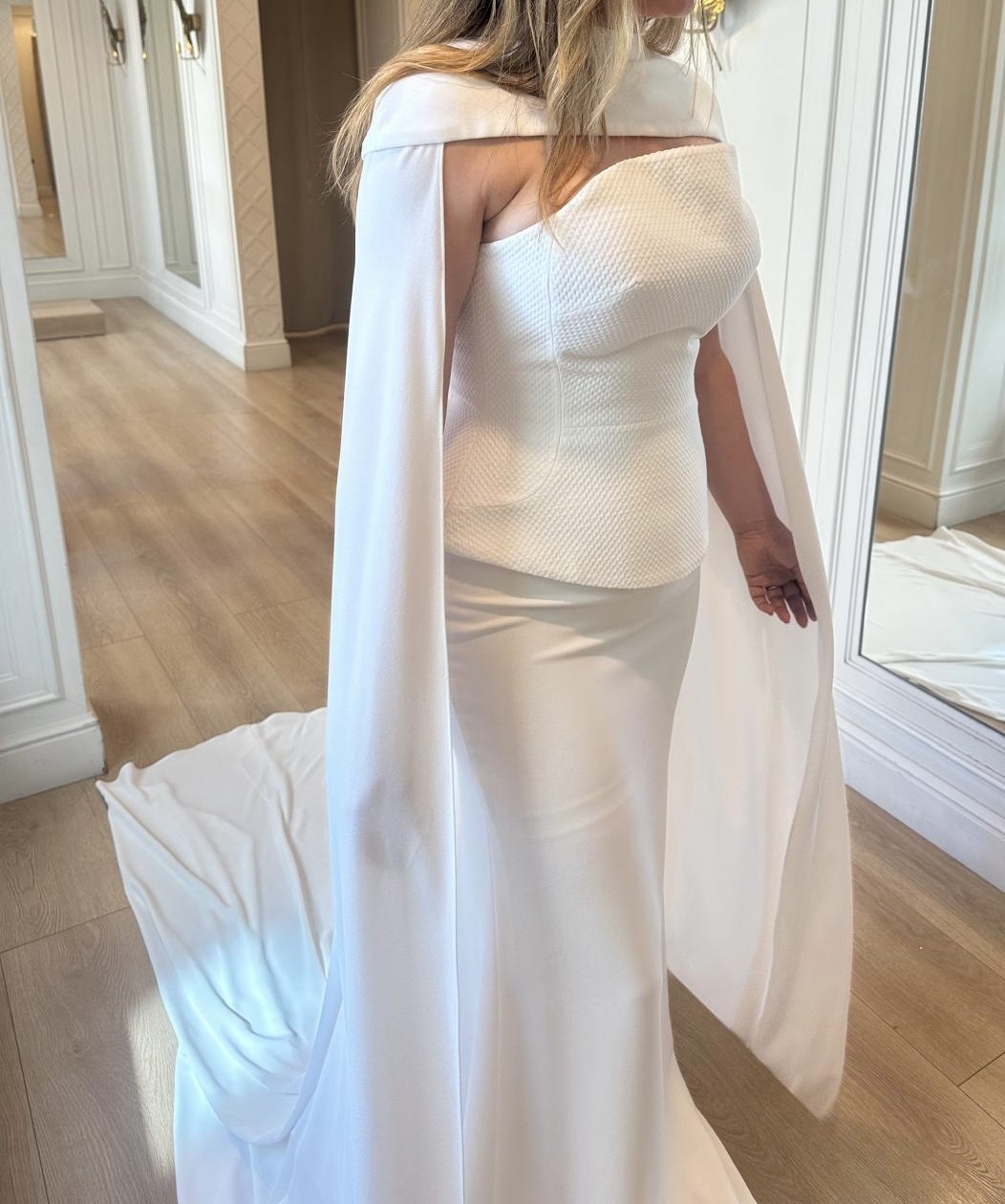 Comes with the cape that you can attach at the front of the dress for a seamless look.