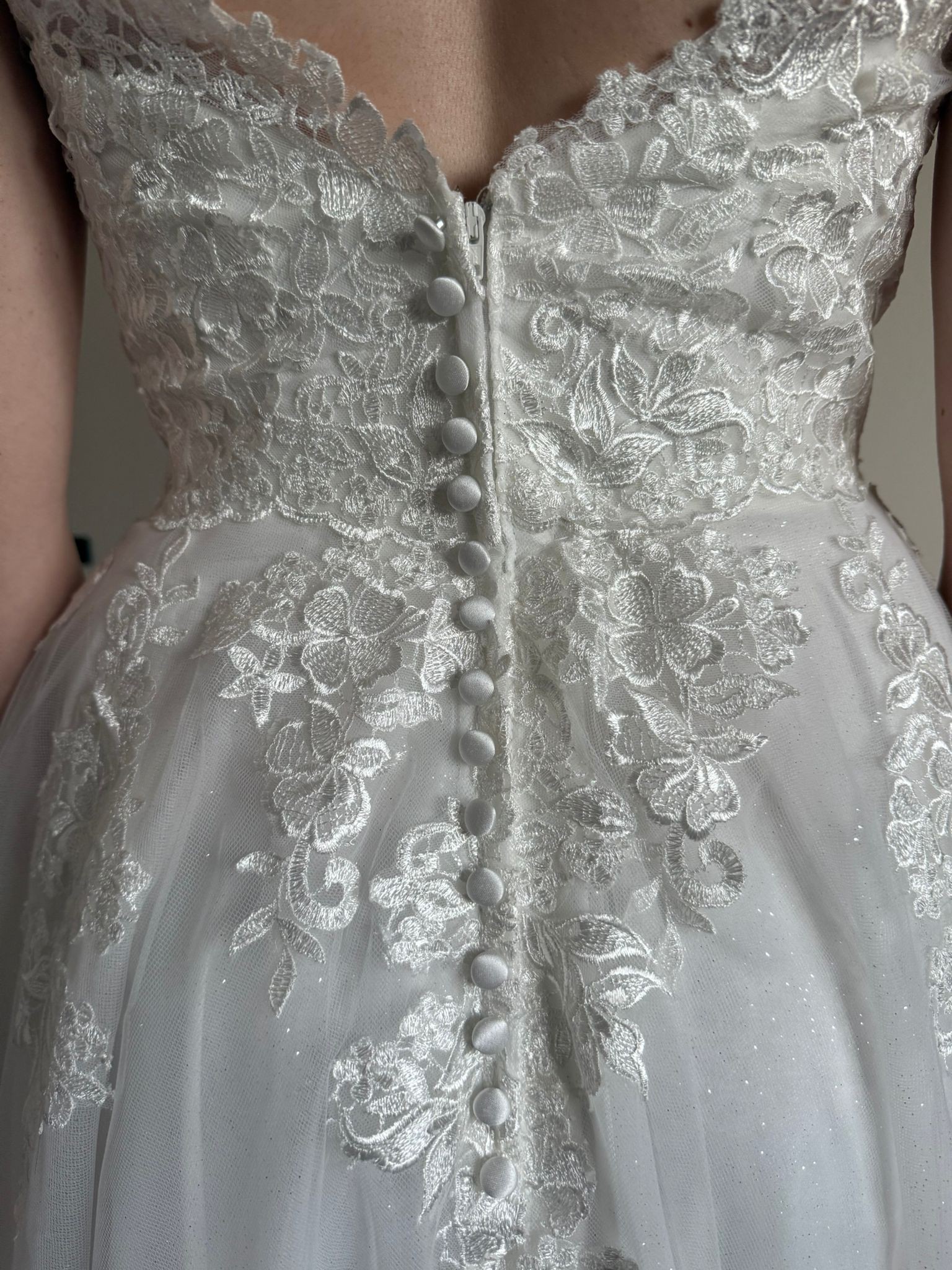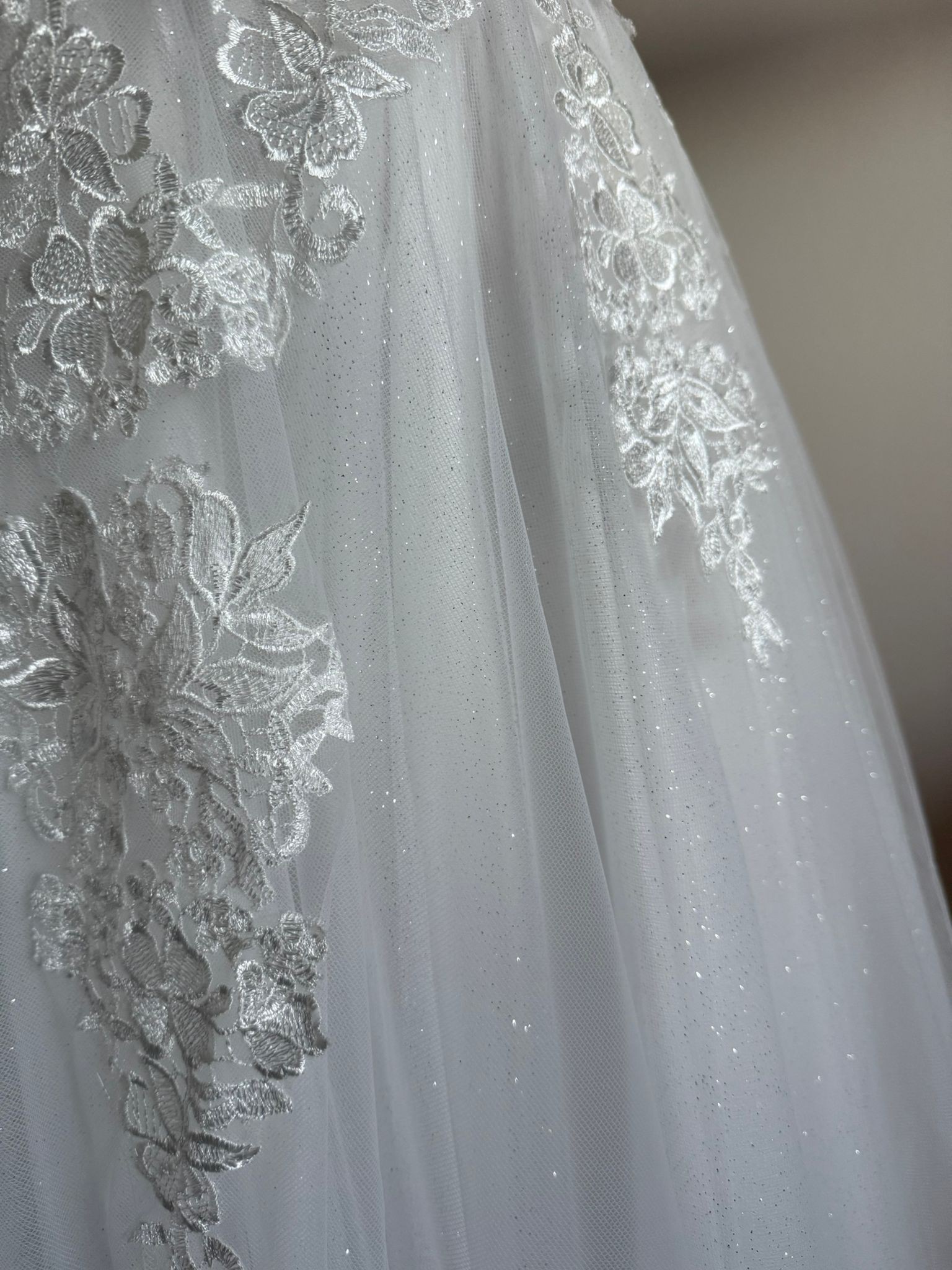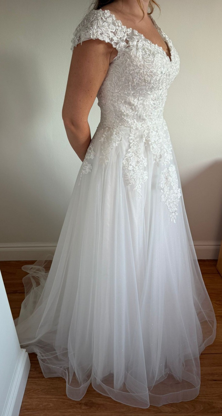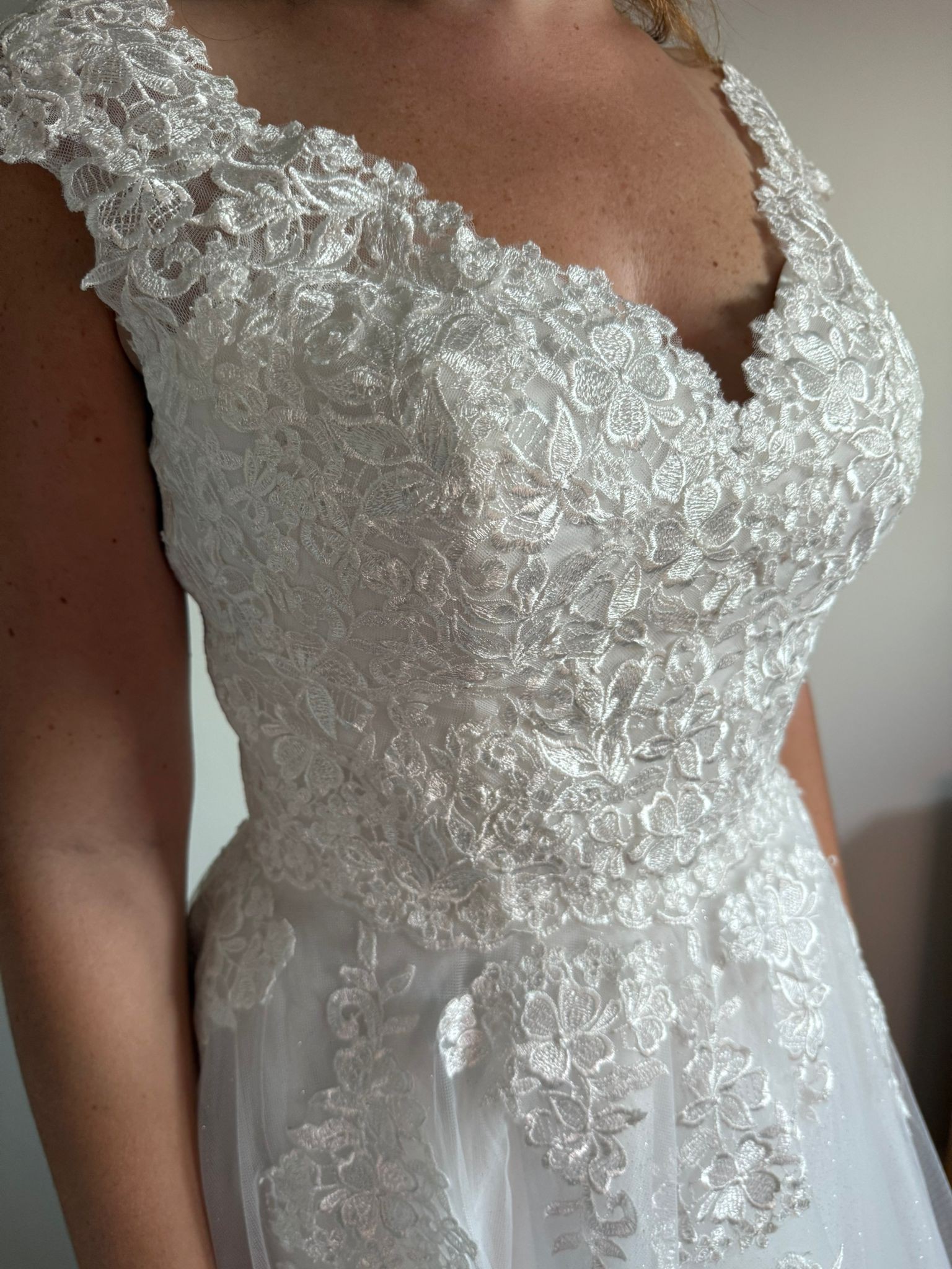 Beautiful glittery A-Line wedding dress from LQ Designs purchased in 2025 with a sweetheart neckline with capped sleeves and lace detailing.