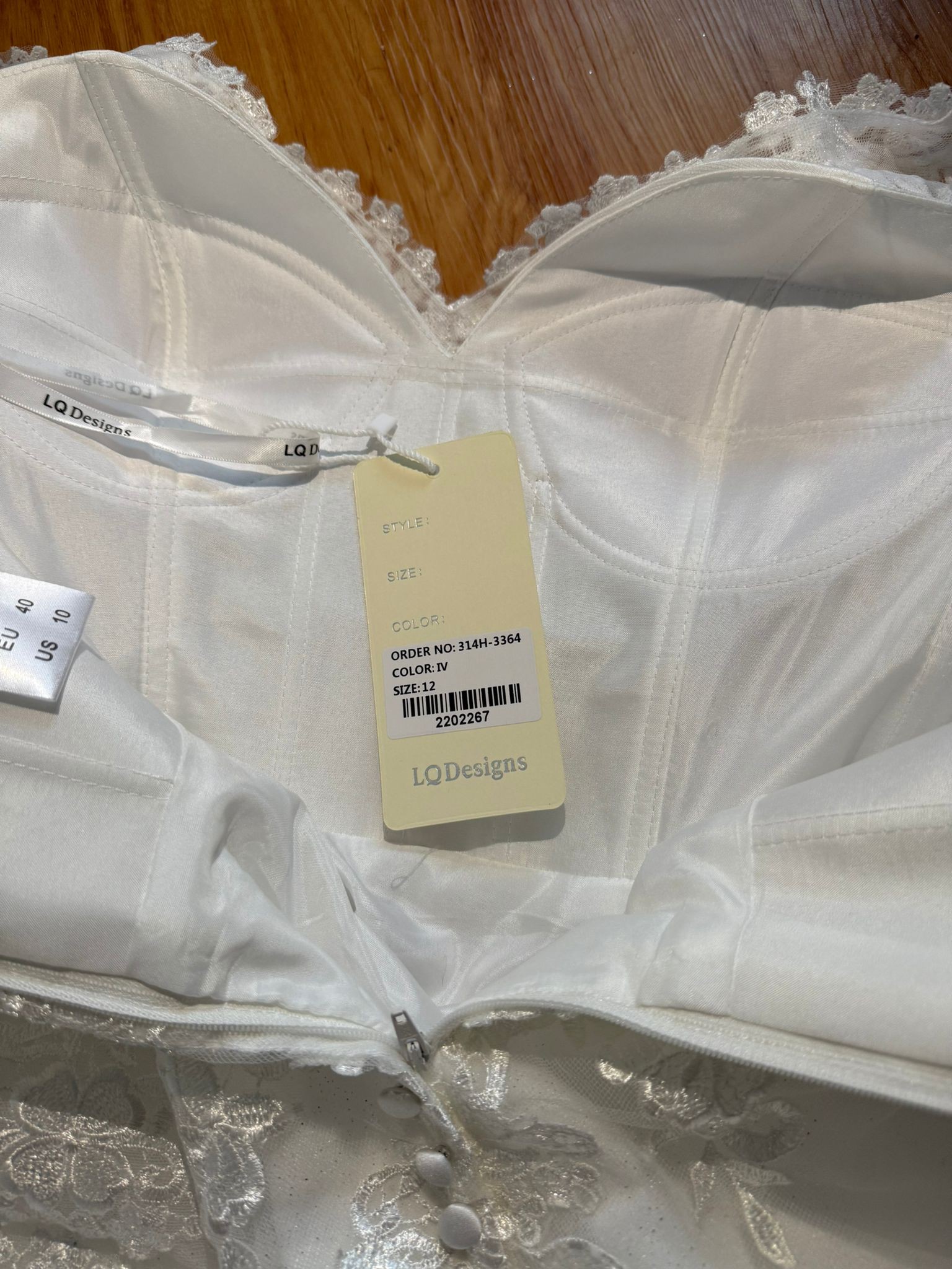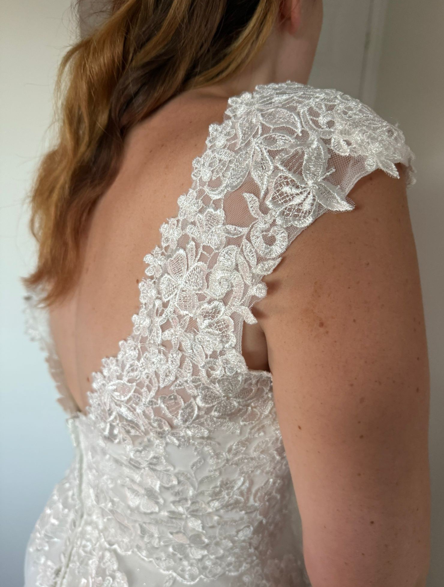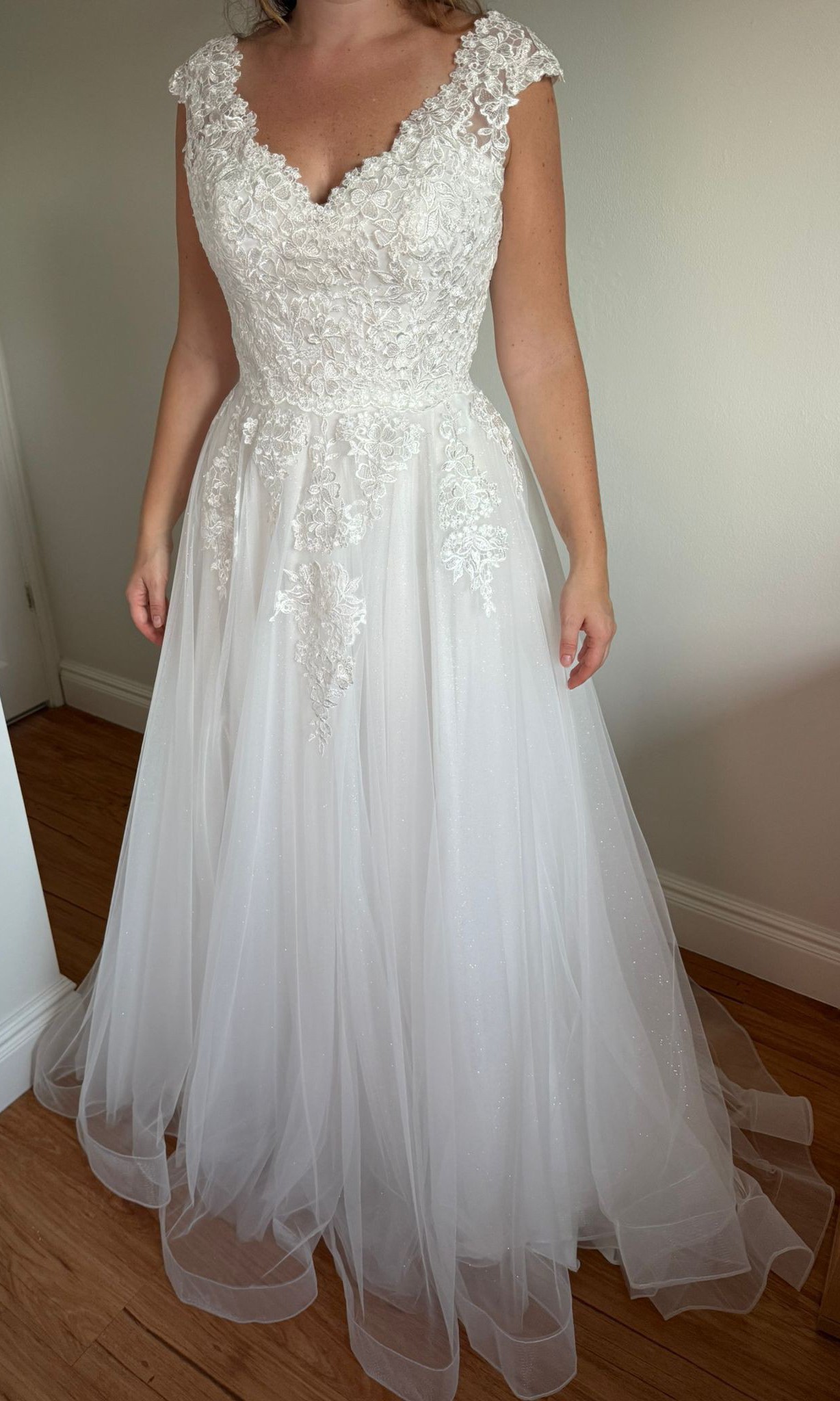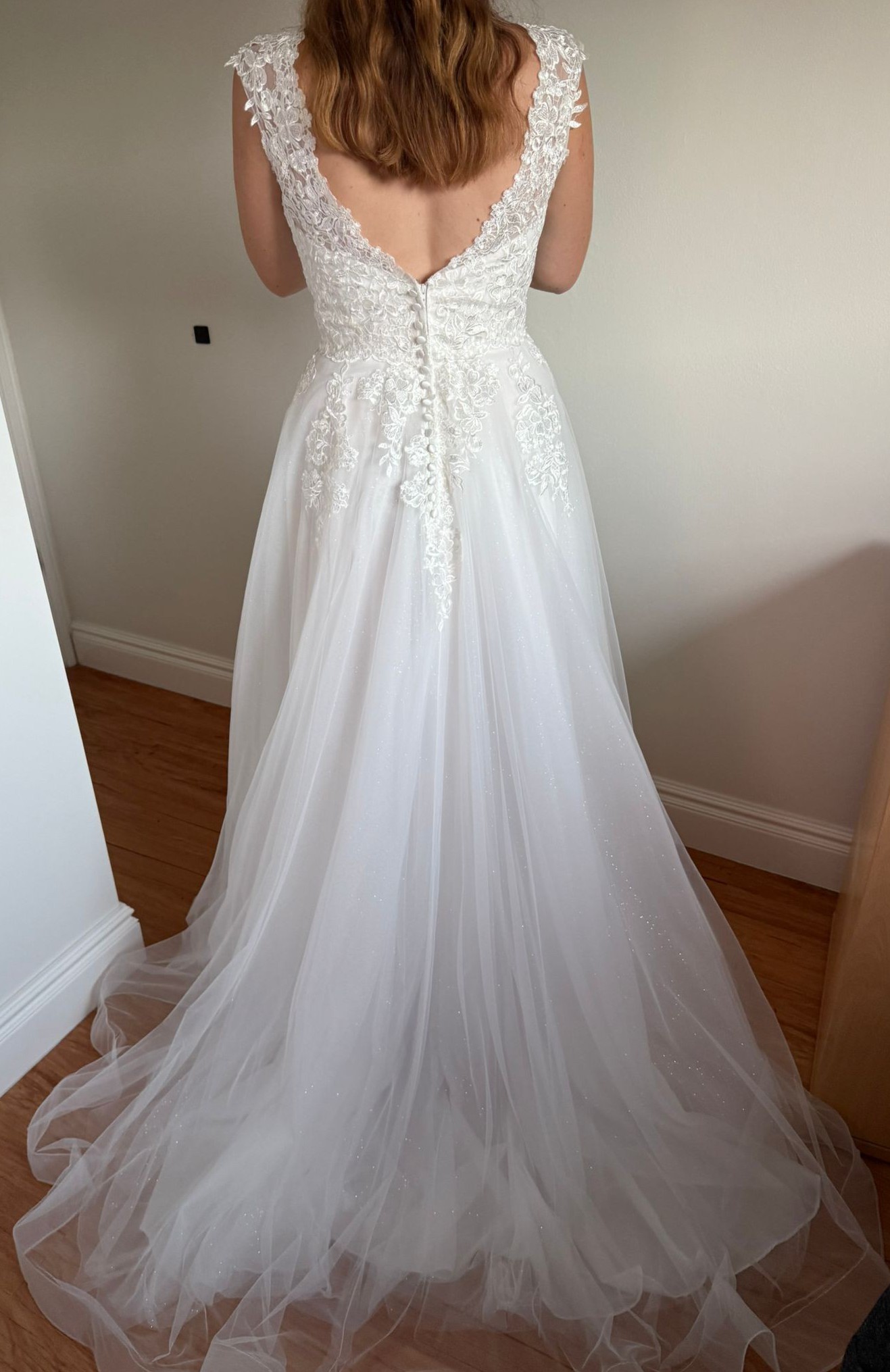 Beautiful glittery A-Line wedding dress from LQ Designs purchased in 2025 with a sweetheart neckline with capped sleeves and lace detailing.