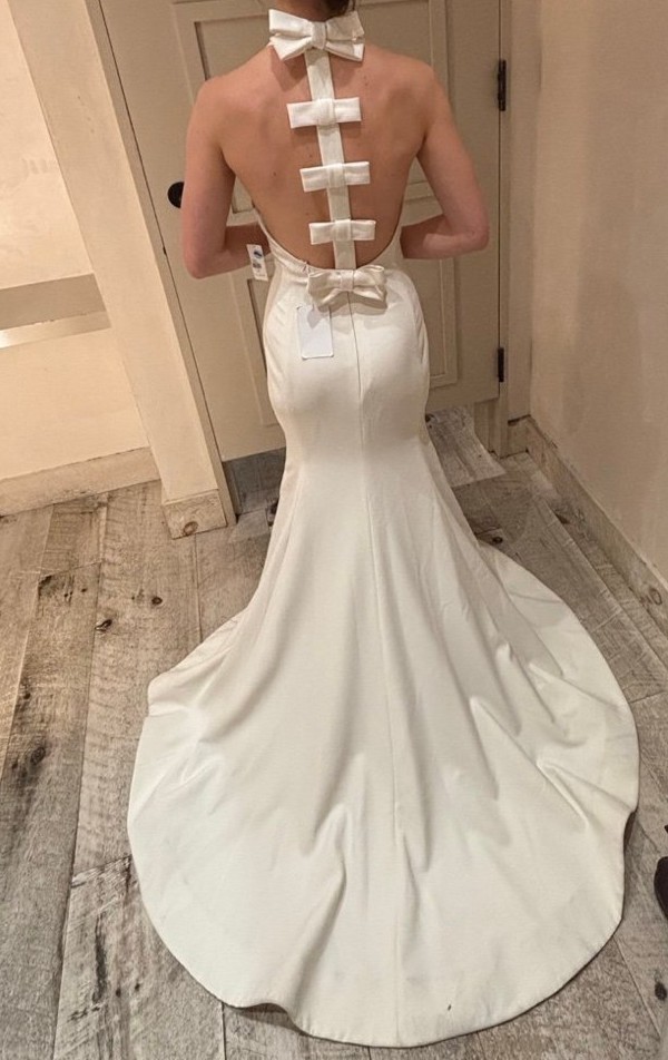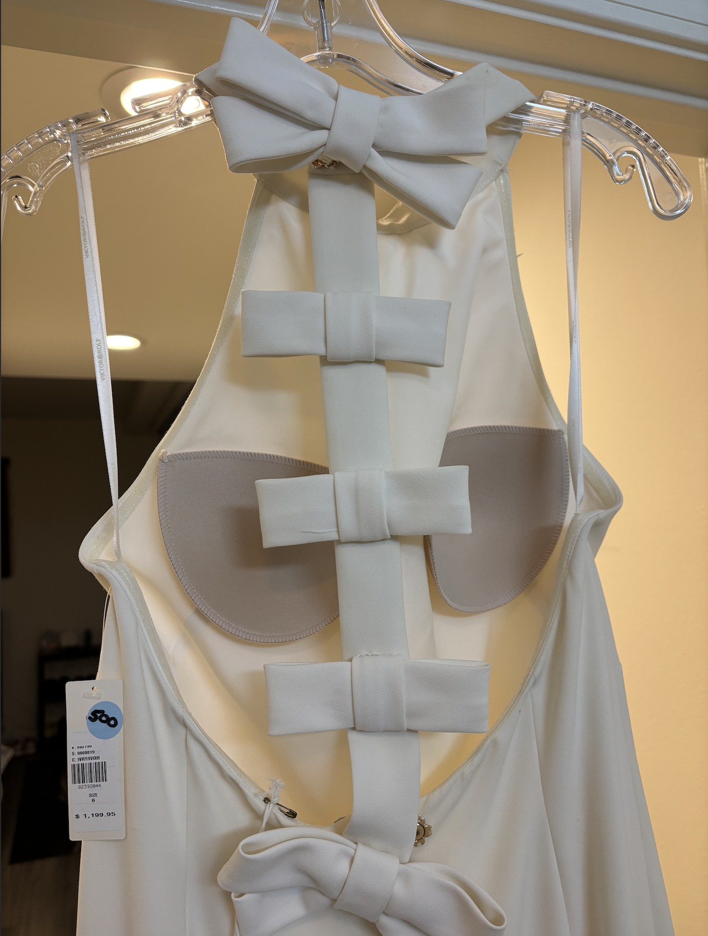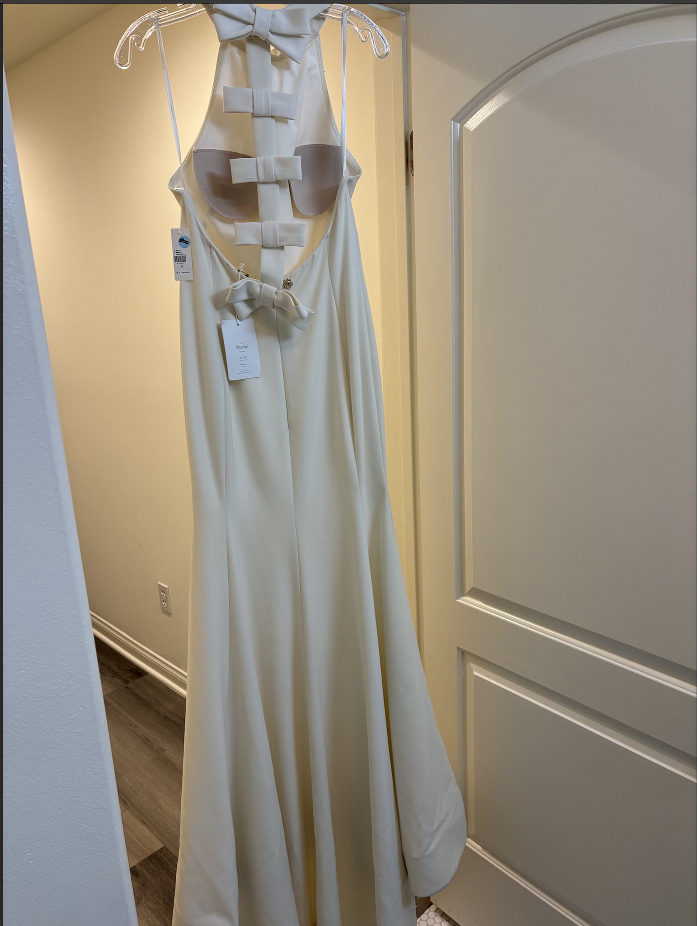 Dress was bought from the Anthropology Sample Sale. Dress was only worn for try ons. I never wore the dress and decided to sell it because too big for me. Original tags still on. High neckline with detachable bow details that snap on. Invisible back zipper and clasps.