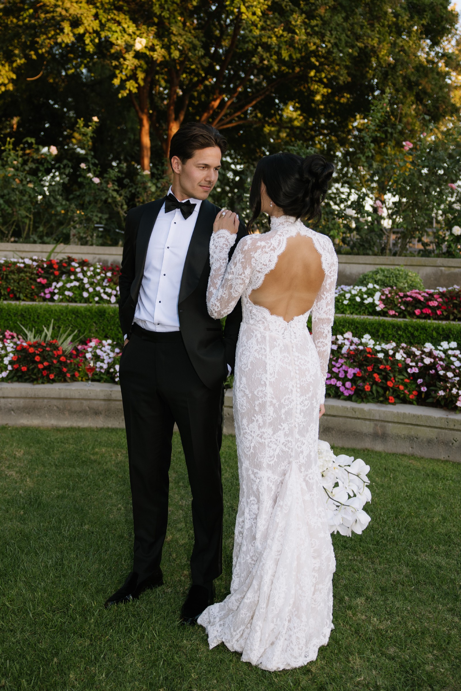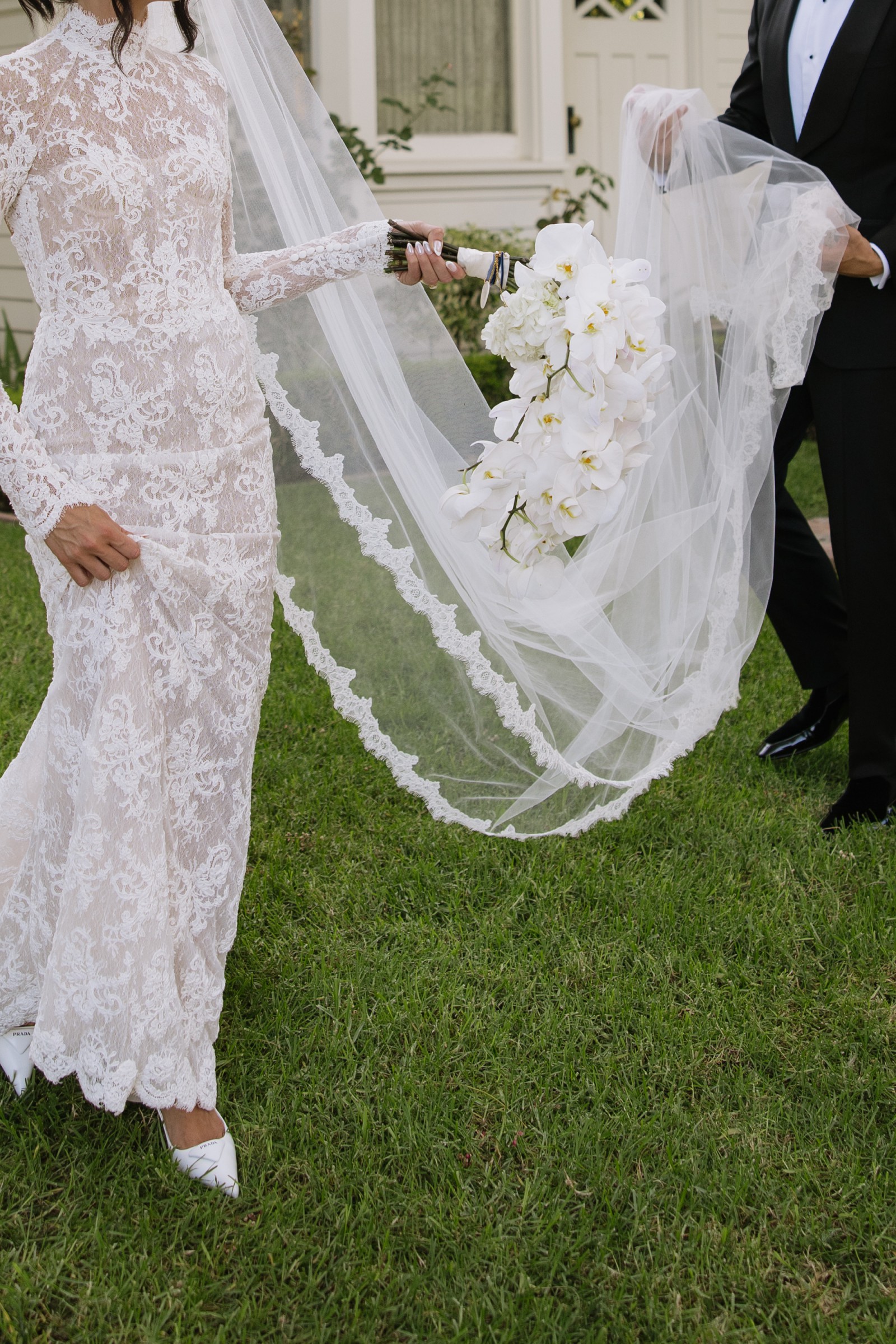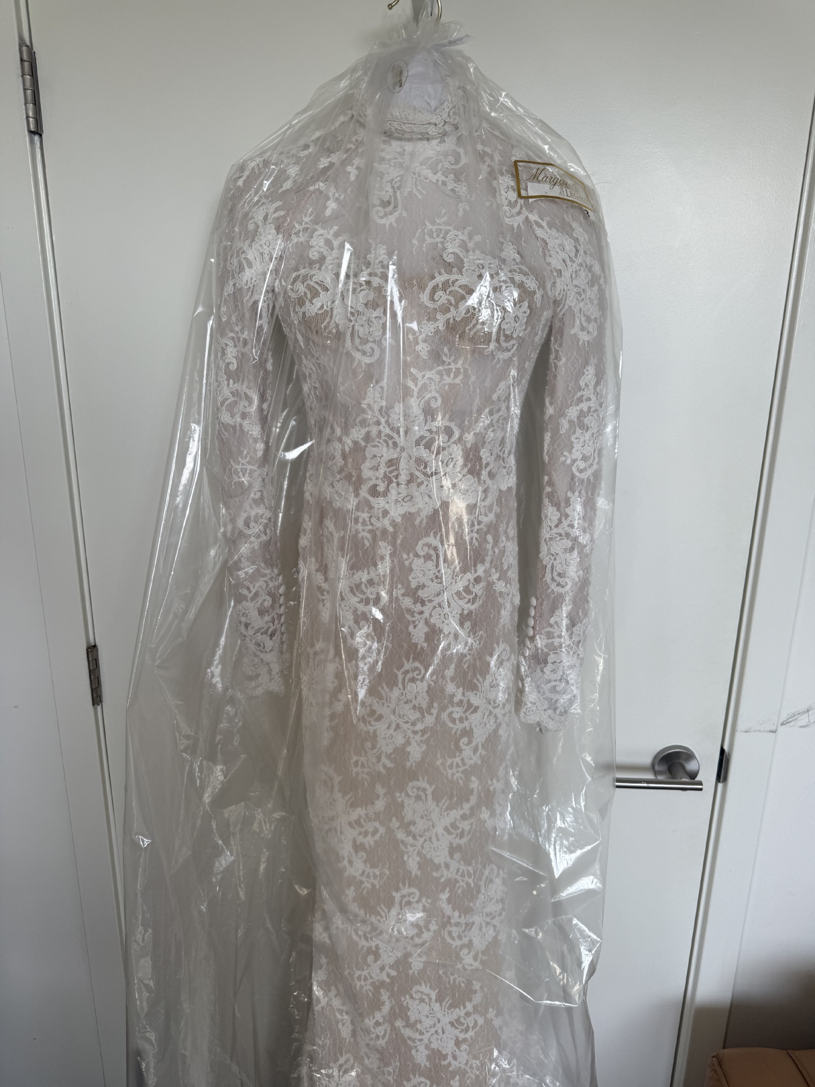 The dress was made with the finest french lace - you'll be wearing lace from head to toe. Beautiful open back and button details on the neck, lower back, and sleeves. This dress is truly magical. The dress is sheer - it has a nude body suit built in so you don't have to worry about wearing a slip underneath. The perfect balance of elegant and chic.