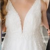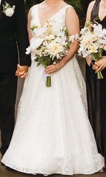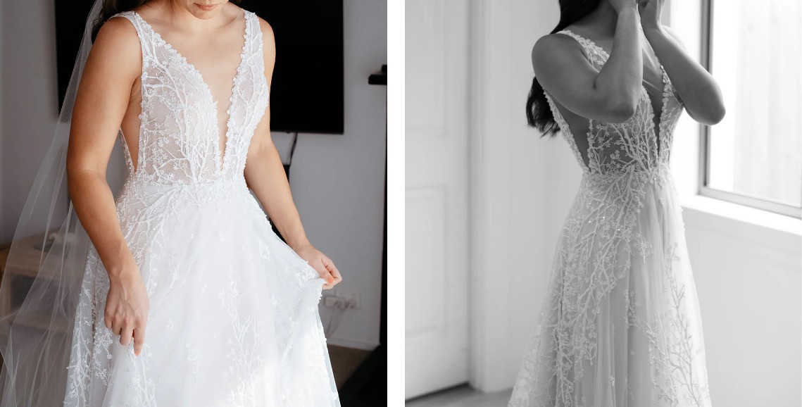 The dress features intricate vine lace, delicate beading, and soft sequins that shimmer beautifully in the light. The plunging V-neckline and open back create a flattering, feminine shape, while the lightweight A-line skirt and soft flowing train move effortlessly — perfect for dancing, walking down the aisle, or capturing those dreamy sunset photos.