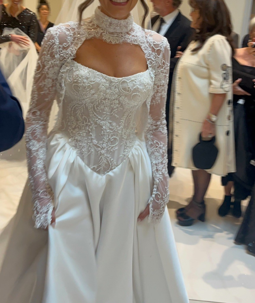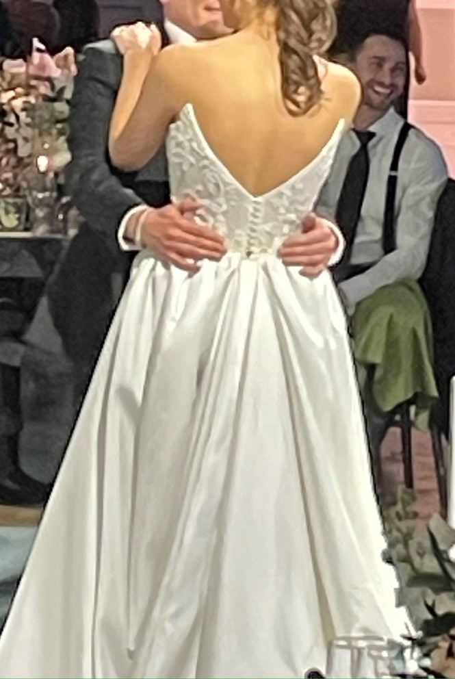 This dress is a size 2 and pure white, making it ideal for any wedding theme or setting. Wearing this gown made me feel as if I were floating on air and I hope it brings the same joy to its next owner. Don’t miss the chance to make your wedding day unforgettable in this beautiful gown!