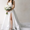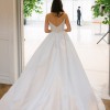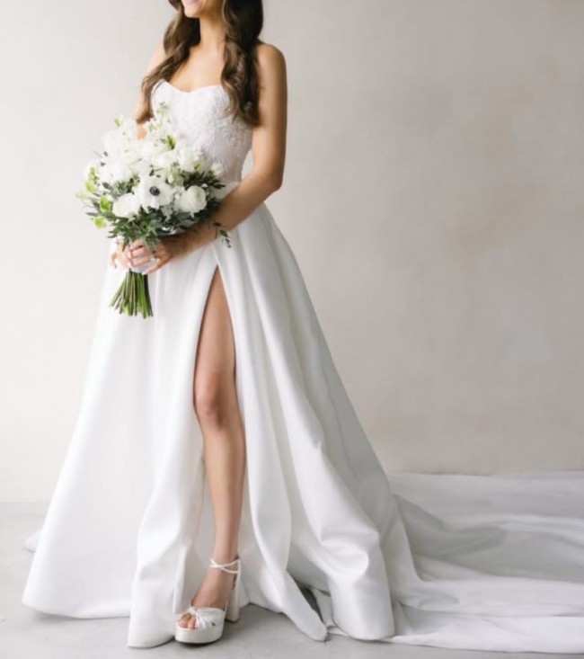 The strapless design offers timeless beauty, while the high slit adds a modern twist, allowing for ease of movement and a touch of allure. As you glide down the aisle in its floor-length elegance, the intricate beading glistens in the light, making every moment feel magical. The mid-back finish keeps it classic yet keeps the focus on the stunning neckline and detail at the top.