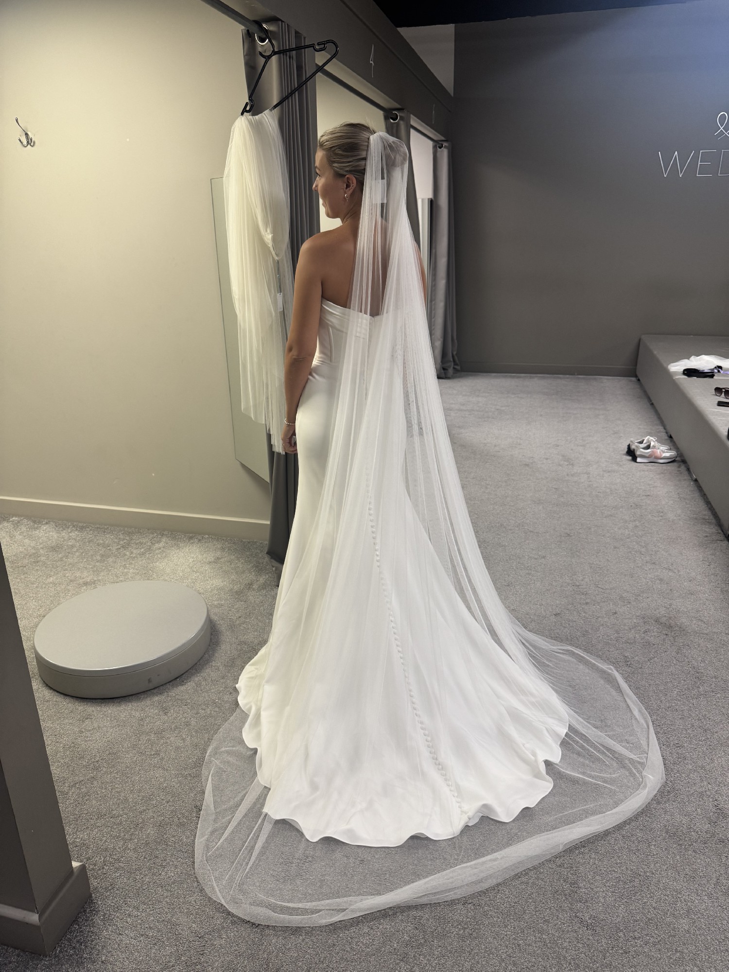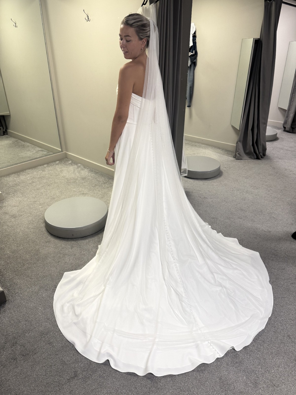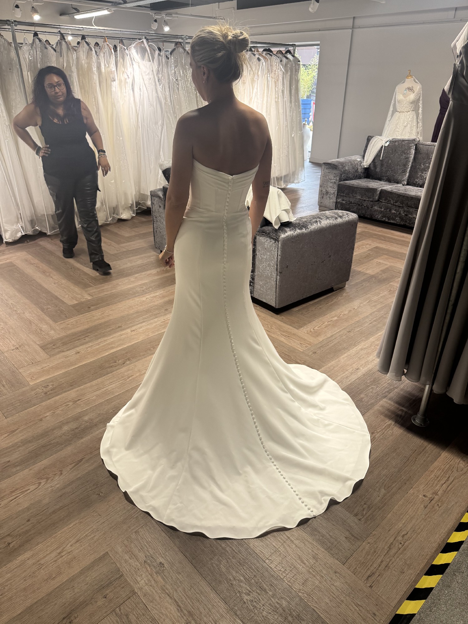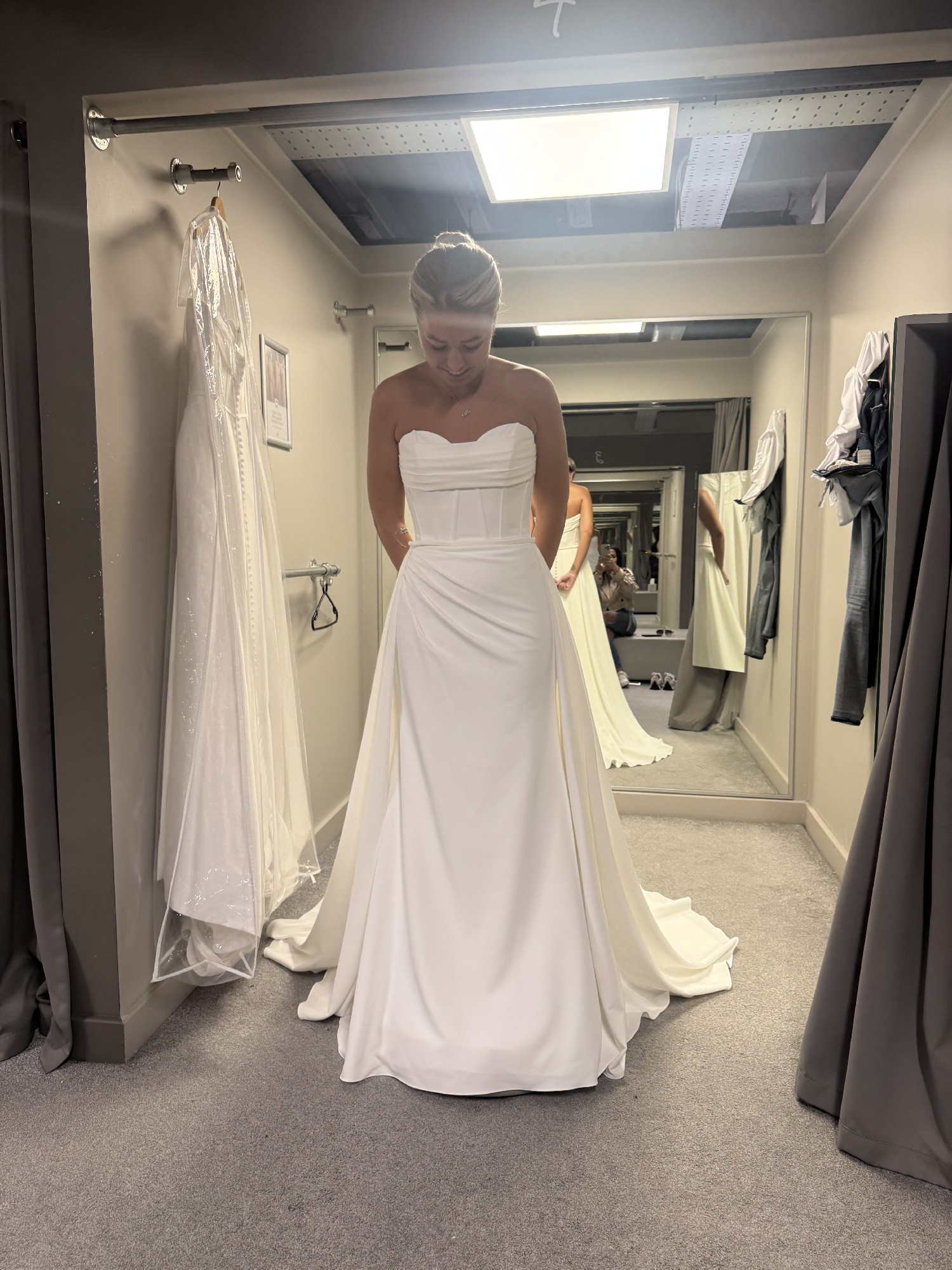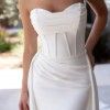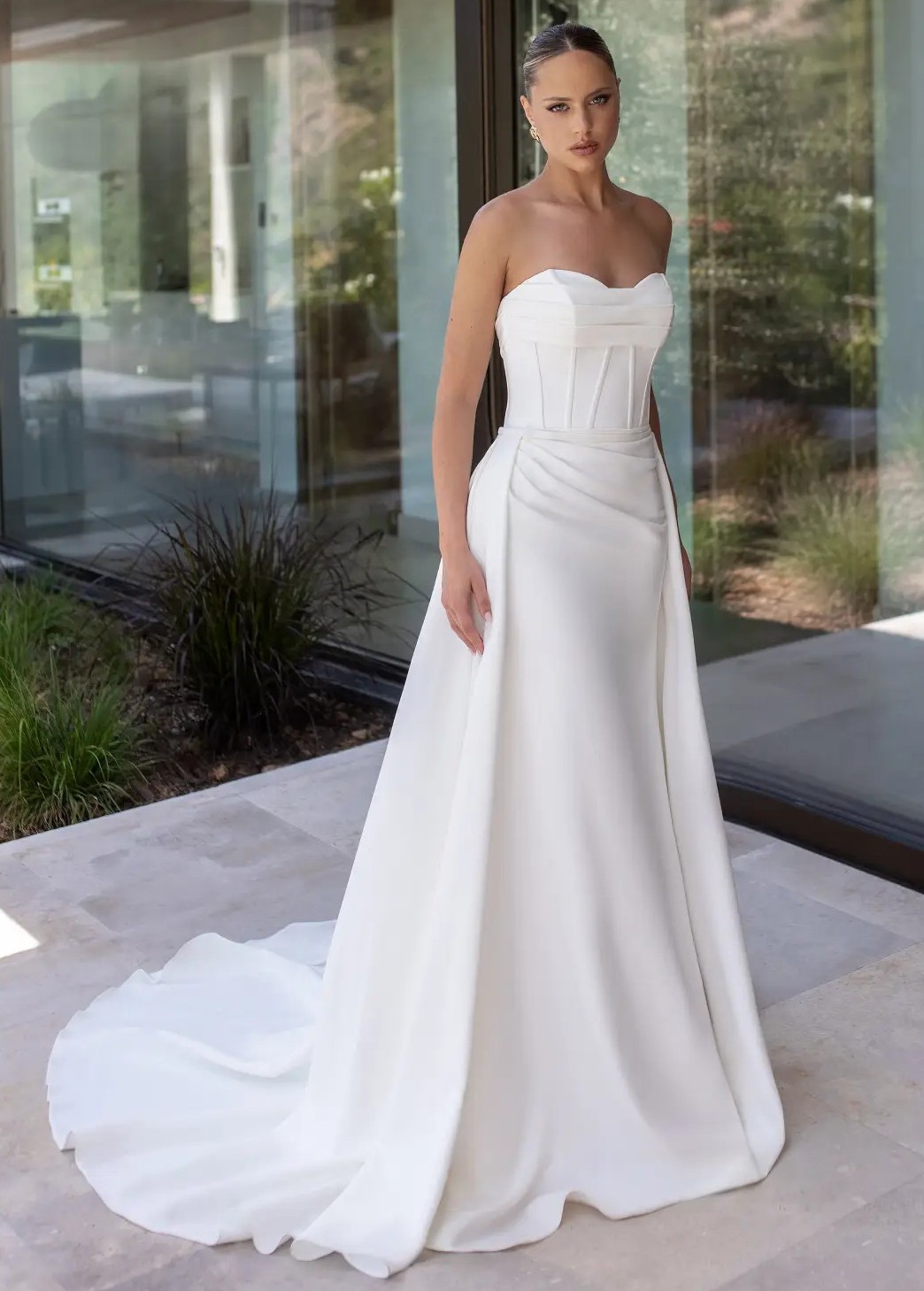 Santal is a figure hugging crepe sheath with a corset-inspired bodice featuring exposed boning. The fitted skirt with delicate tummy draping is paired with a detachable overskirt, offering a versatile and dramatic touch of elegance.