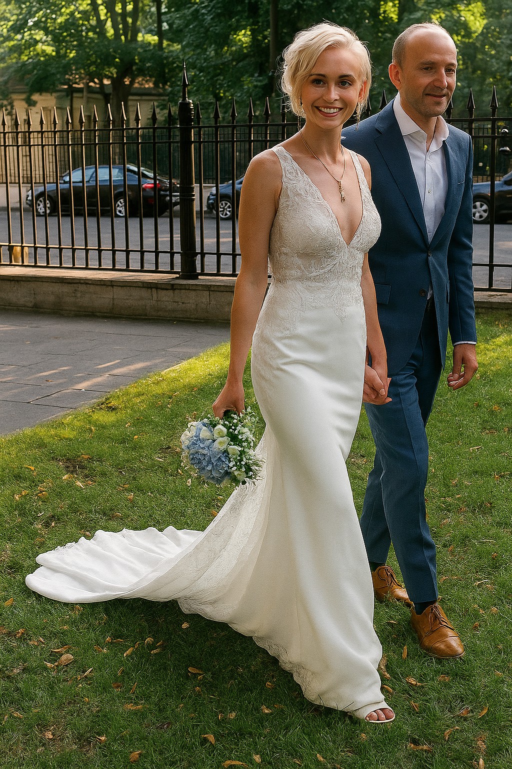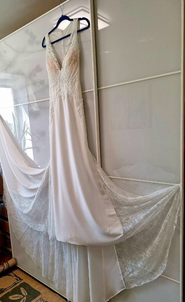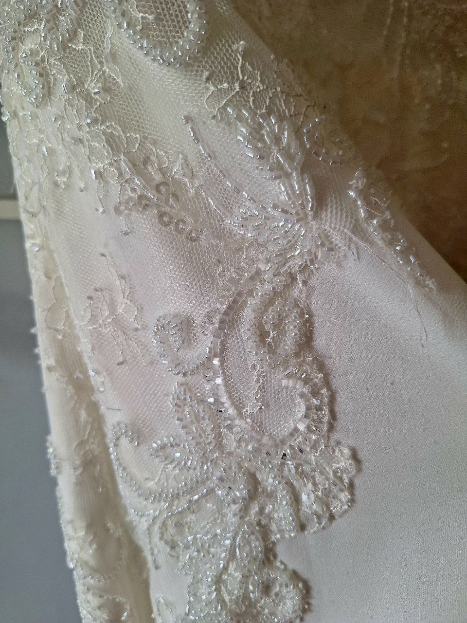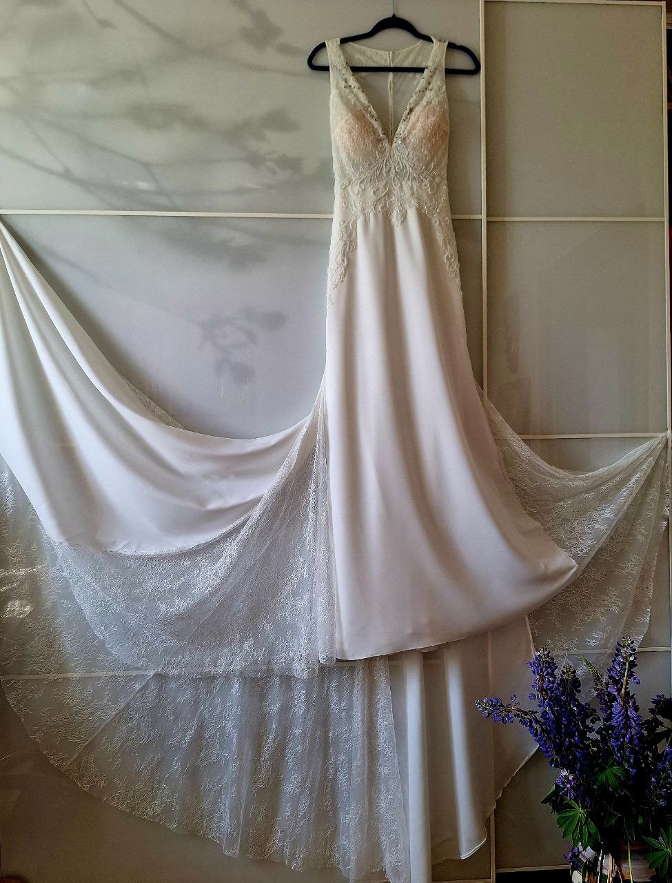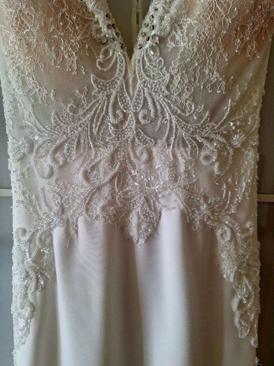 I wore this dress for only two hours during a private celebration — it’s in perfect, like-new condition, professionally cleaned and carefully stored. Every detail reflects the superb craftsmanship that Rosa Clará is known for: refined lace, intricate hand embroidery, and the softest materials that feel extraordinary against the skin.