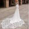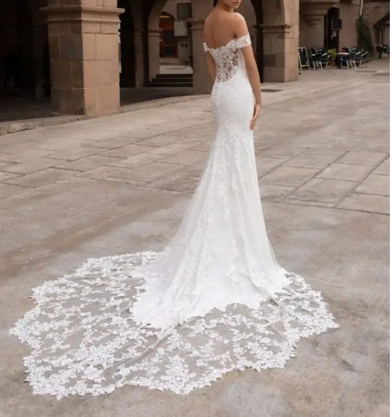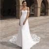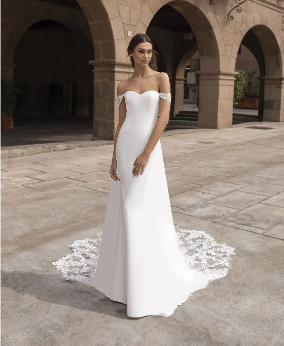 The Pronovias Bridal Syrinx, strapless crepe wedding gown, off-the-shoulder bridal dress, floral lace wedding train, white petal bridal gown