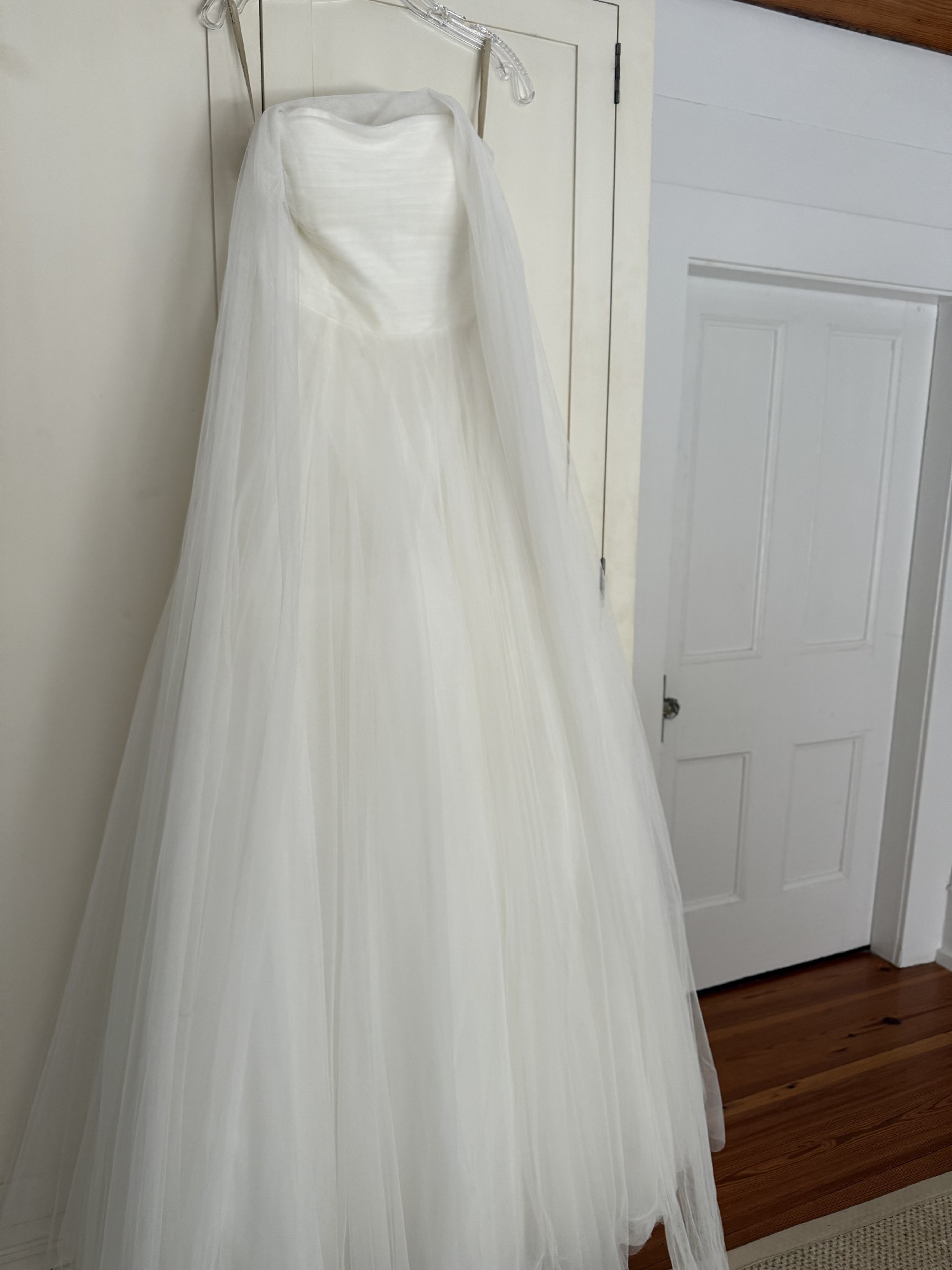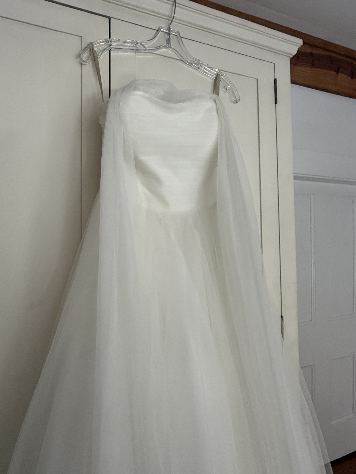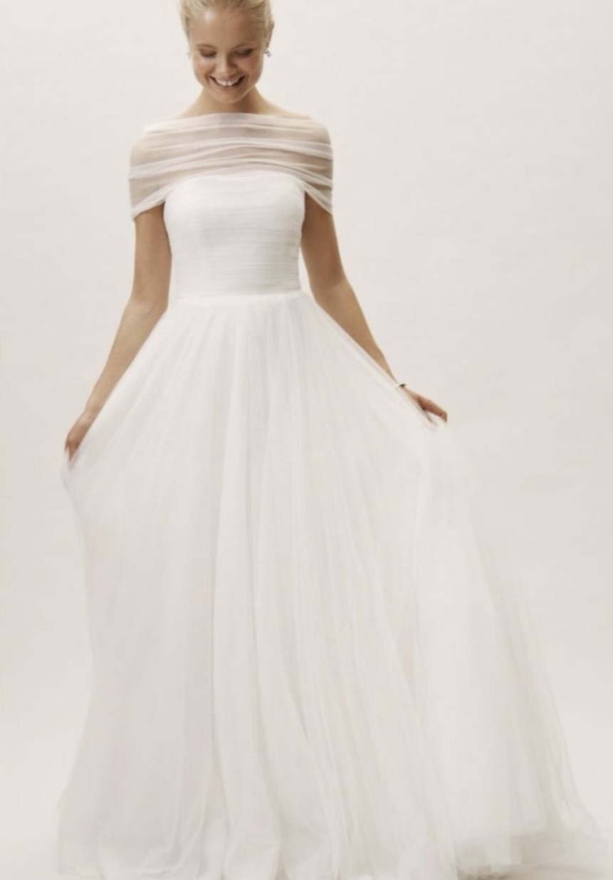 Only worn for about 20 minutes for pictures. Stunning convertible ballgown. Crafted from over 45 yards of tulle, it somehow manages to be incredibly lightweight and boasts over 16 ways to style its neckline; a few of our favorites include strapless, off-the-shoulder, and bateau. (You can look on YouTube to see how to tie the shawl part).• From the Jenny by Jenny Yoo collection