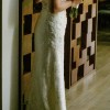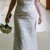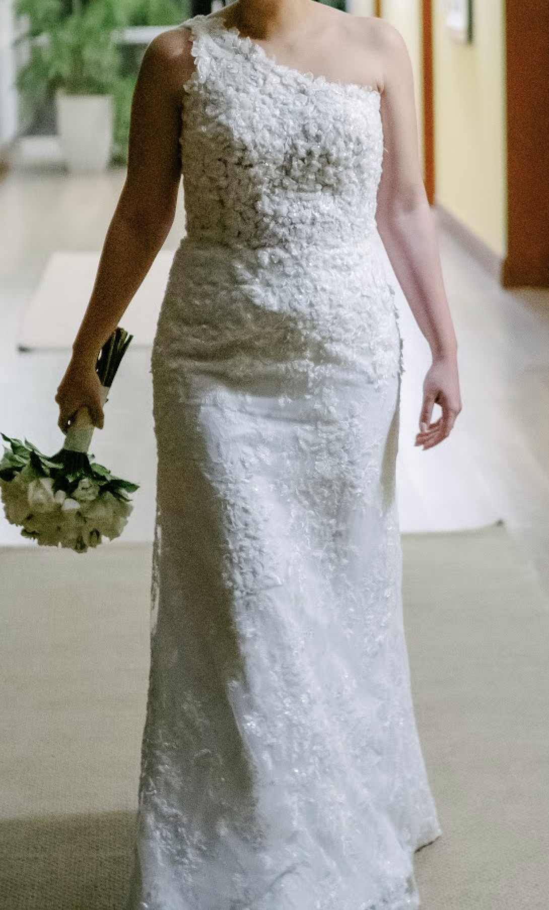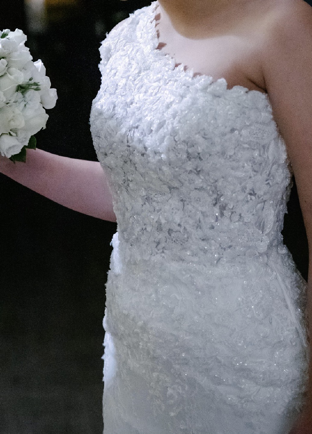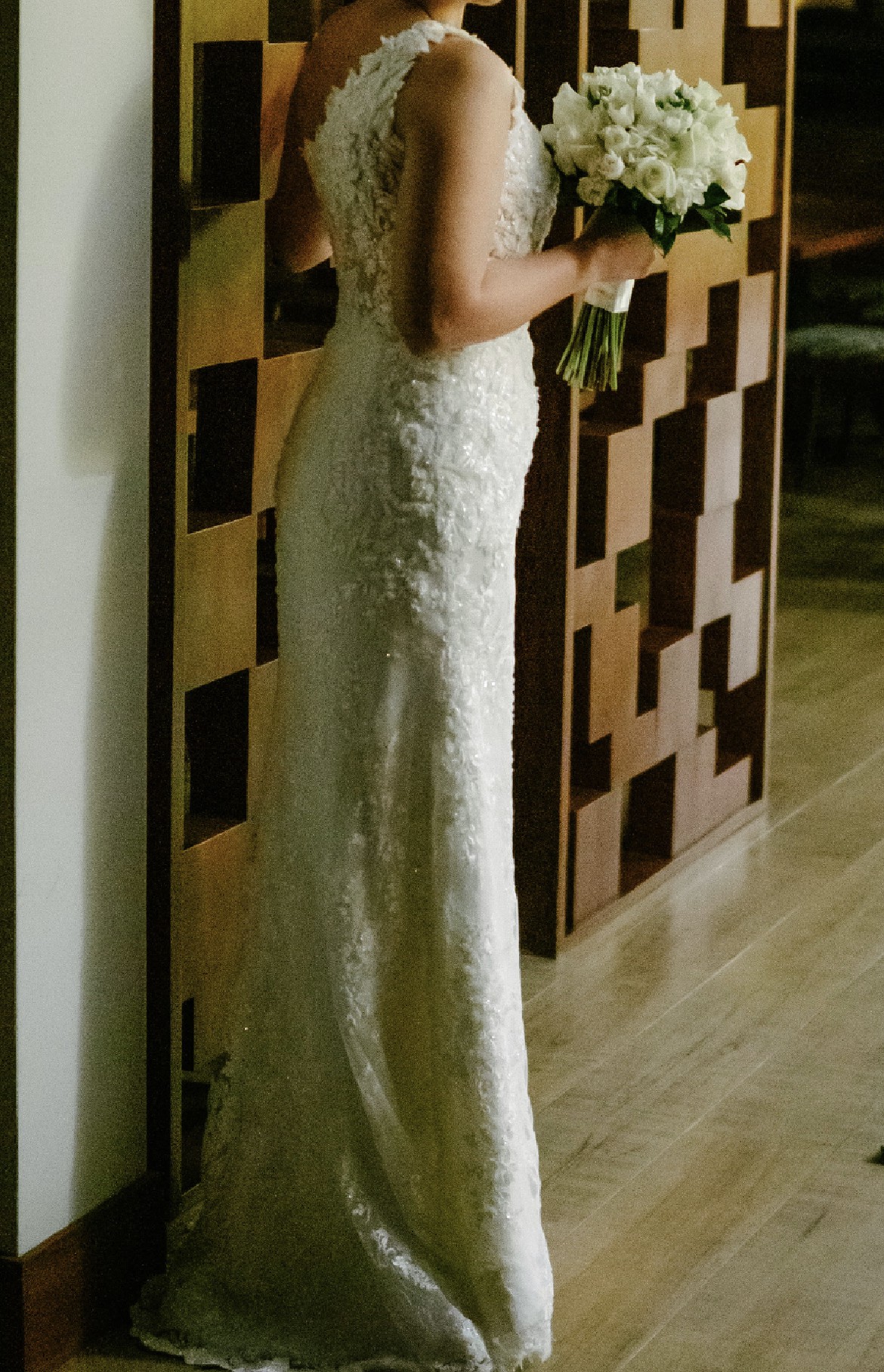 The back is slightly sheer with beaded details for a refined, modern look. The silhouette is straight with a gentle flare toward the bottom — a subtle mermaid shape. It also has a small train that doesn’t need to be lifted, so it’s easy and comfortable to wear.