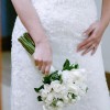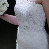 This custom-made wedding dress is made from fine lace and fully hand-embroidered with beading throughout. The beadwork adds a soft, elegant shimmer that looks beautiful in any light.