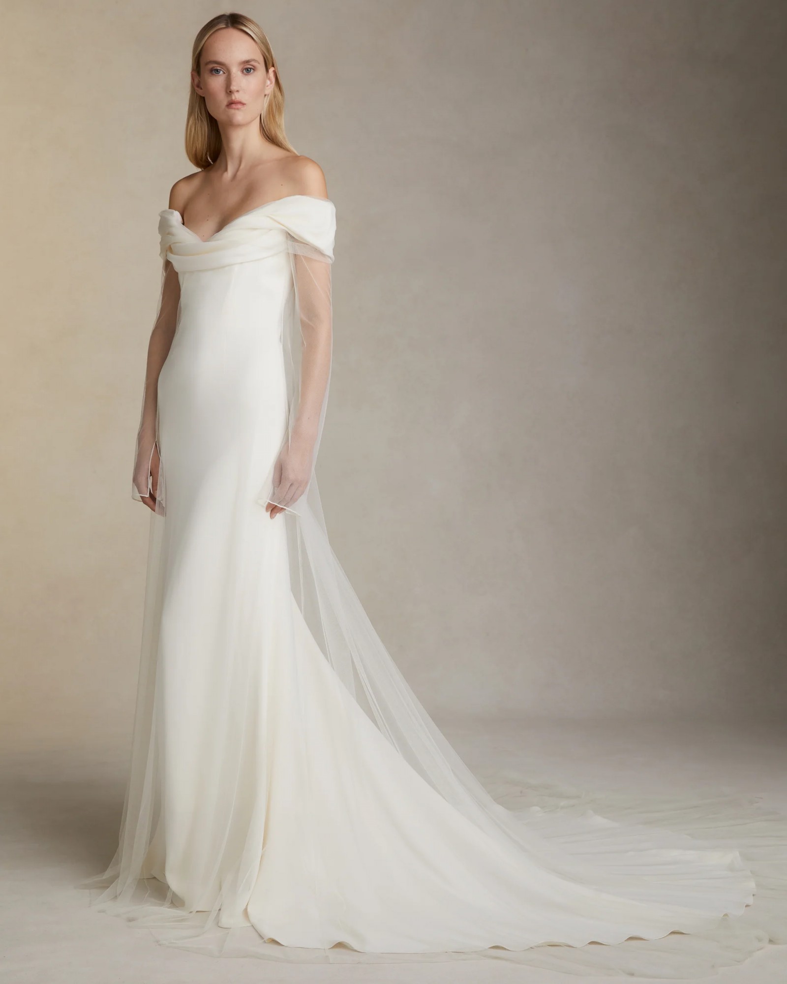 Effortlessly beautiful and classic Danielle Frankel 'Eloise' gown that is universally flattering--a dream dress! Stretch cady off the shoulder gown with draped bodice detail. Soft tulle overlay extends from neckline. Invisible zip closure at center back.