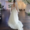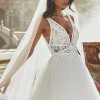 The stunning V-back adds an alluring element, drawing the eye and creating an unforgettable look as you walk down the aisle. The floor-length hem cascades effortlessly, creating a breathtaking silhouette that will leave everyone in awe. Adorned with delicate embroidery, this dress captures the essence of timeless beauty, making it a true statement piece for any bride.