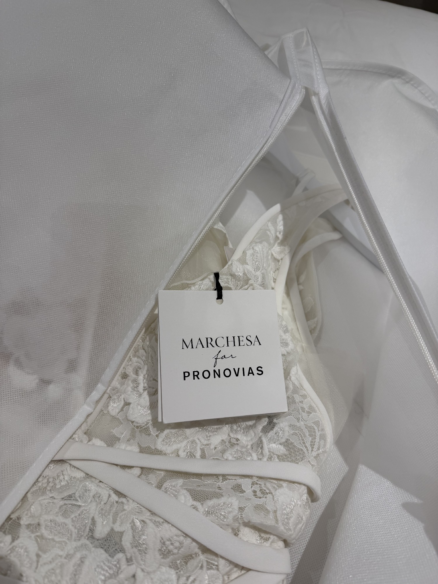 This exquisite Marisol wedding dress from Marchesa for Pronovias is the epitome of romance and elegance. Crafted in a graceful A-line silhouette, it flatters every figure while allowing freedom of movement for your special day. The enchanting V-neckline beautifully frames the décolletage, while the sleeveless design ensures a light and airy feel, perfect for a summer celebration or a stylish winter affair.