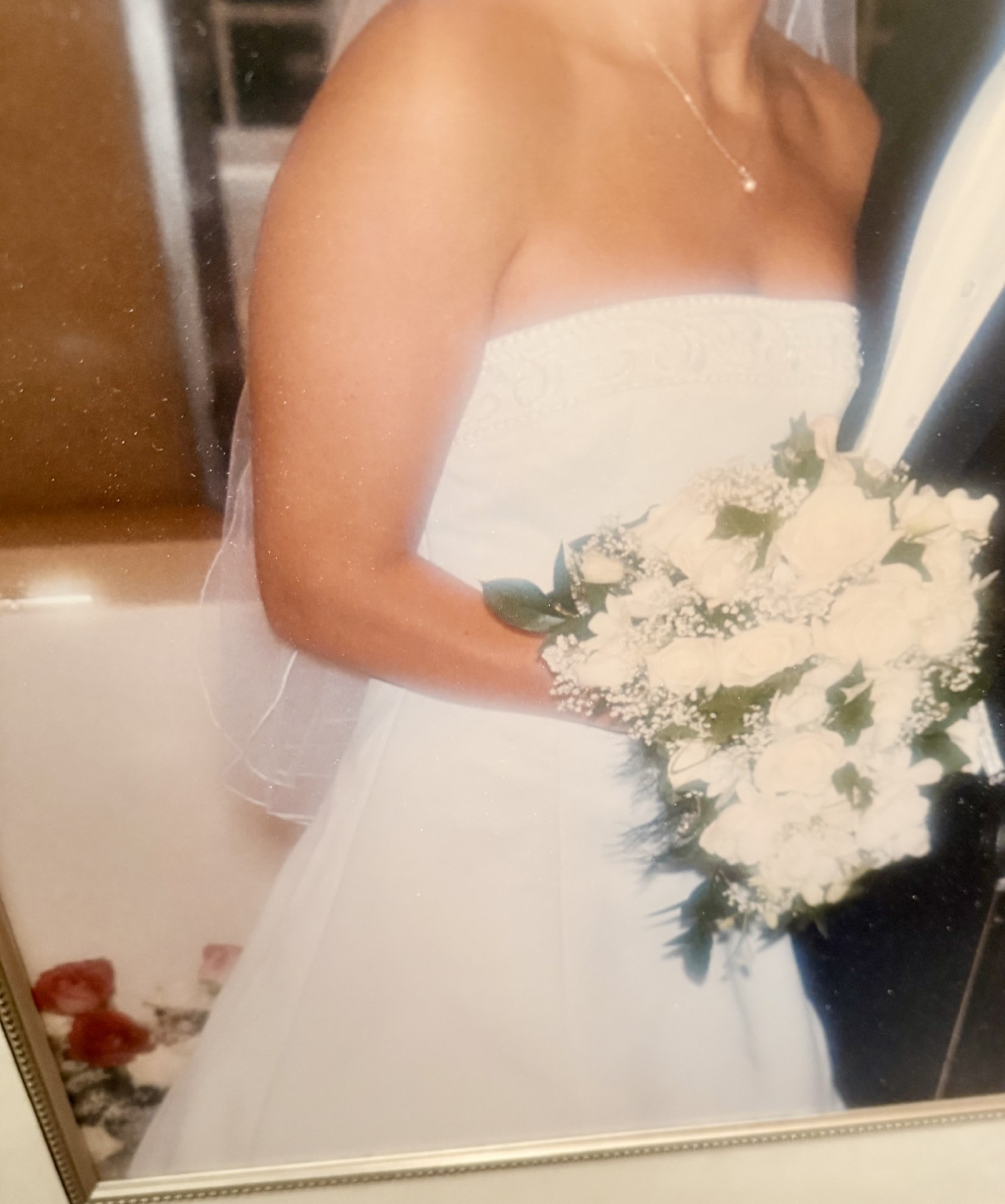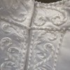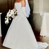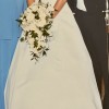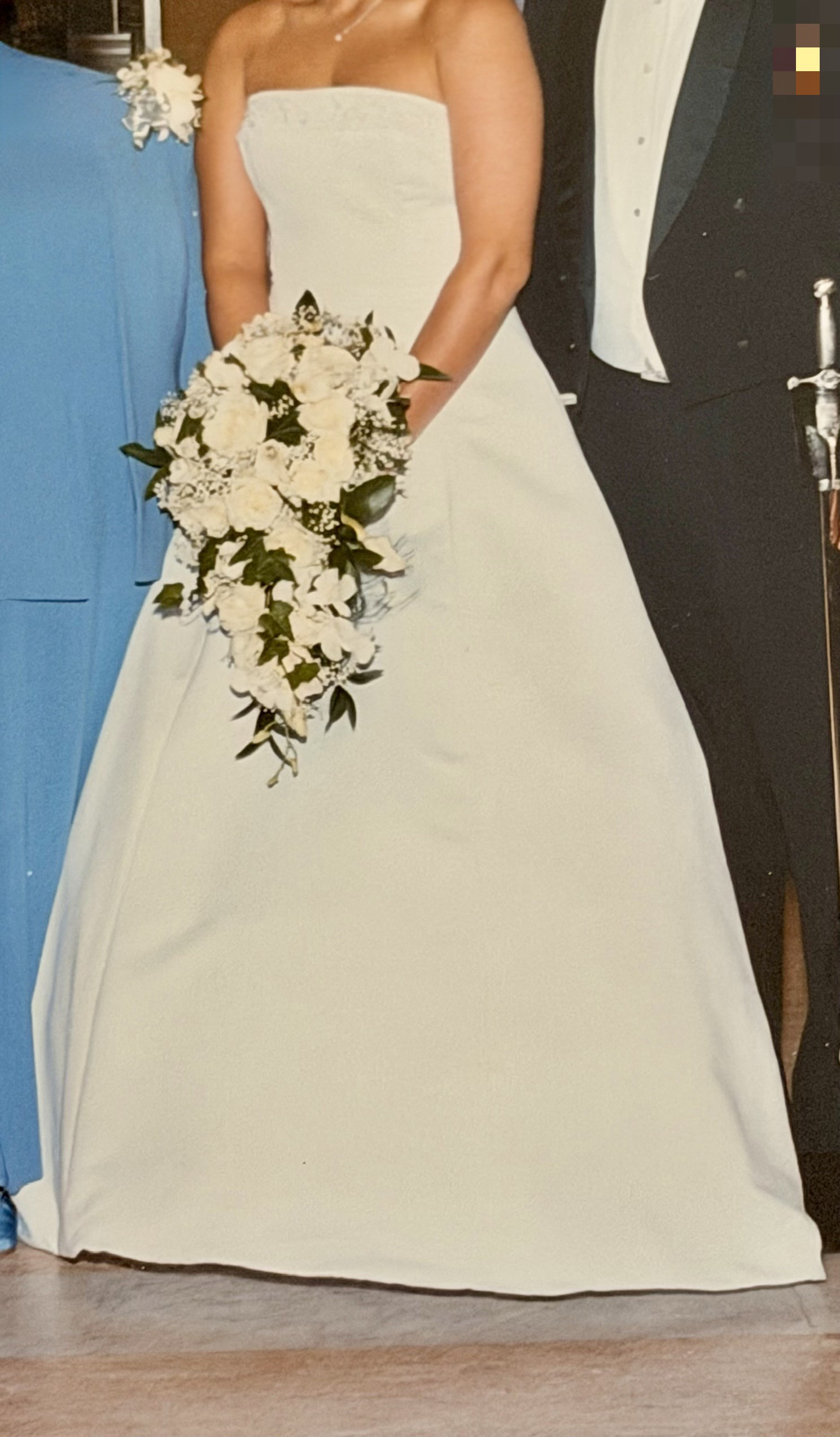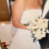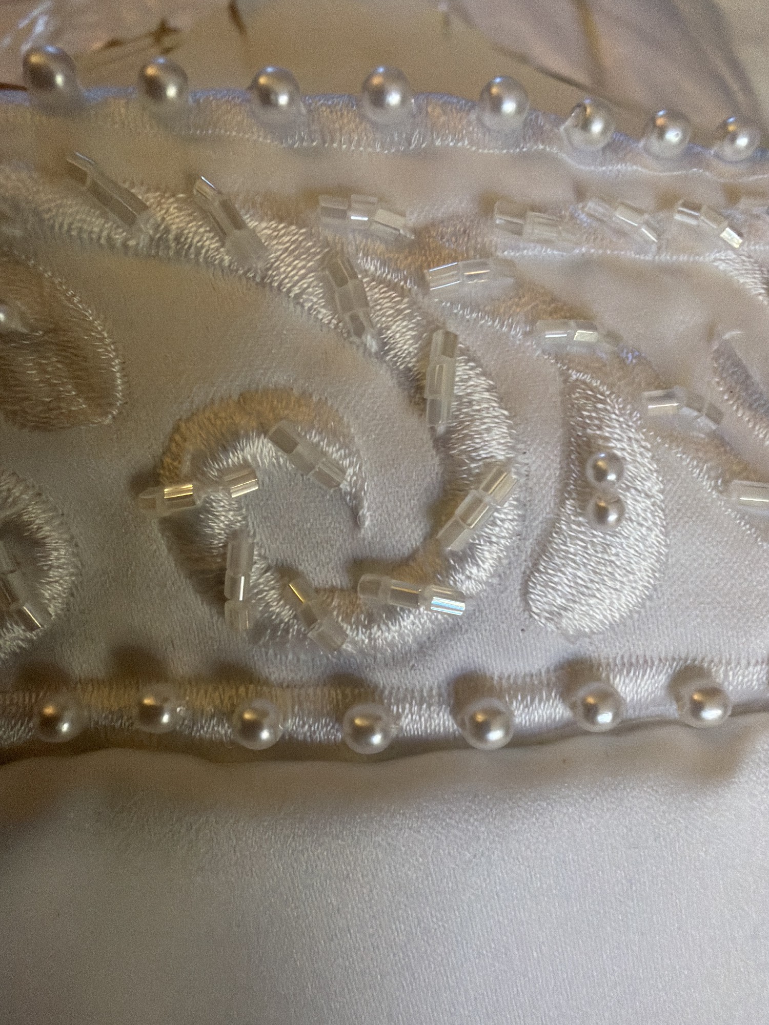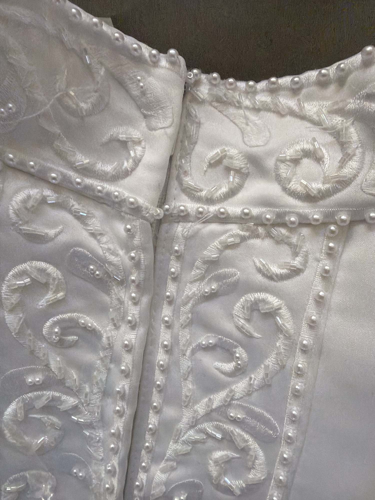 Classic beautiful white dress with beads and flower design across top of chest and down the backside of the dress. Has a matching drape to where along your arms. Classic fit.