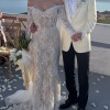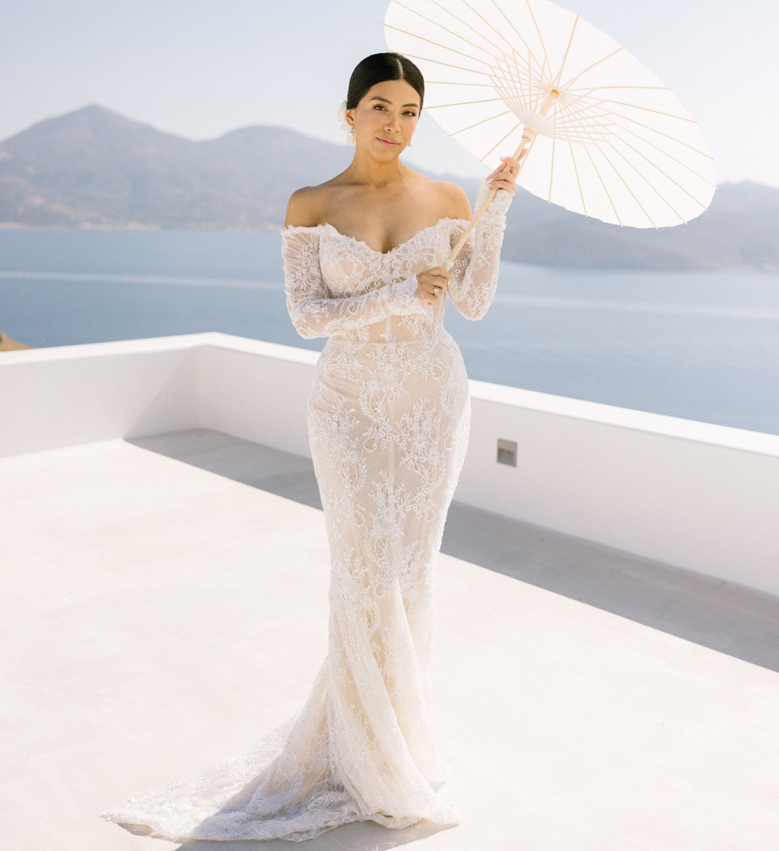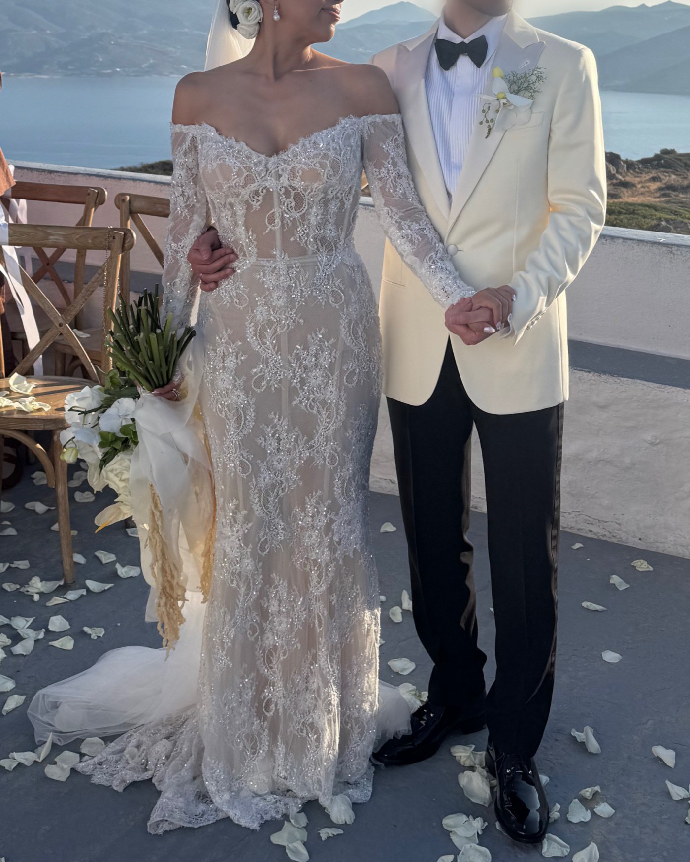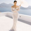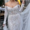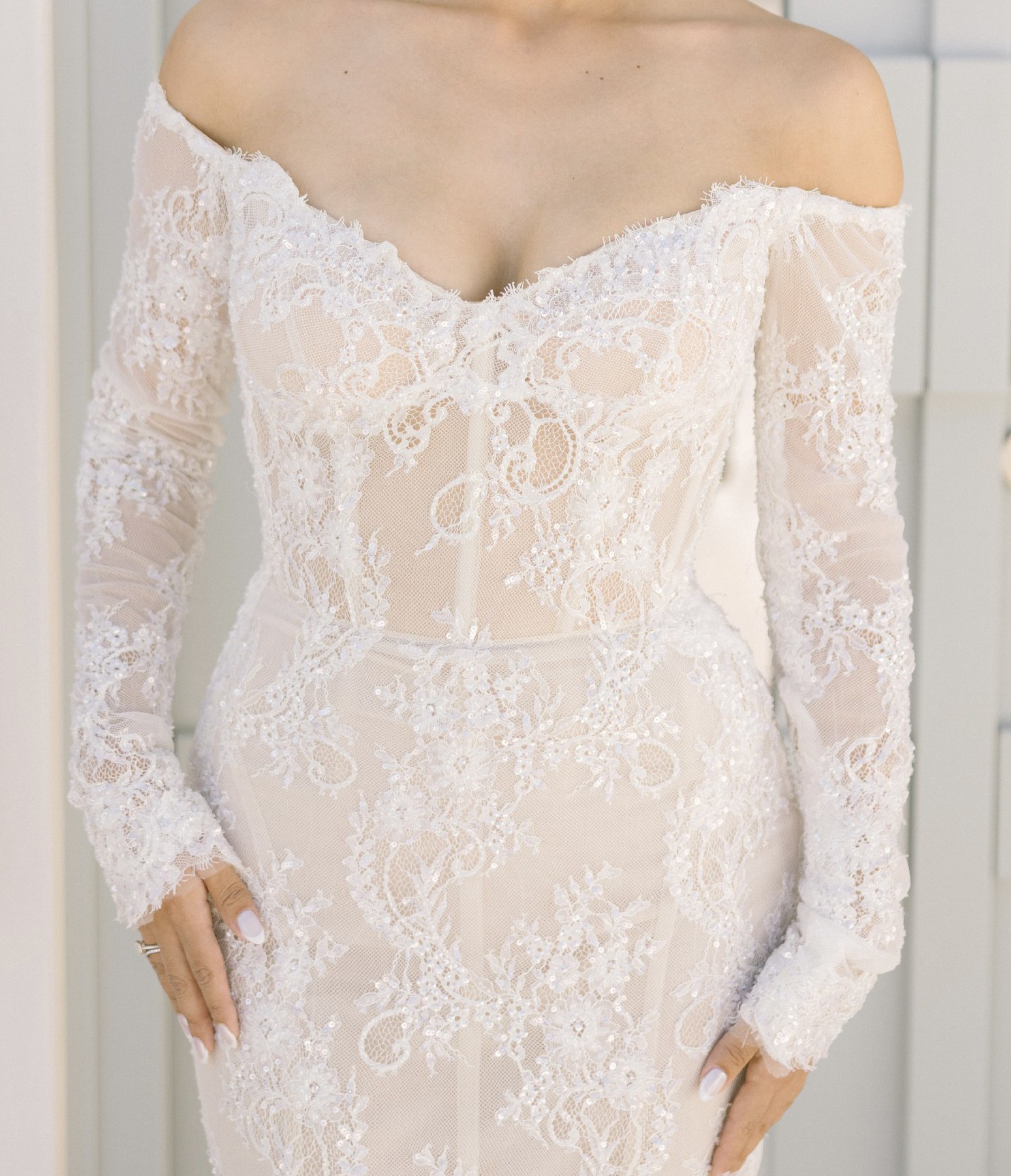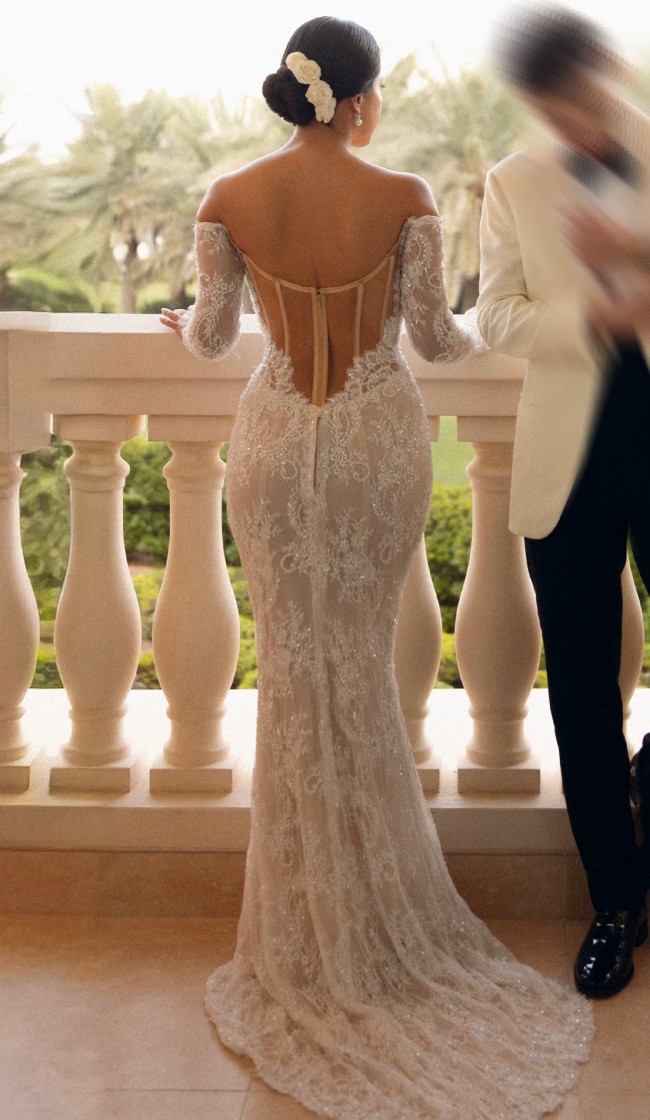 It features a fitted mermaid silhouette and a structured corset bodice with a plunging neckline, long sheer sleeves, and a low illusion back. The mermaid shape and corset design naturally sculpt and flatter the figure, enhancing curves in the most elegant way.