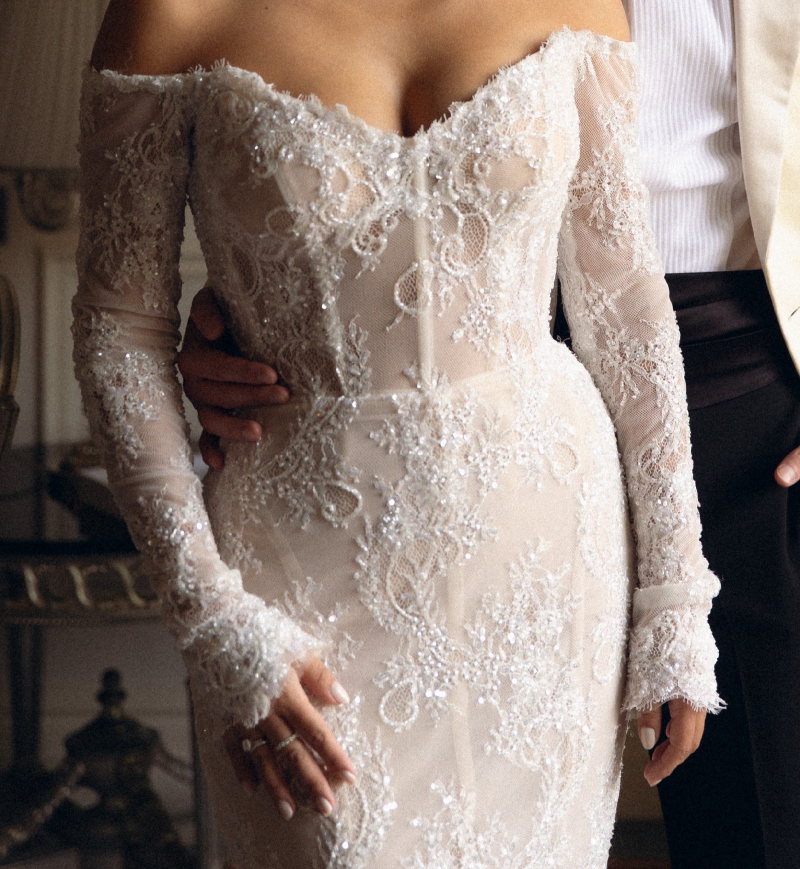 The BERTA Maggiore 24-04 is an exquisite gown from BERTA’s Spring 2024 collection, crafted in ivory beaded lace with delicate embroidery and a soft shimmer.