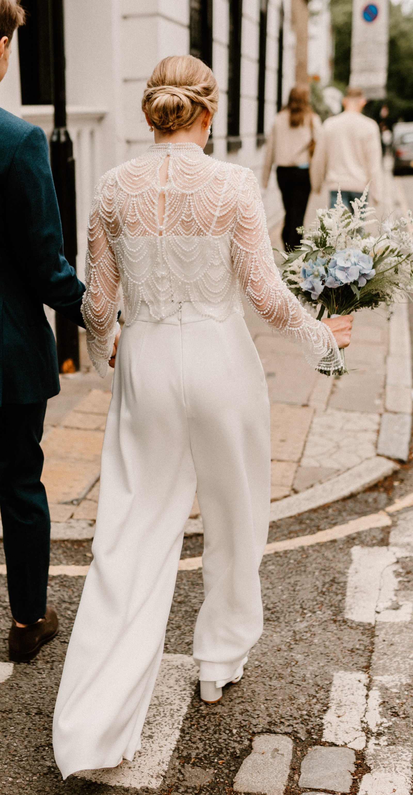 This outfit was a dream to wear: comfortable, flattering, and incredibly special. The beaded pearl topper catches the light beautifully, while the high-waisted wide-leg trousers give a chic, tailored silhouette. It photographed beautifully from every angle and was so easy to move in all day. I would love for someone else to enjoy this look as much as I did.
