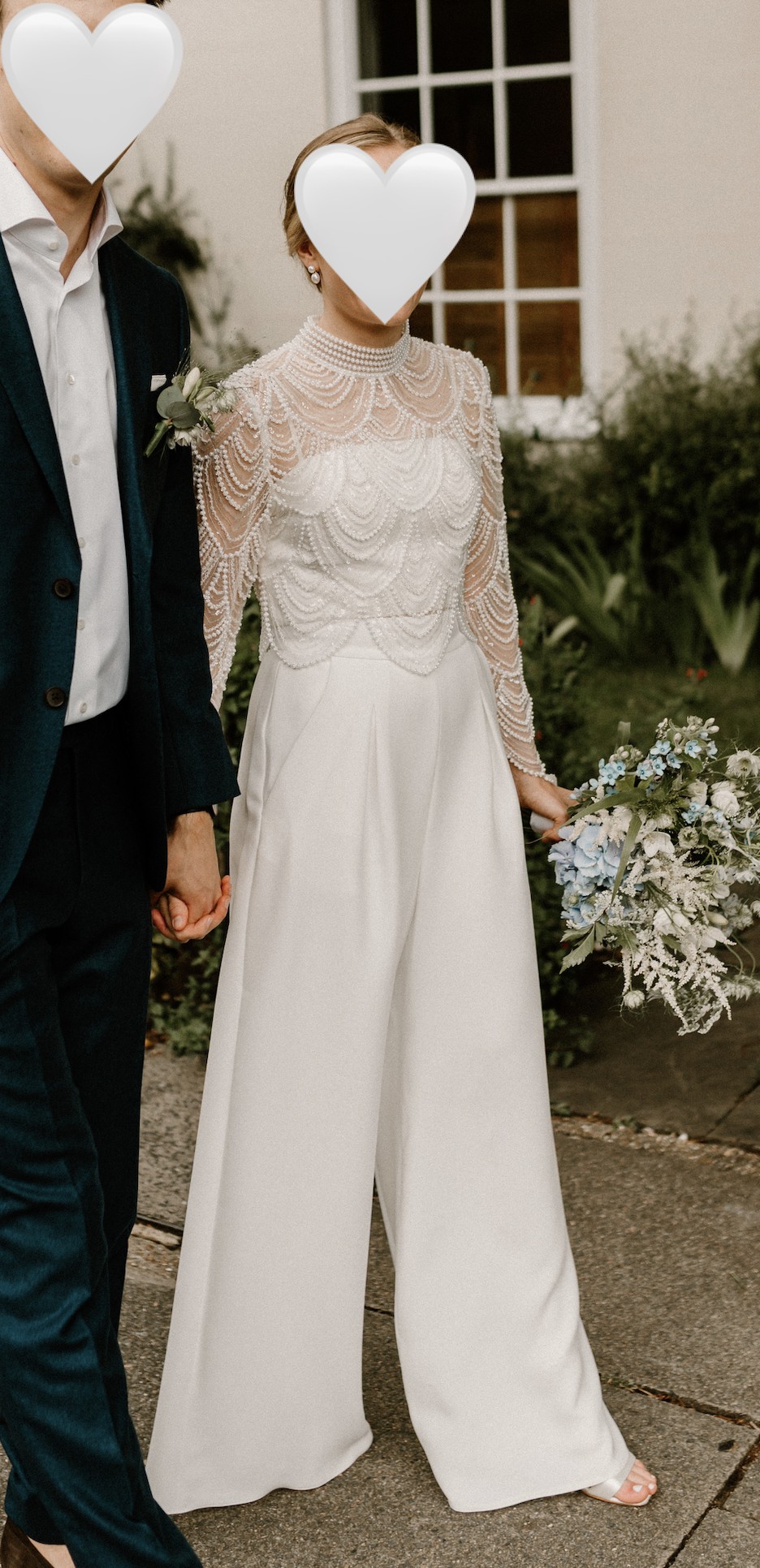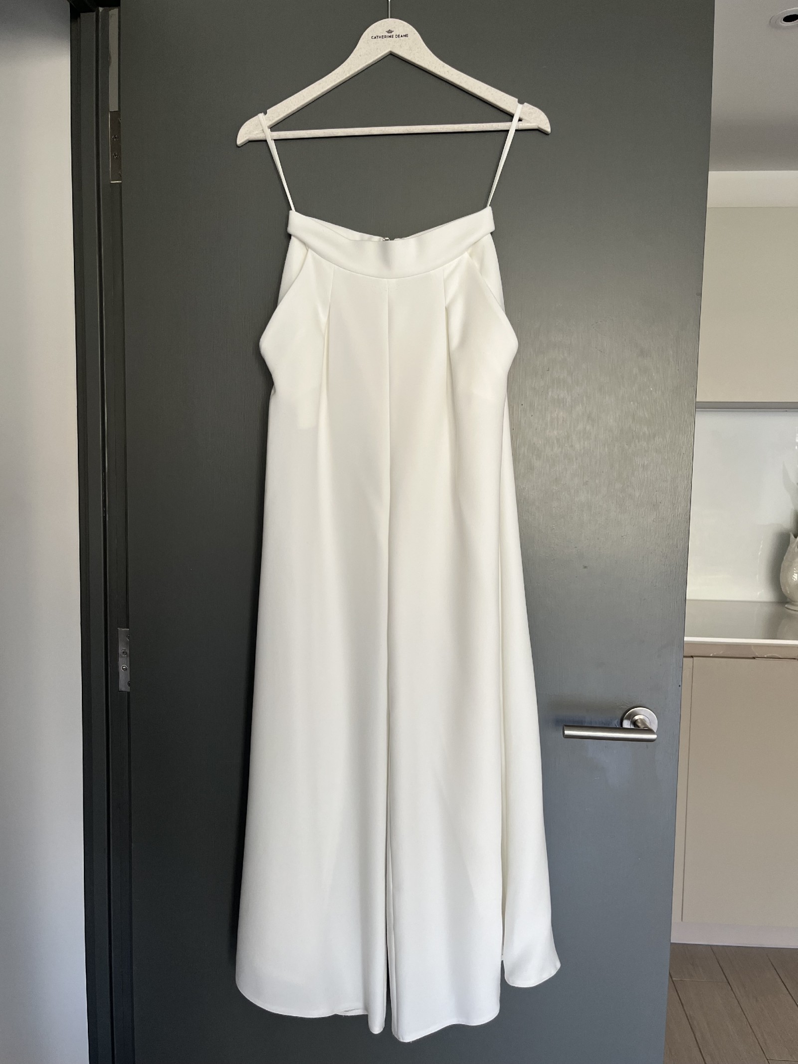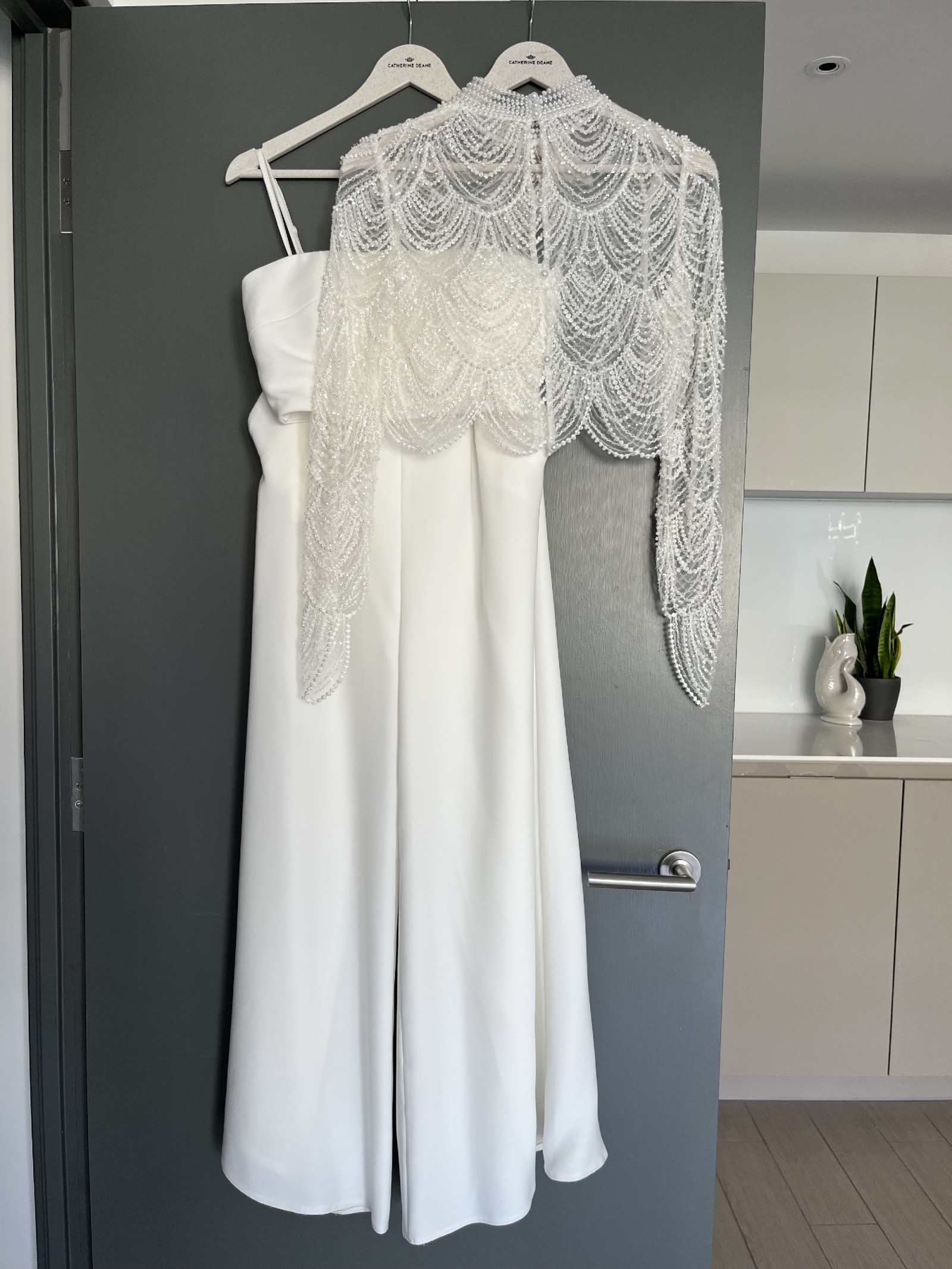 A beautifully modern and romantic Catherine Deane bridal set, worn once and professionally cleaned. This elegant three-piece look features the iconic Anya pearl topper, the Alexis tailored wide-leg trousers, and the Zia bandeau bodice.
