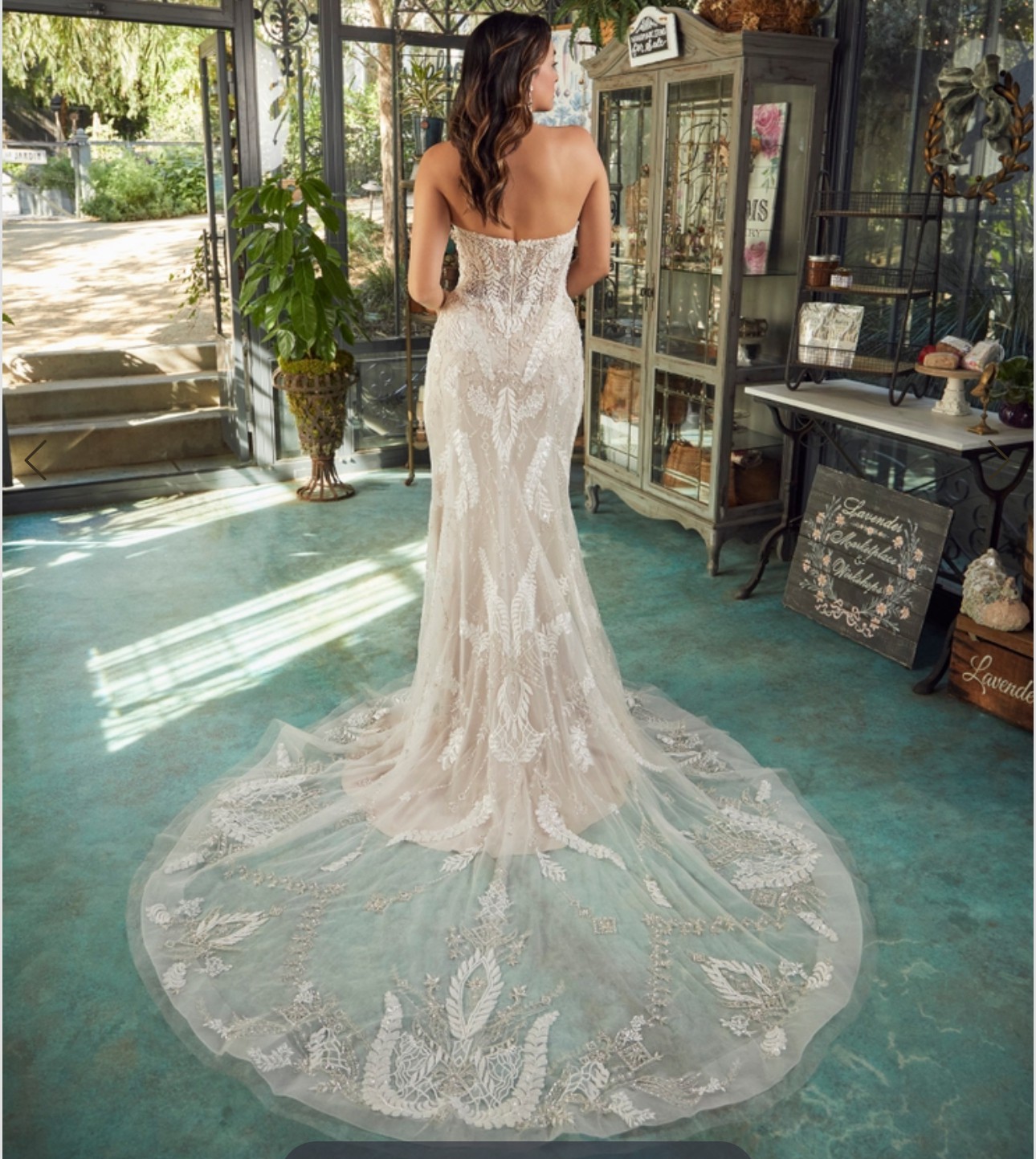 Style 2478 Beatrice by Casablanca Bridal is a vision of romance. A flawless sweetheart neckline is balanced by carefully placed lace, sequins, and beading across the bodice to accentuate the waist. The elegant detailing continues down Beatrice's sheath silhouette into a parade of embellishments placed across the 60" train. Exquisite from every angle with the perfect touch of old Hollywood glamor, Beatrice is a gown worthy of it's own celebration.