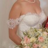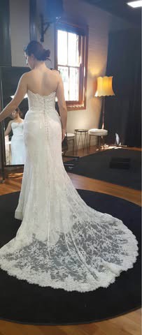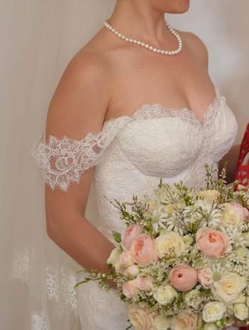 The strapless design includes a built-in corset for flattering support and shape. A fitted skirt flows into a graceful train that can be bustled for ease during the reception. The elegant dress also comes with optional off-the-shoulder lace sleeves, adding a sweet and versatile touch!