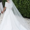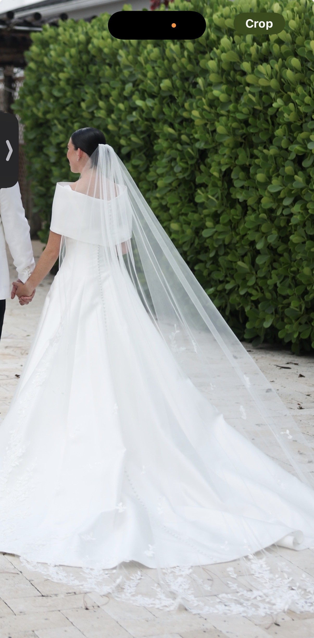 Cathedral-length veil: sheer tulle with delicate floral appliqués along the edge.