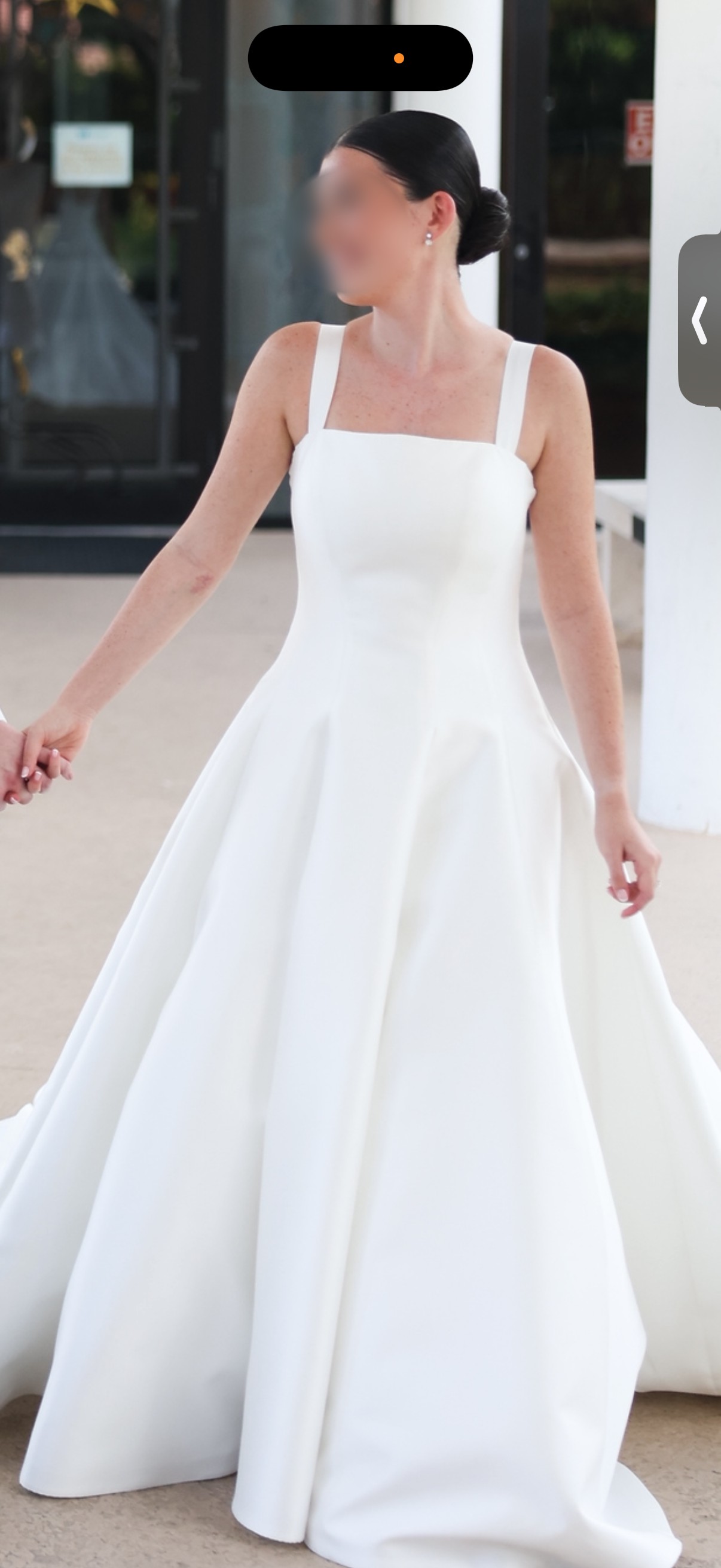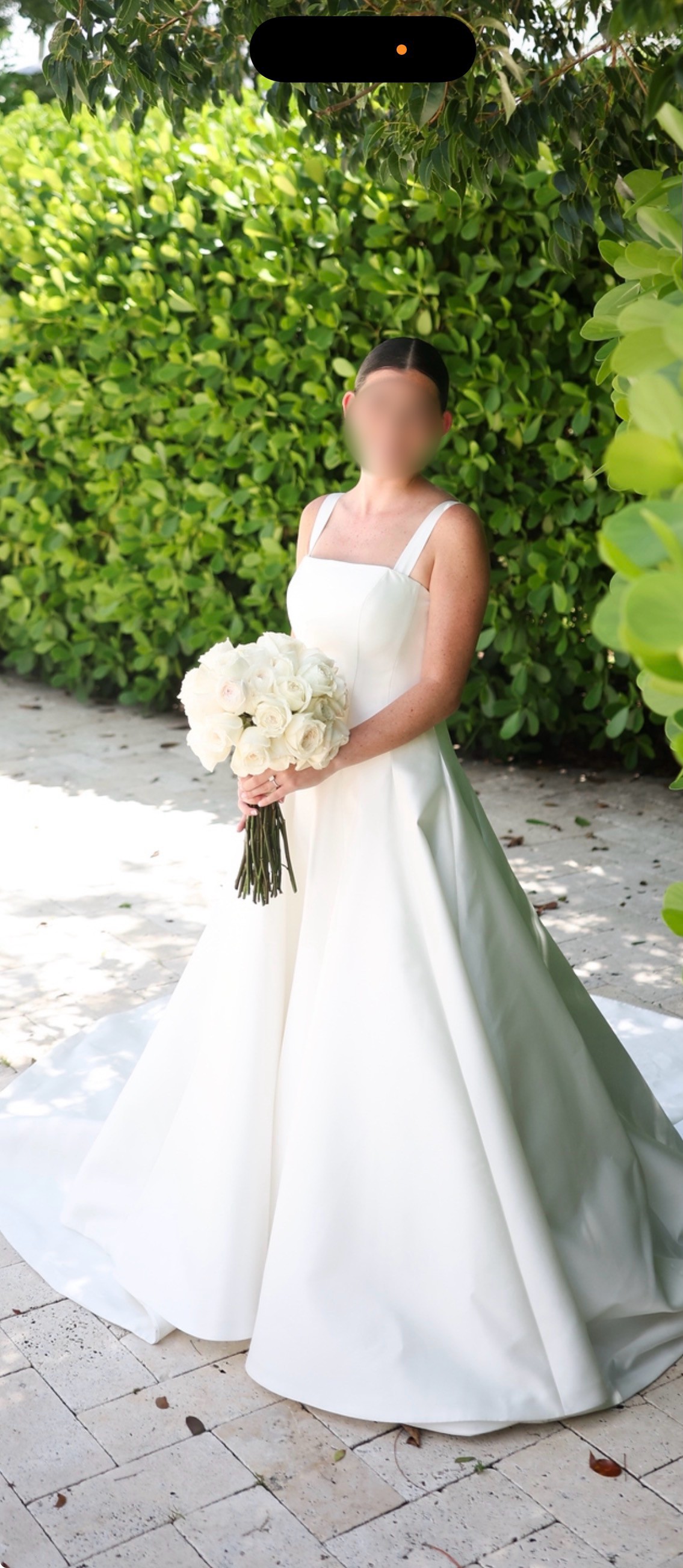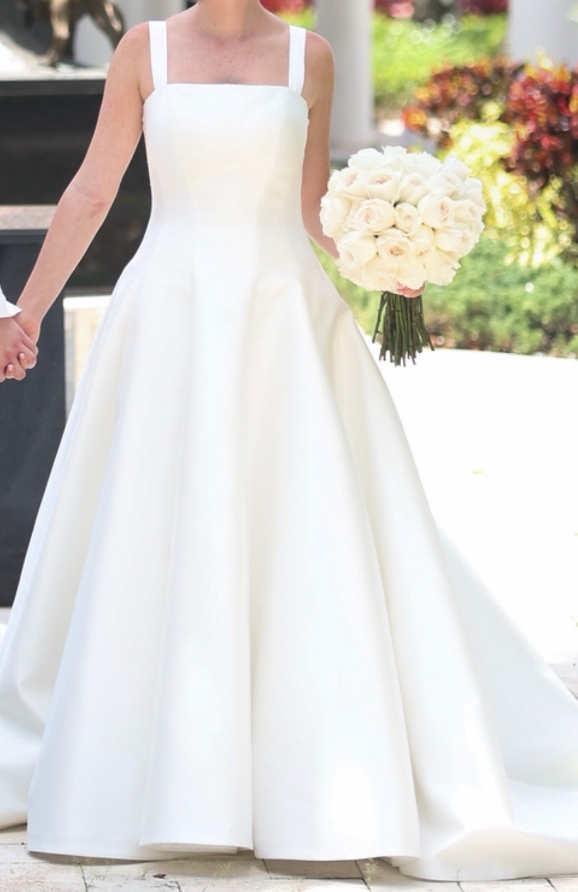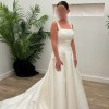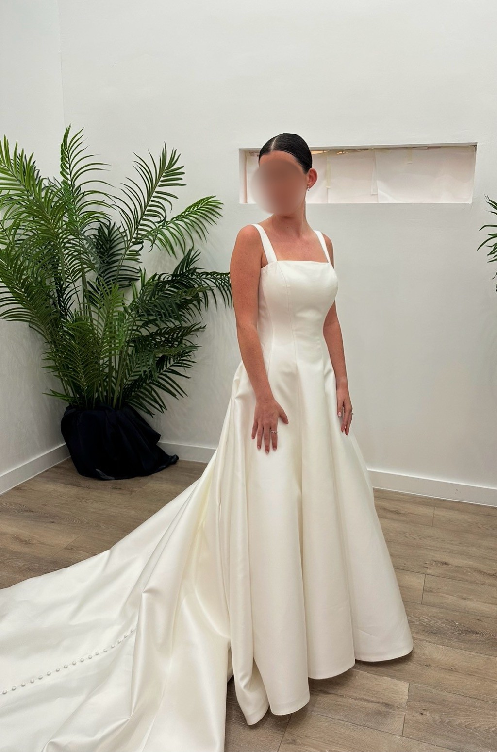 Crafted from luxurious matte satin, the dress features a structured square neckline, wide straps, and a beautifully fitted bodice that flows into a full A-line skirt with buttons down the back and a sweeping train. It offers the perfect mix of classic and contemporary.