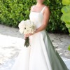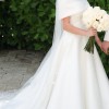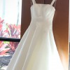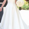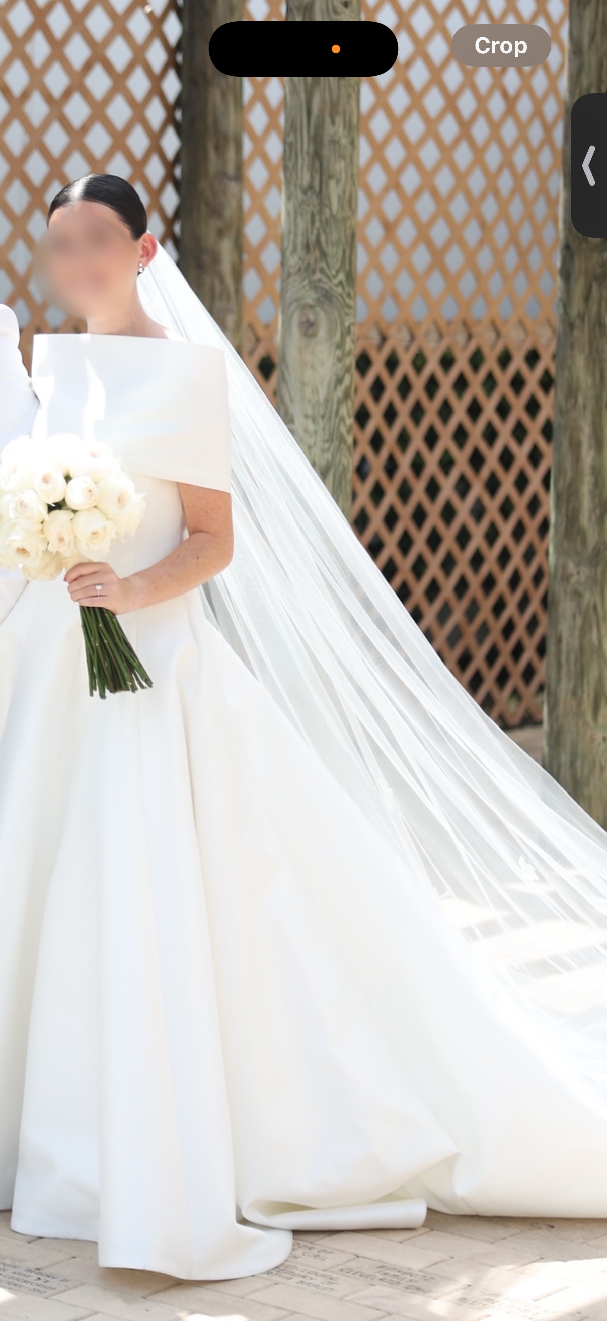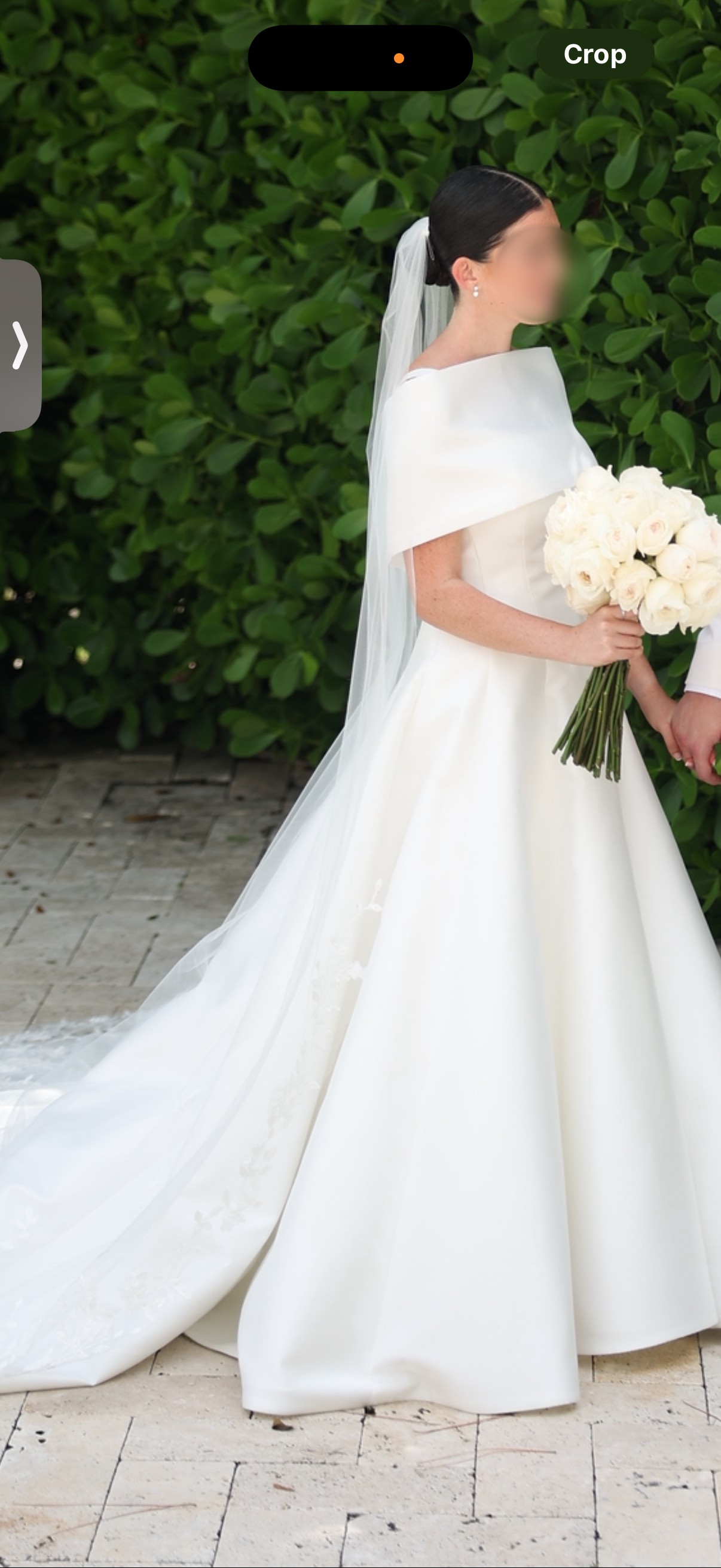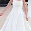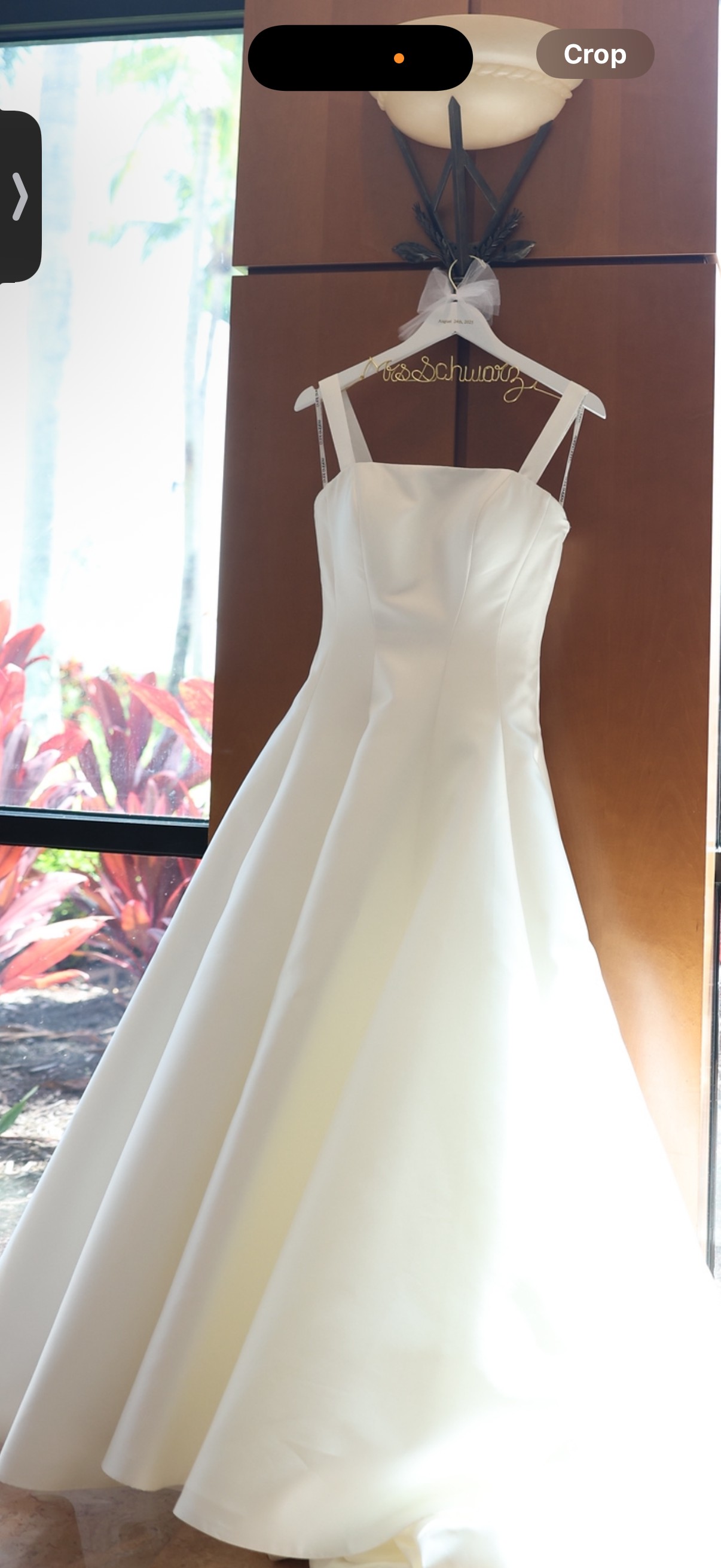Crafted from luxurious matte satin, the dress features a structured square neckline, wide straps, and a beautifully fitted bodice that flows into a full A-line skirt with buttons down the back and a sweeping train. It offers the perfect mix of classic and contemporary.