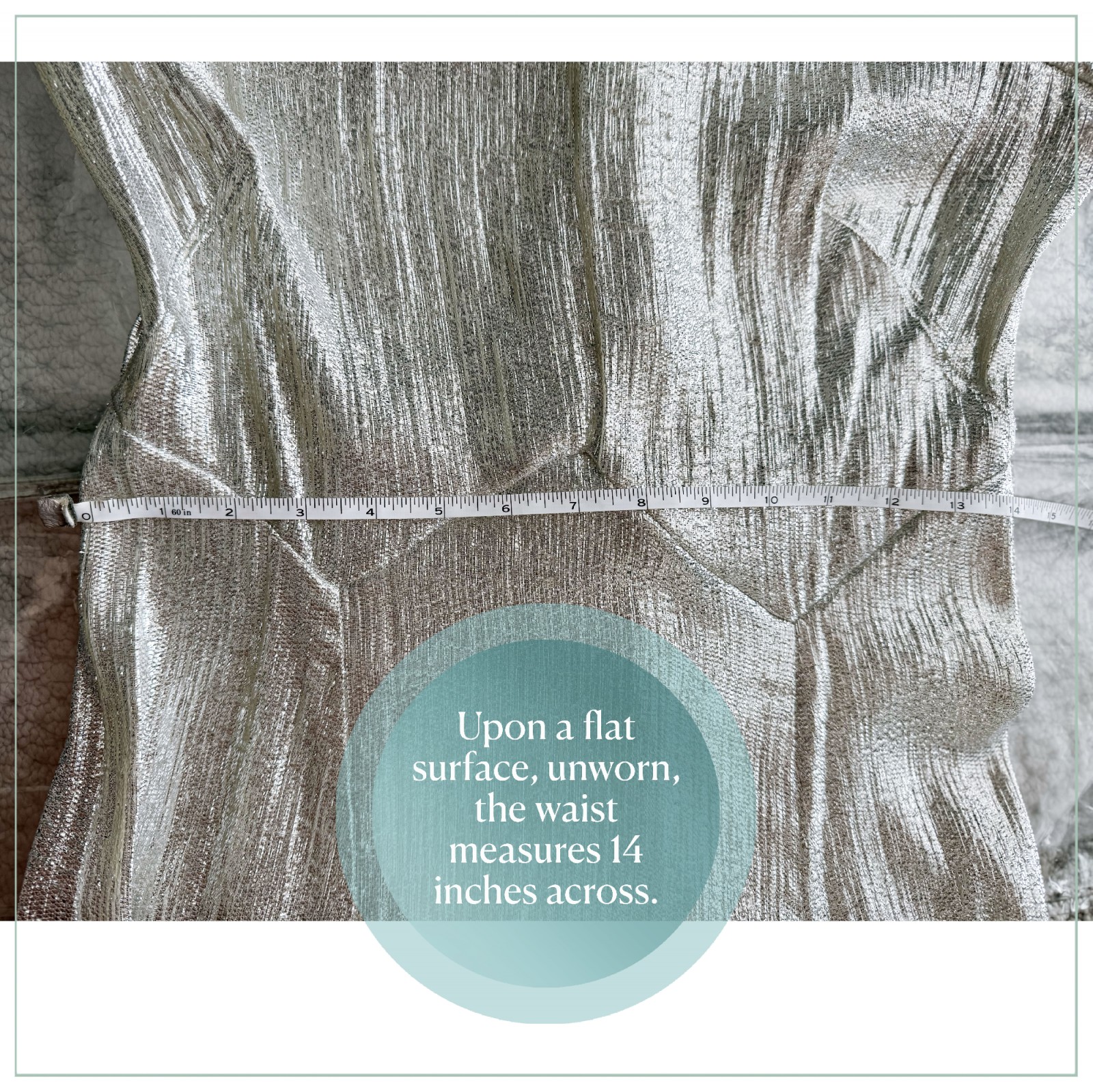 Upon a flat surface, unworn, the waist measures 14 inches across.