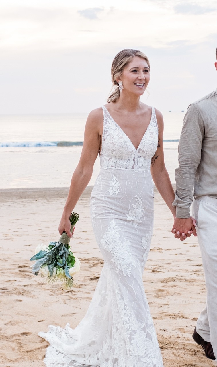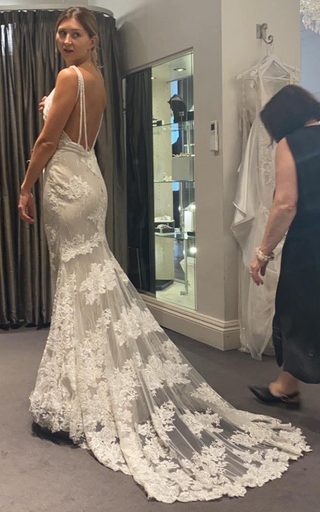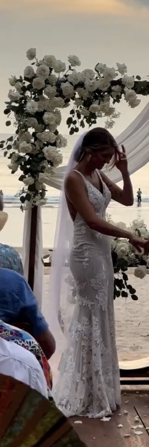 This stunning Jessica Couture dress was my dream come true on my wedding day. Designed in a flattering fit-and-flare silhouette, it accentuated my curves beautifully while allowing for easy movement on the dance floor. The elegant V-neck and backless design create a captivating allure, ensuring all eyes were on me as I walked down the aisle.