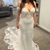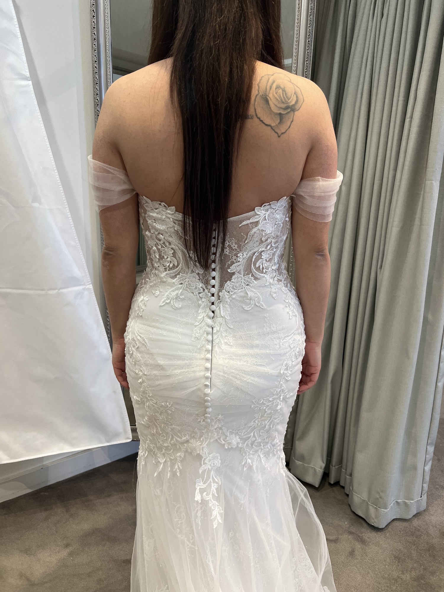 Detachable off-shoulder straps are a romantic and versatile element detail on this mermaid gown with floral embroidered lace, chantilly lace, and tulle. A soft, stretch jersey lining ensures comfort and body-contouring support, while a signature Elysee sculpted hem brings all the drama and elegance.