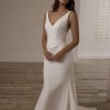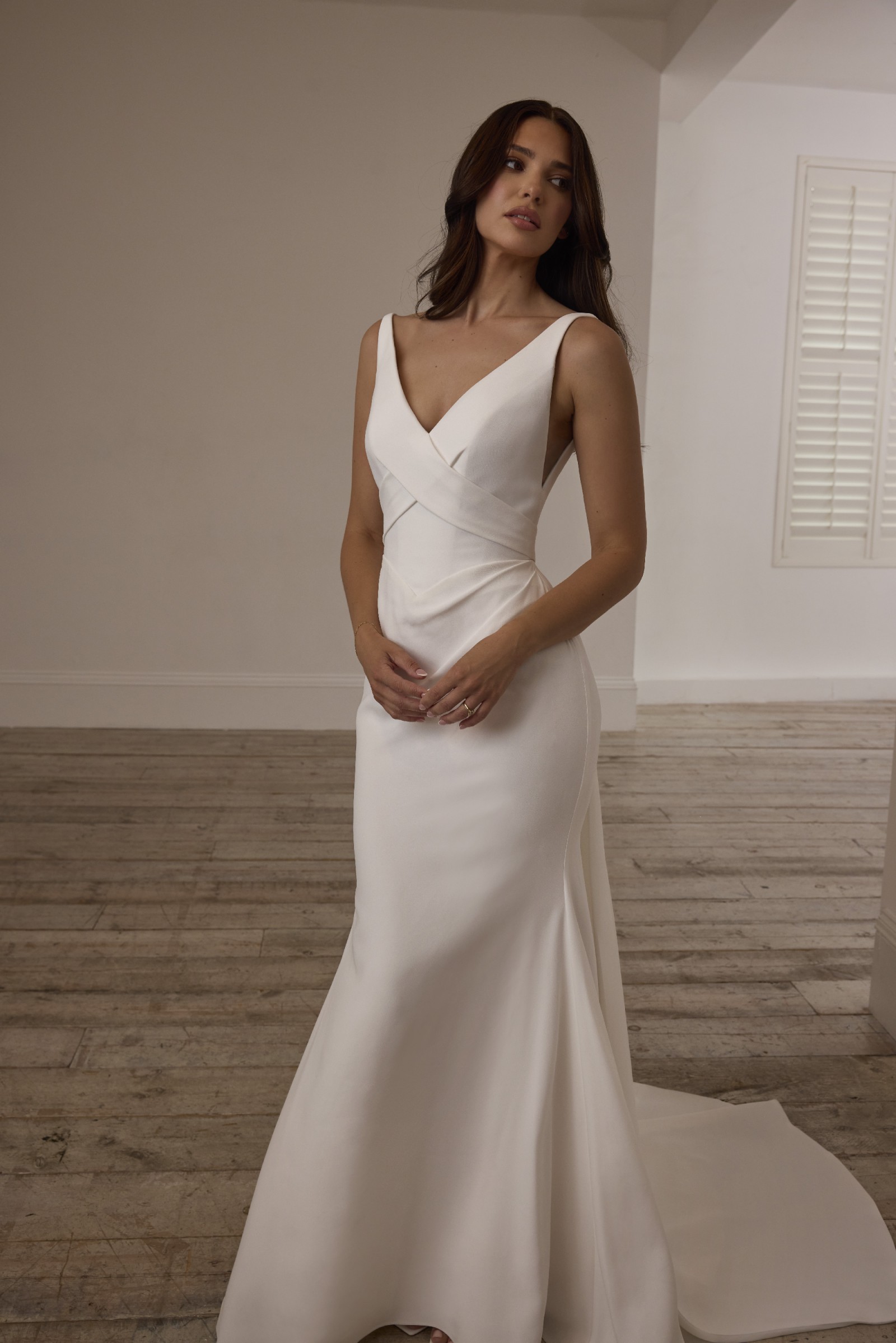 Crafted with exquisite attention to detail, this fit-and-flare silhouette hugs your curves beautifully, allowing you to feel both elegant and confident as you walk down the aisle. The stunning V-neckline adds a touch of allure while providing a timeless sophistication, making it perfect for any modern bride.