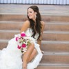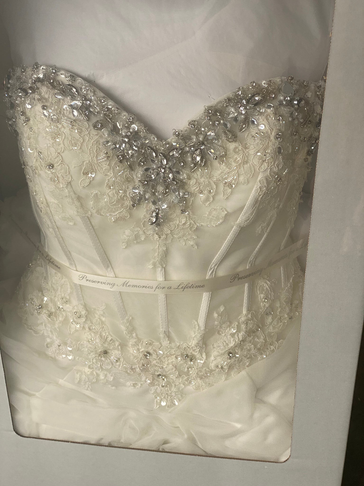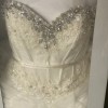From the Designer: This divine and decidedly daring organza wedding dress features a strapless sweetheart neckline, a sheer corset-style bodice with boning and crystal beaded lace details, and a magnificent high-low skirt of billowing organza pick-ups.
