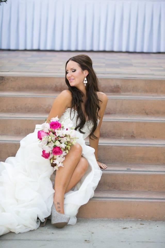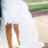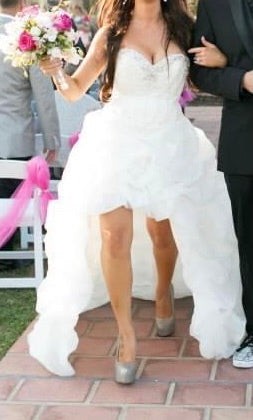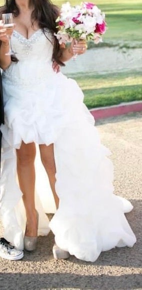 The dress is a corset, sweetheart top that transitions into a beautiful ruffled high to low bottom. Very stunning.