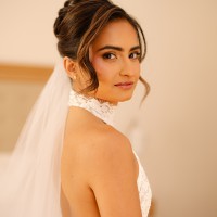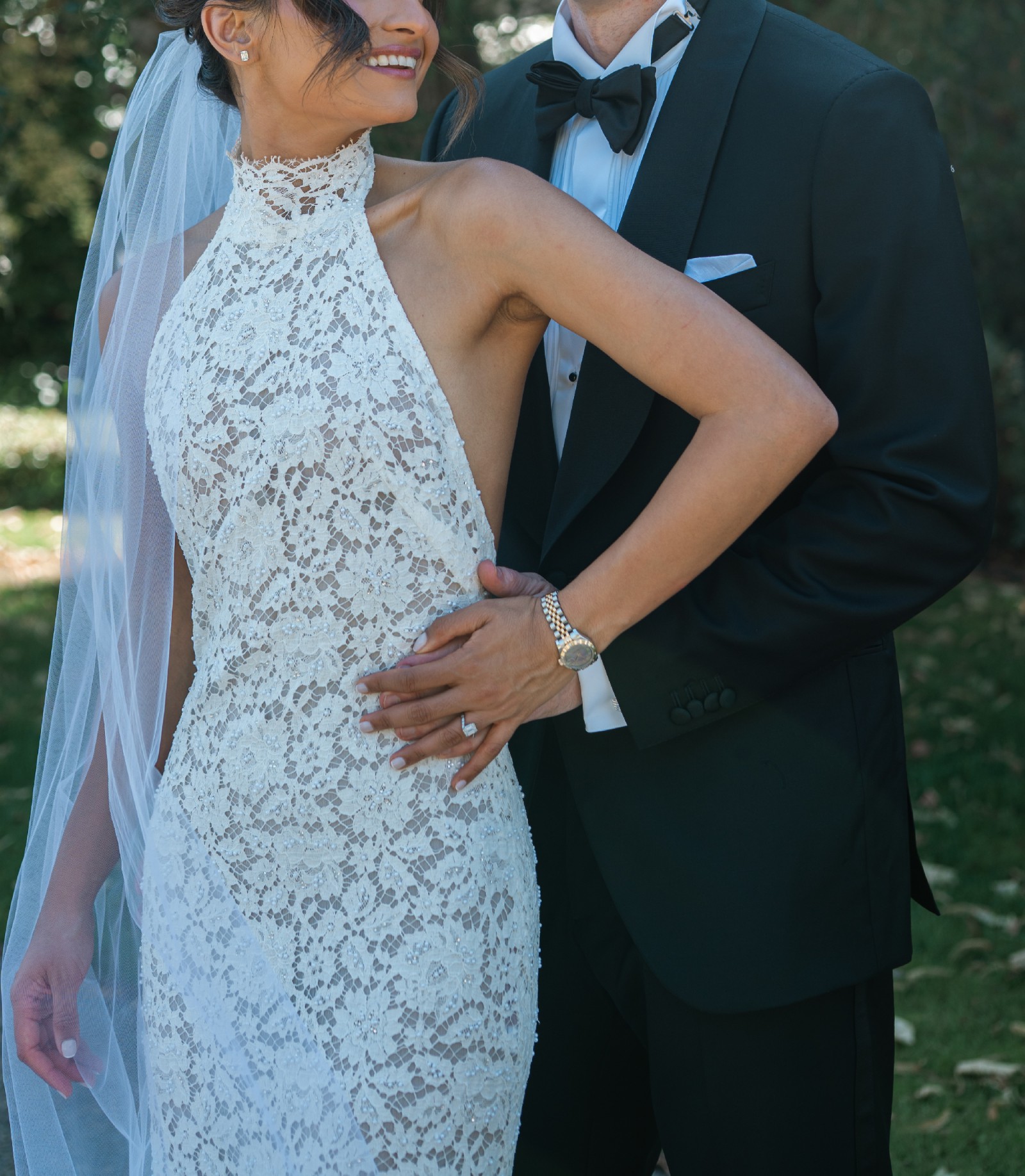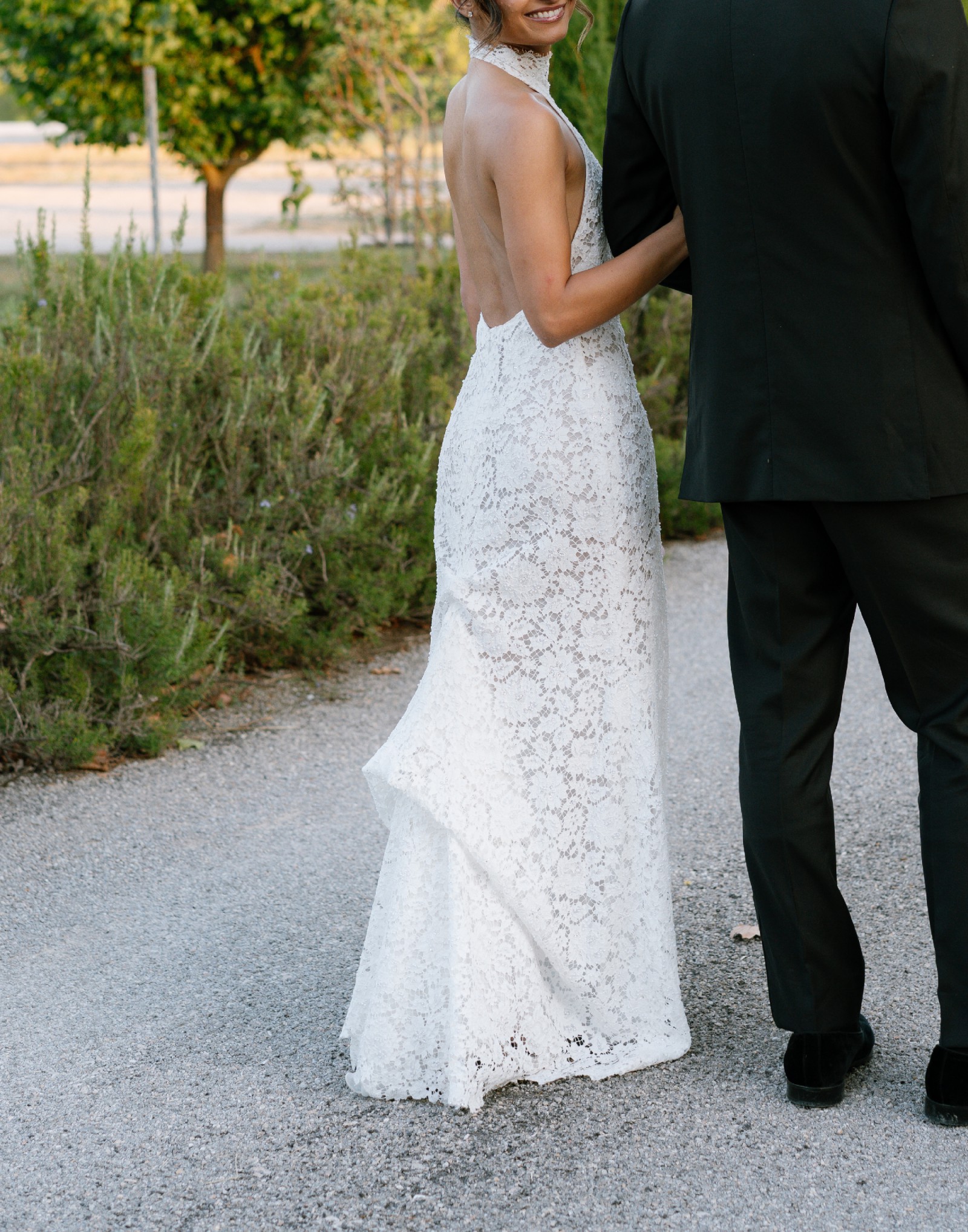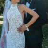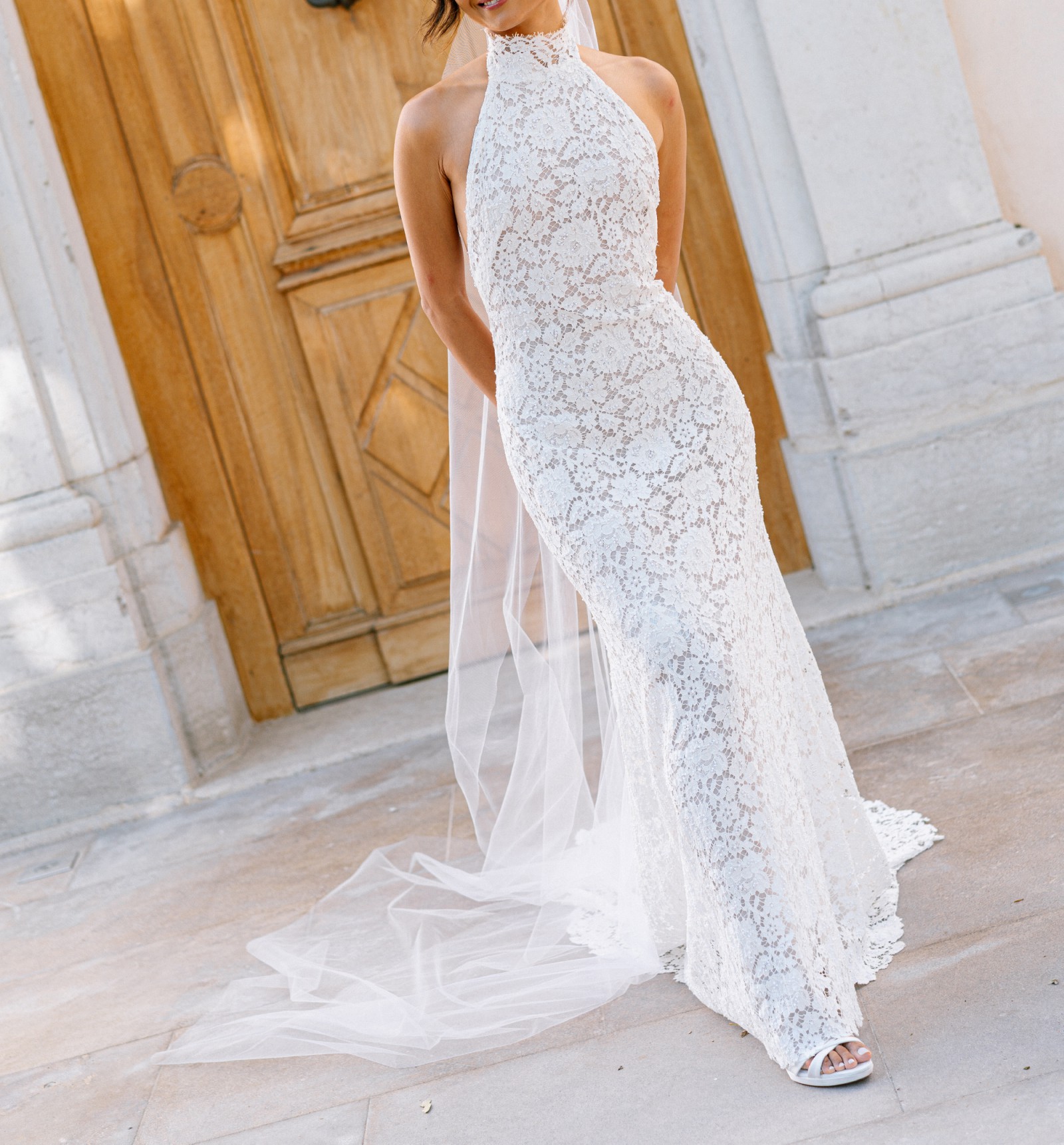 The halter neckline creates a sophisticated, modern look, and the backless design adds just the right amount of allure. Unlike many halter lace dresses, there’s no seam at the bust or waist, so it photographs beautifully from every angle.