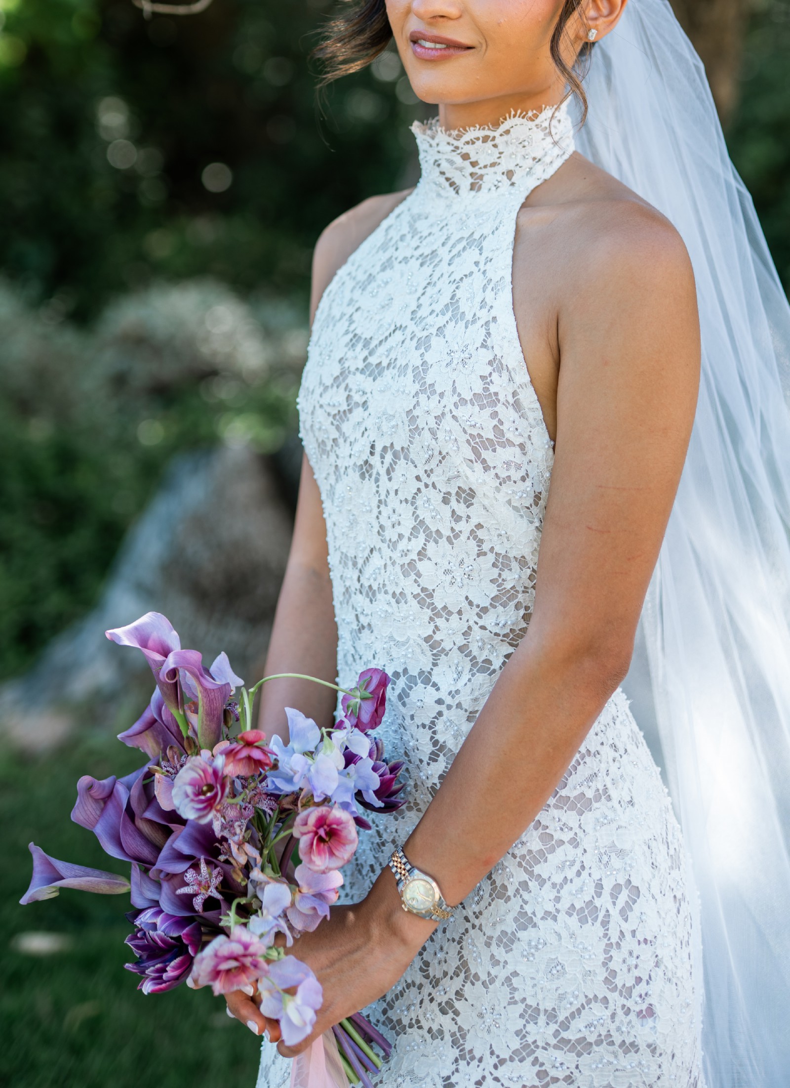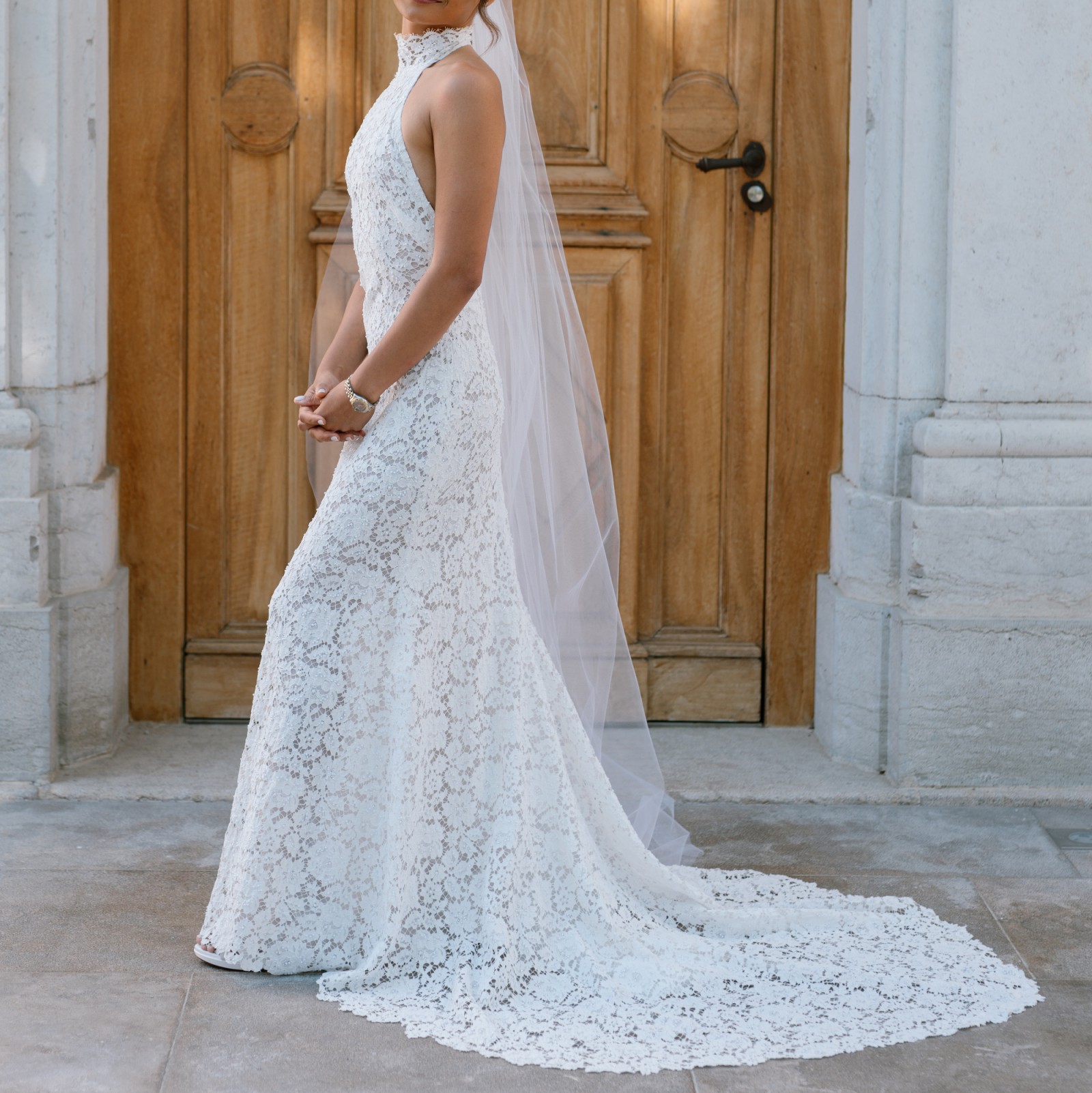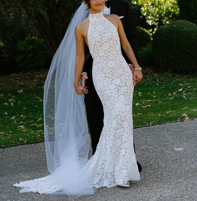 This custom-made Eva wedding gown by Francesca Miranda was the perfect dress for my destination wedding. It’s incredibly travel-friendly — it packs easily and doesn’t wrinkle — so flying with it was a breeze. The trumpet silhouette hugs your curves while still allowing for graceful movement, making it both elegant and comfortable.