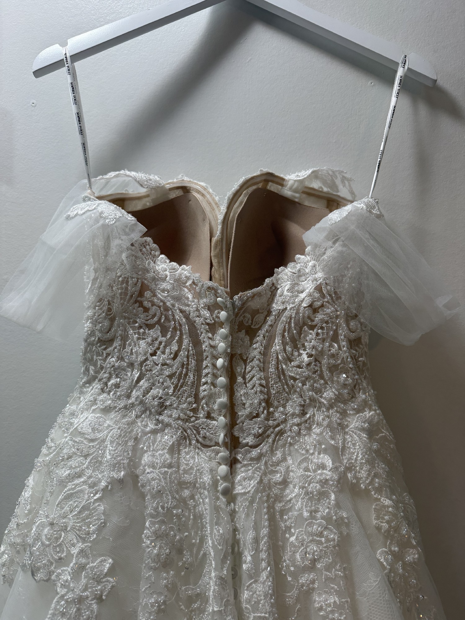 Sophia Tolli ST2214 Rosalinda bridal ballgown is styled in tulle over lace, with a sweetheart neckline, detachable off-the-shoulder straps, and a low-rise back. Beaded lace appliques add texture and glitz to this designer wedding dress, finished with covered back buttons and a petal-shaped cutout cathedral train.