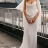 The Galaxy Cape is a new interpretation of the Galaxy dress, which was originally created for the red carpet, featuring a cinched waist and draped neckline inspired by the classic Vivienne Westwood Ball Tie gown. The gown is created in pearl white FSC-certified crepe satin, with a contrasting silk georgette drape across the décolletage, certified as organic, and 18th-century Watteau style train for added drama.