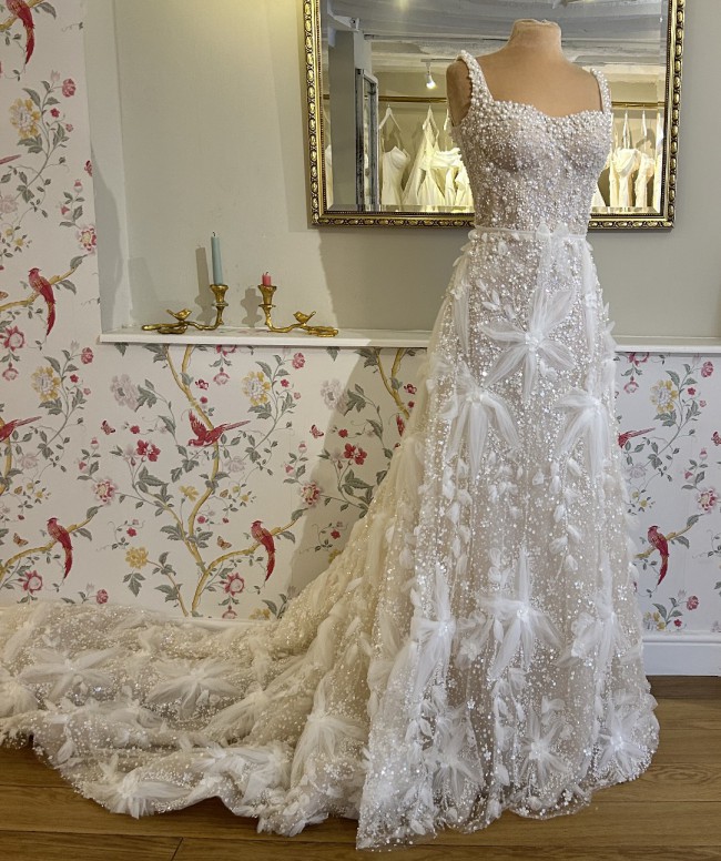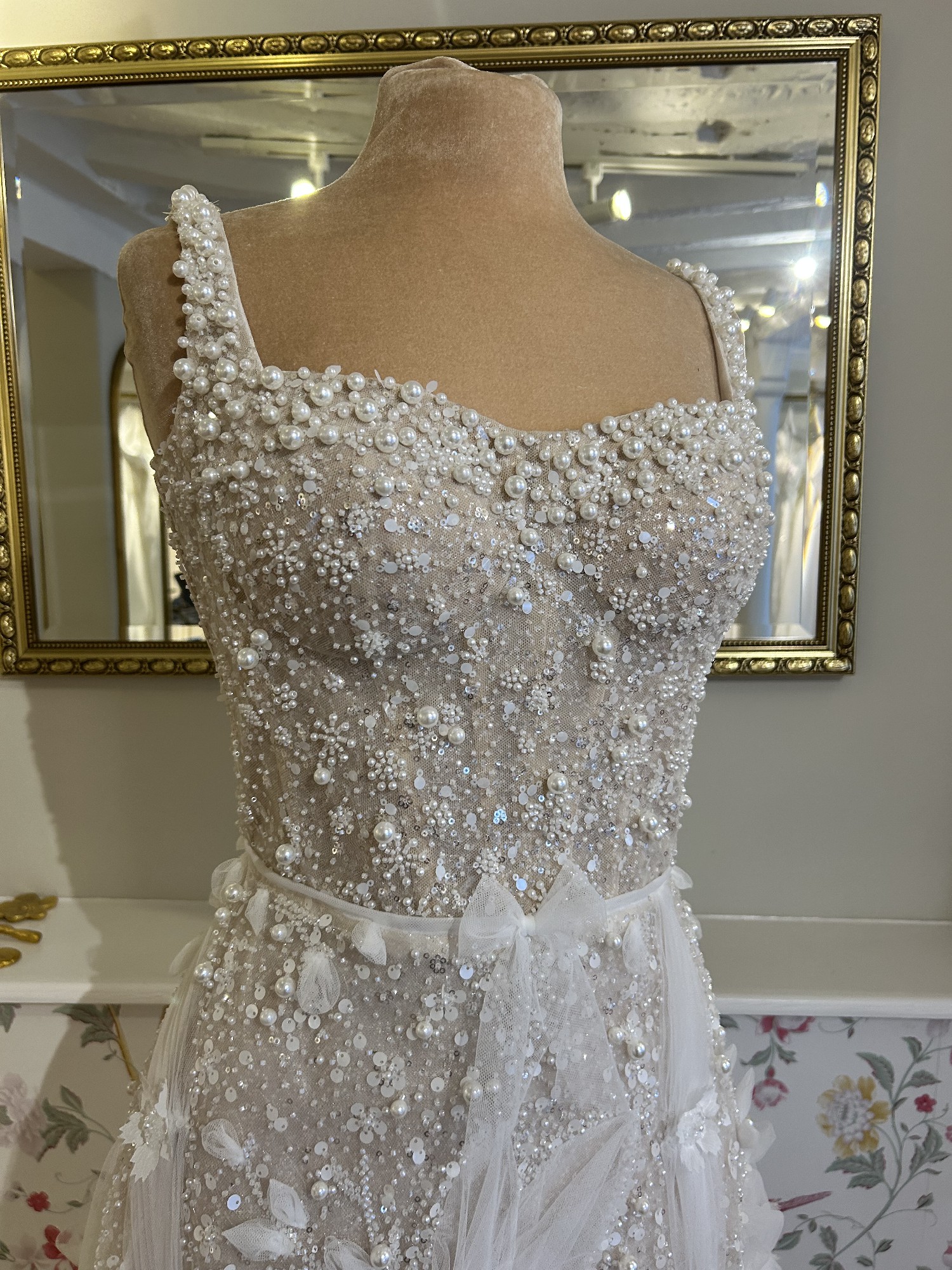 This Thelma gown by Wona Concept is a breathtaking choice for the modern bride seeking elegance and romance on her special day. The stunning A-line silhouette flatters every figure, gracefully cascading to a floor-length hem that exudes timeless sophistication. In a soft ivory hue, this gown offers a classic appeal while highlighting the exquisite details that make it truly unique. The square neckline lends a touch of contemporary flair, while delicate straps add a hint of femininity. The mid-back design enhances the gown's overall allure, ensuring you feel confident and comfortable as you celebrate. What sets Thelma apart are the mesmerising 3D flowers that dance across the dress, accentuated by glistening beads, crystals, pearls, and sequins that catch the light beautifully. This gown is not just a dress; it’s a canvas of artistry that tells your love story. Embrace the magic of your wedding day with Thelma, where every detail is designed to make you shine.