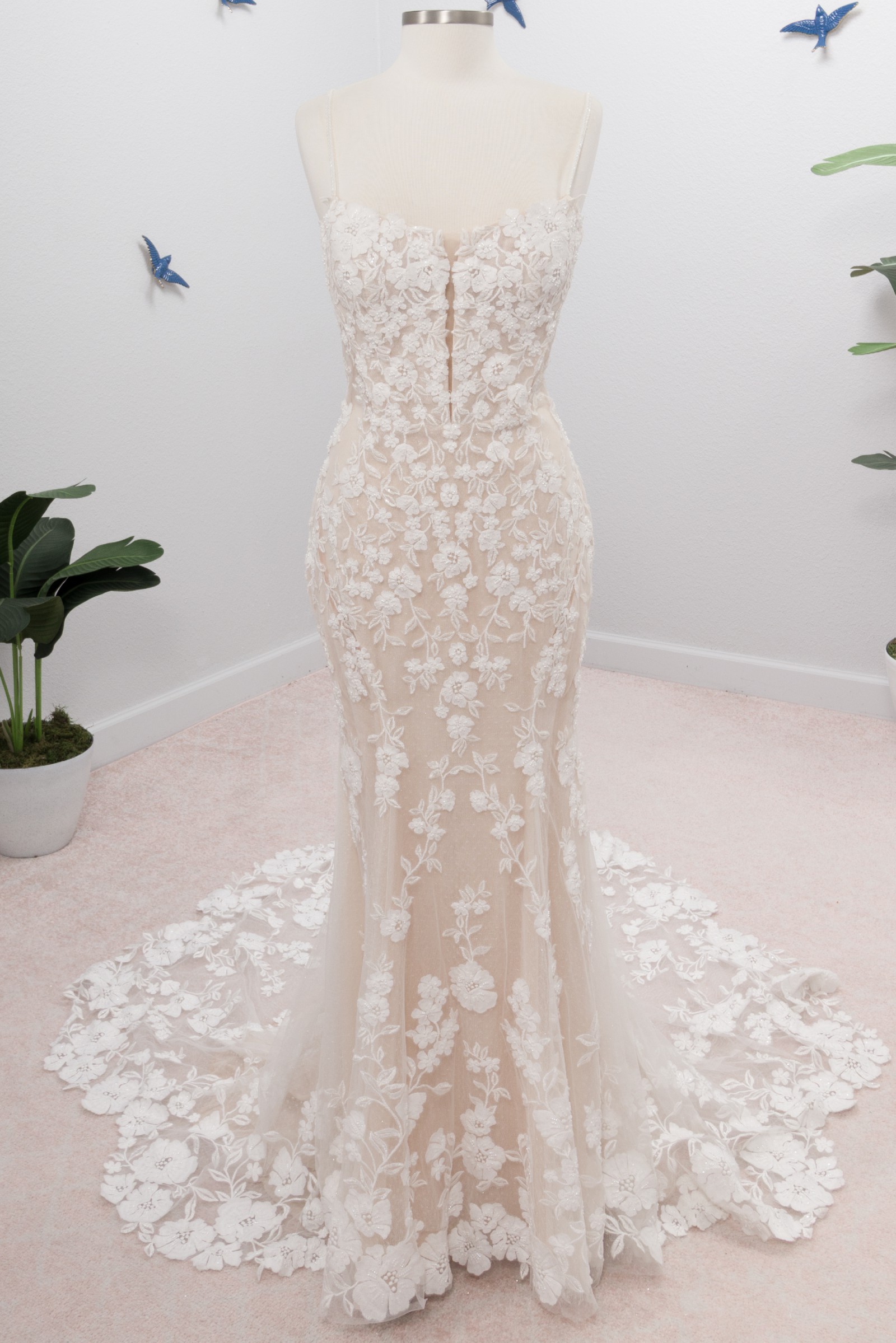 - Bridal sizing varies by designer — use your measurements, not your usual size. It is best to be under on all 3 measurements to have it brought it during alterations