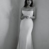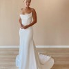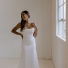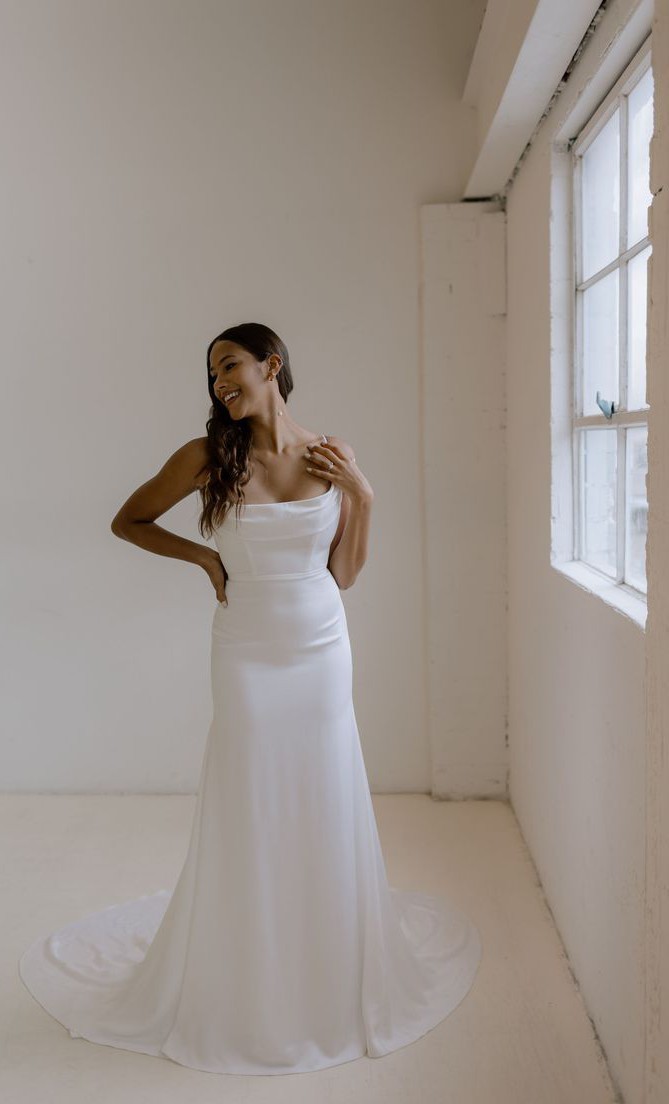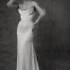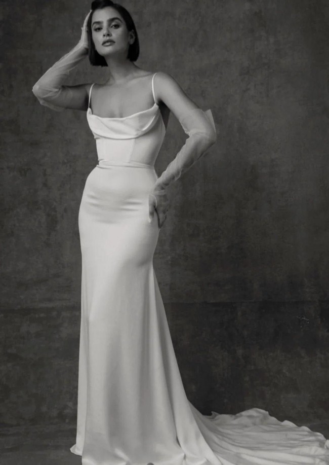 The Sarah Seven Rhea gown is a satin-crepe fit and flare gown with a luxurious sheen, structured bodice, spaghetti straps, and draped cowl neckline. A flowy chapel length train finishes this look. The corset bodice makes for a great fit with the tightly pleated cowl as a scoop.