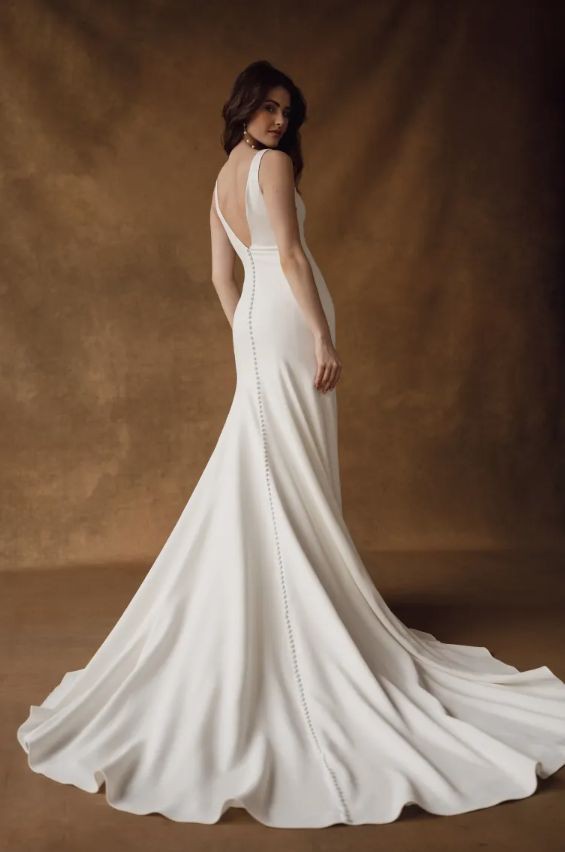 The Hughes by Jenny Yoo is the epitome of modern elegance. Cut in an Italian crepe fabric, it features a classic V neck and fit and flare silhouette sculpted by architectural seam lines that highlight and flatter your every curve. This dress is fully lined and features buttons all the way down the train.
