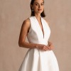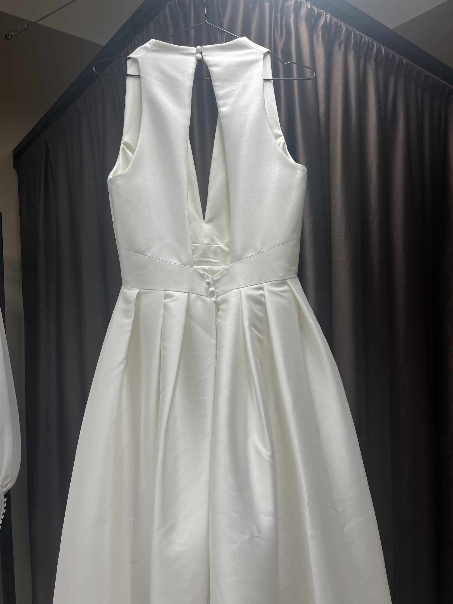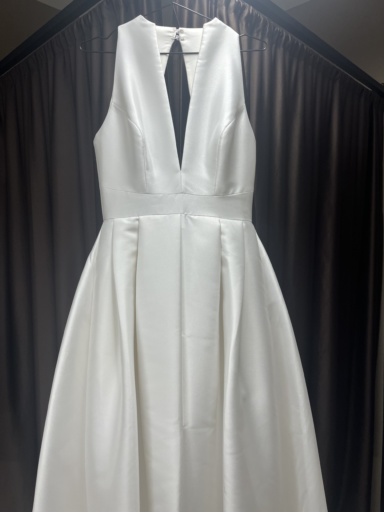 The V-neckline beautifully frames the décolletage while adding an air of sophistication, and the high back provides just the right amount of modesty. The floor-length design flows gracefully, making every step feel like a moment straight out of a fairytale. Made from exquisite fabric, it gracefully catches the light in all the right ways, making me feel radiant.
