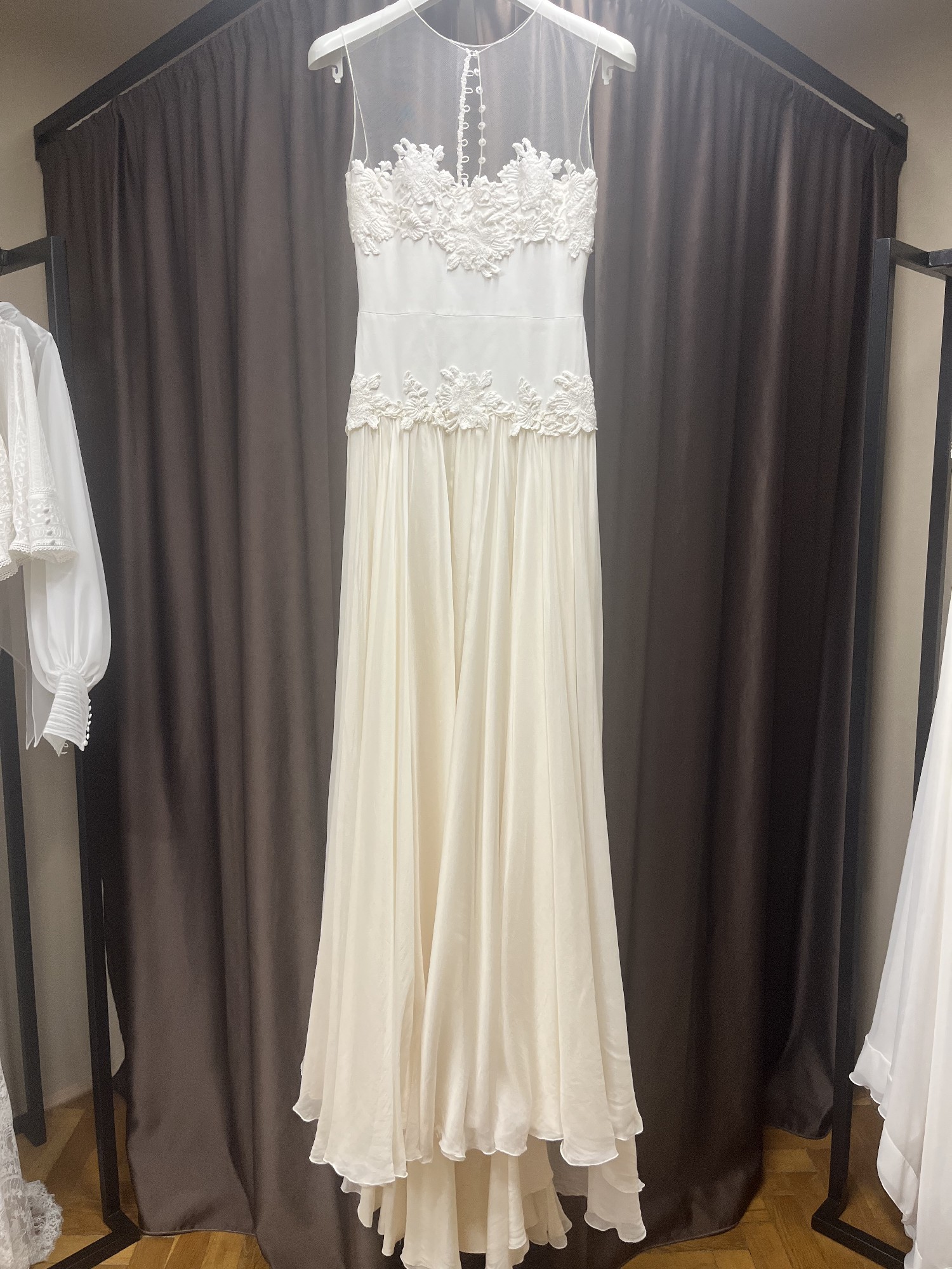 This dress, a size 34, is a treasure just waiting to be adored again. If you're looking for a gown that combines sophistication with a touch of whimsy, this is the one. I’m excited for the next bride to experience the joy and beauty that this dress brought to my wedding day. It truly deserves to be seen in another celebration of love.