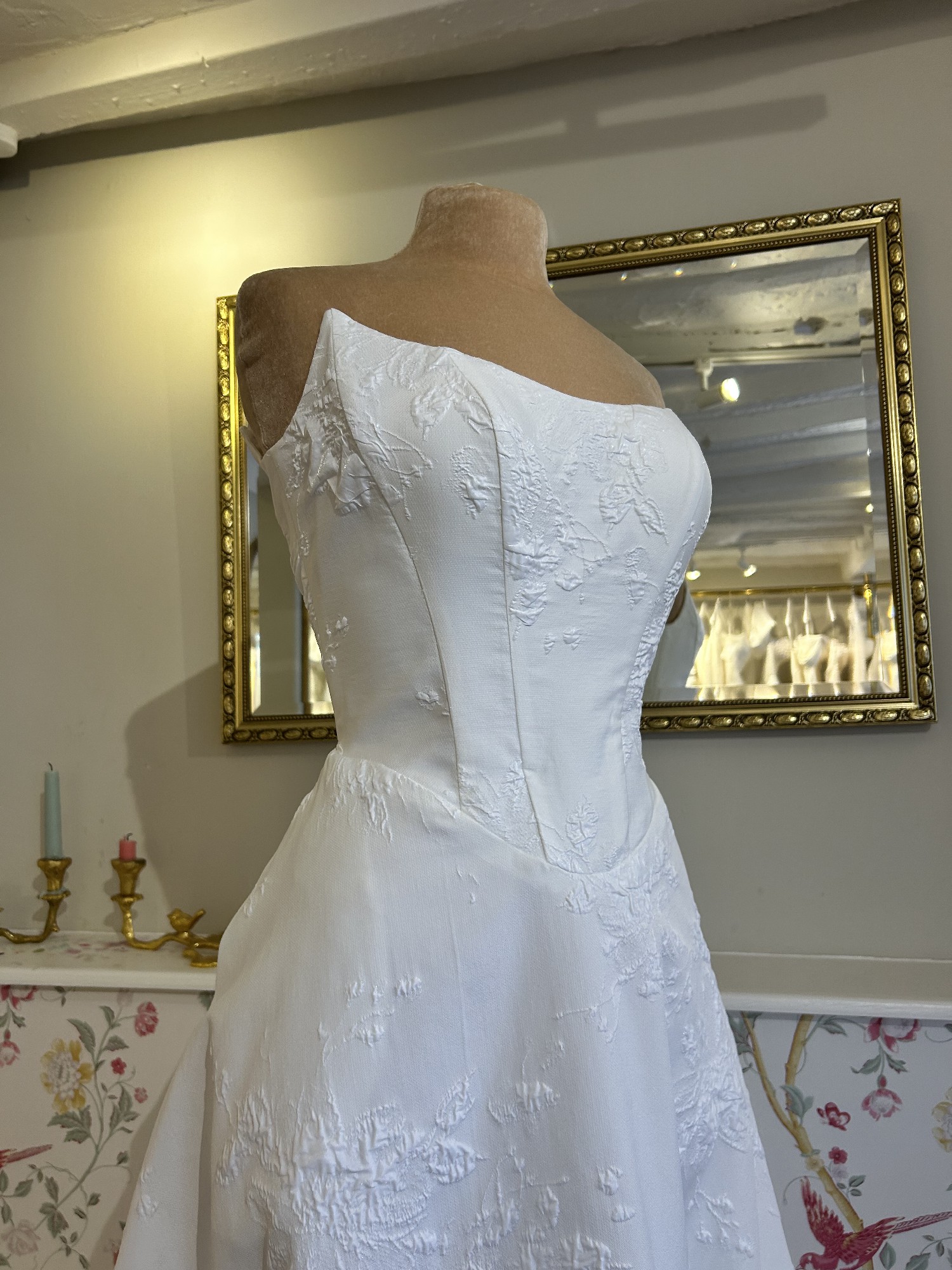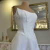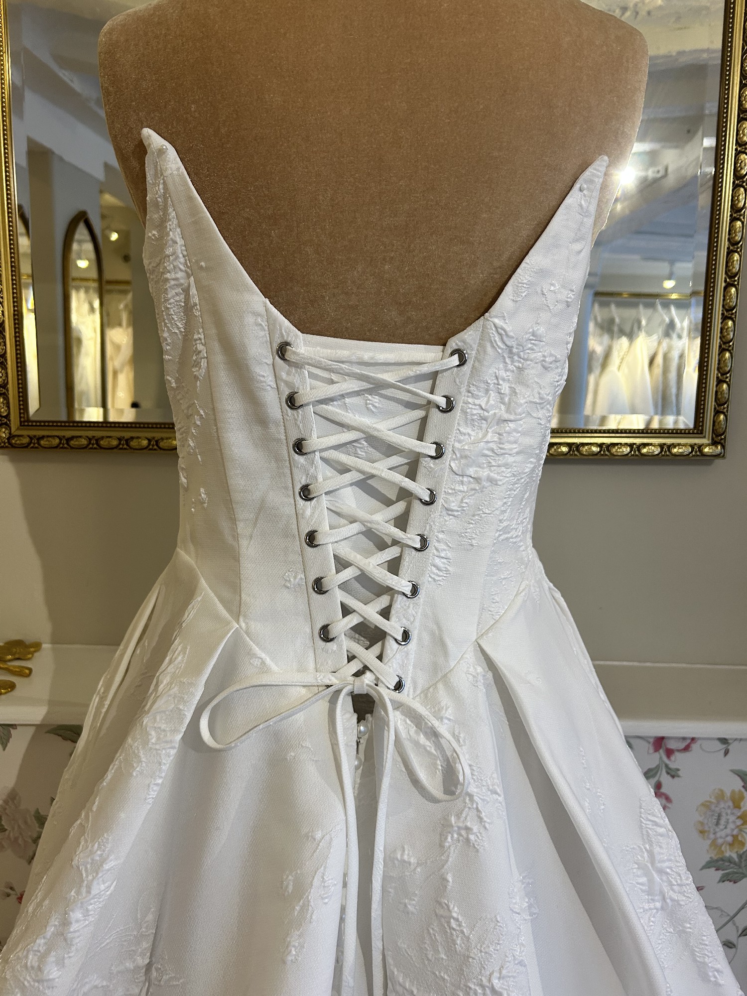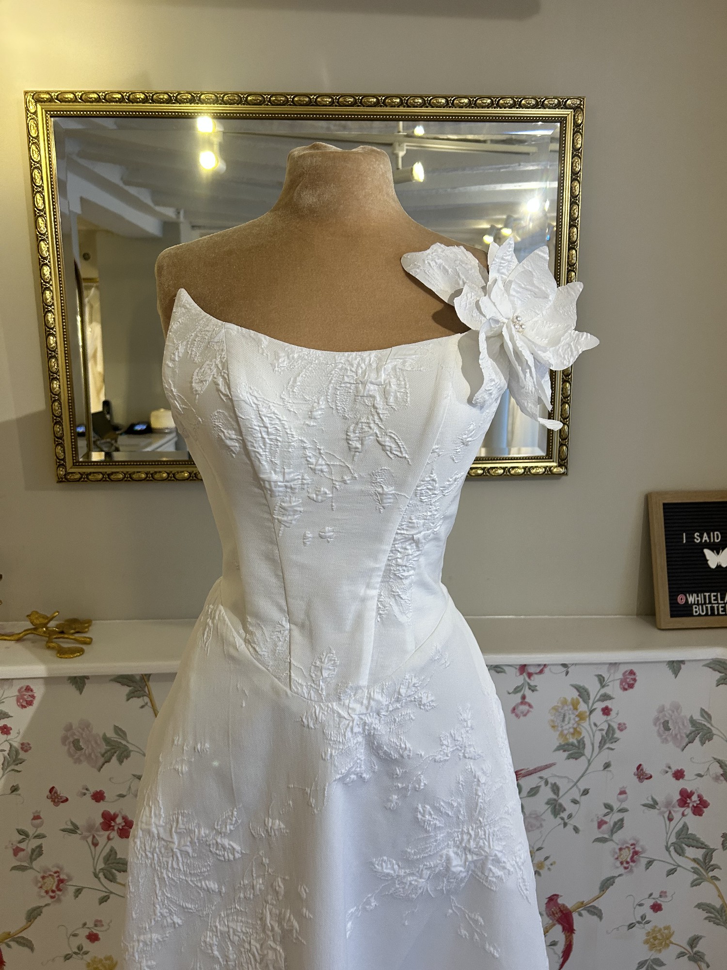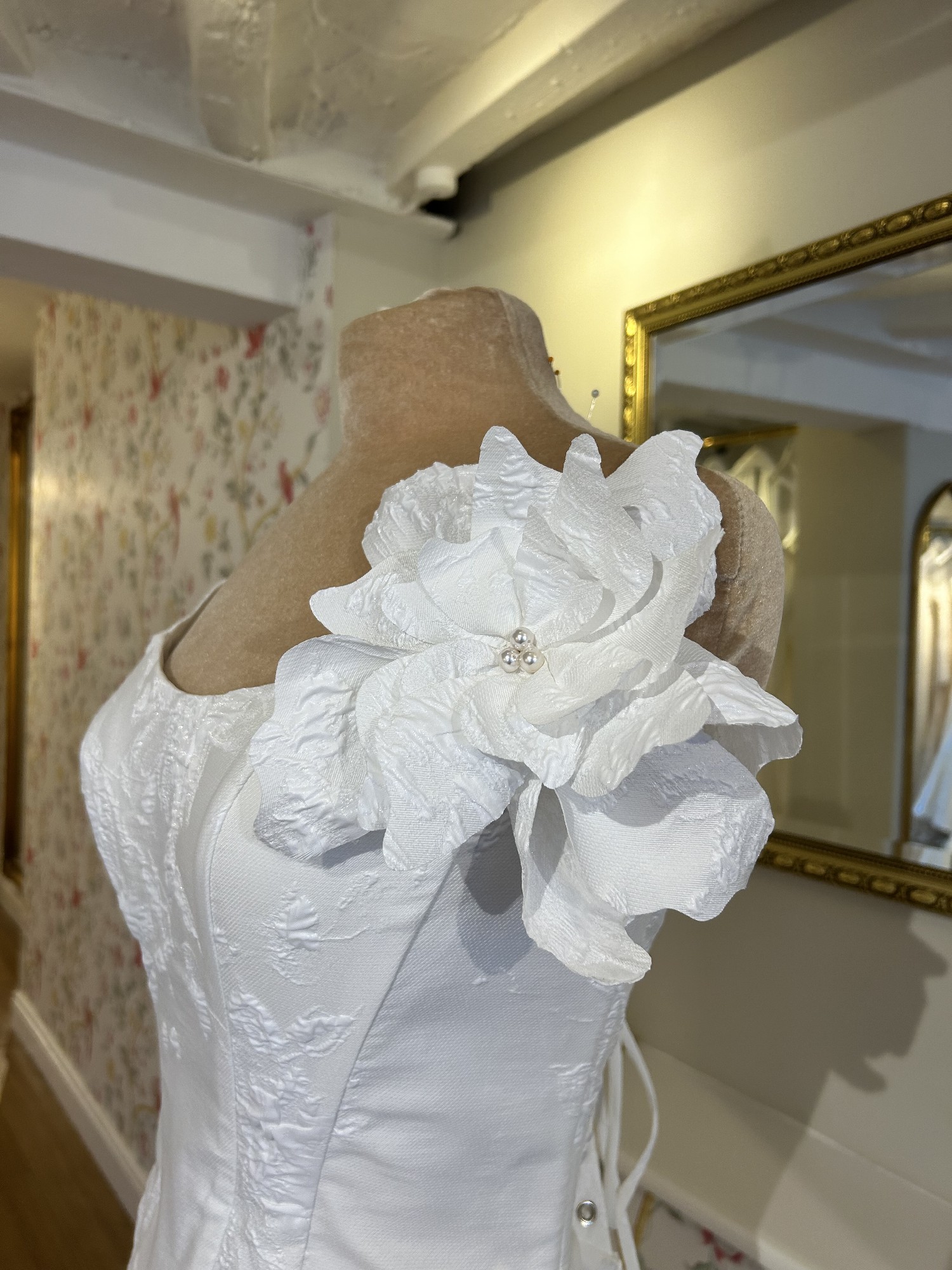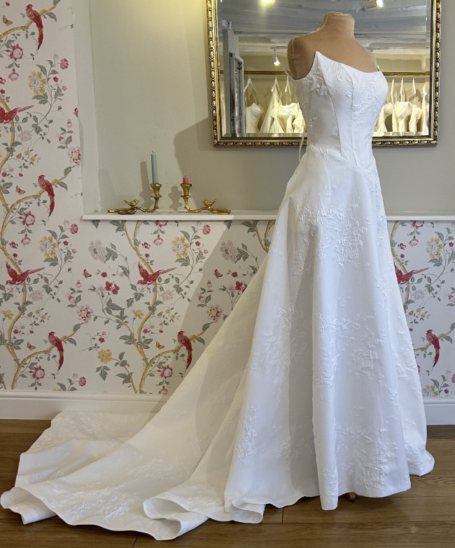 This breathtaking Clarendon wedding dress by Josephine Scott is a dream come true for any bride seeking elegance and sophistication on her special day. The exquisite bright ivory colour complements its A-line silhouette, gracefully flowing from the curve neckline down to the floor-length hem. The strapless design highlights the shoulders and collarbone, ensuring a stunning look from every angle. One of the standout features of this gorgeous gown is the tasteful embellishment of pearl buttons, which adds a touch of opulence without overwhelming the overall design. The mid back offers a beautifully chic touch, drawing attention to the bride's waist and creating a flattering profile. As an added bonus, the dress comes with pockets, allowing for practicality while maintaining an air of romanticism. This dress has a bold detachable flower finished with pearl details and is made from a lightweight jacquard.
