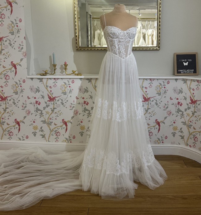 Please note this dress is a sample and has been tried on by brides in store but has no obvious damage. This dress is unaltered and will not be dry-cleaned before shipping. This sample is also for sale in store so this listing may get removed if the dress gets sold.