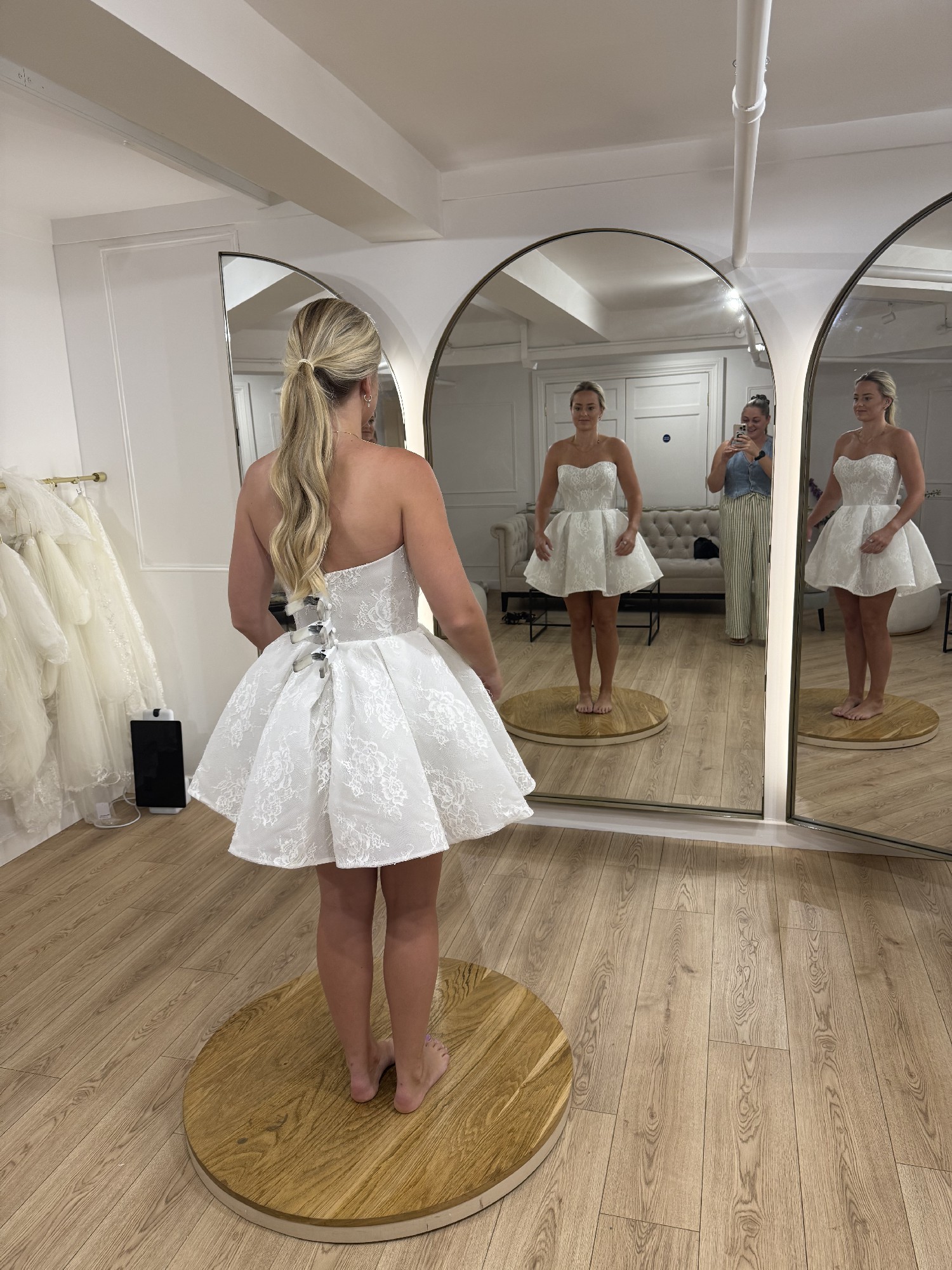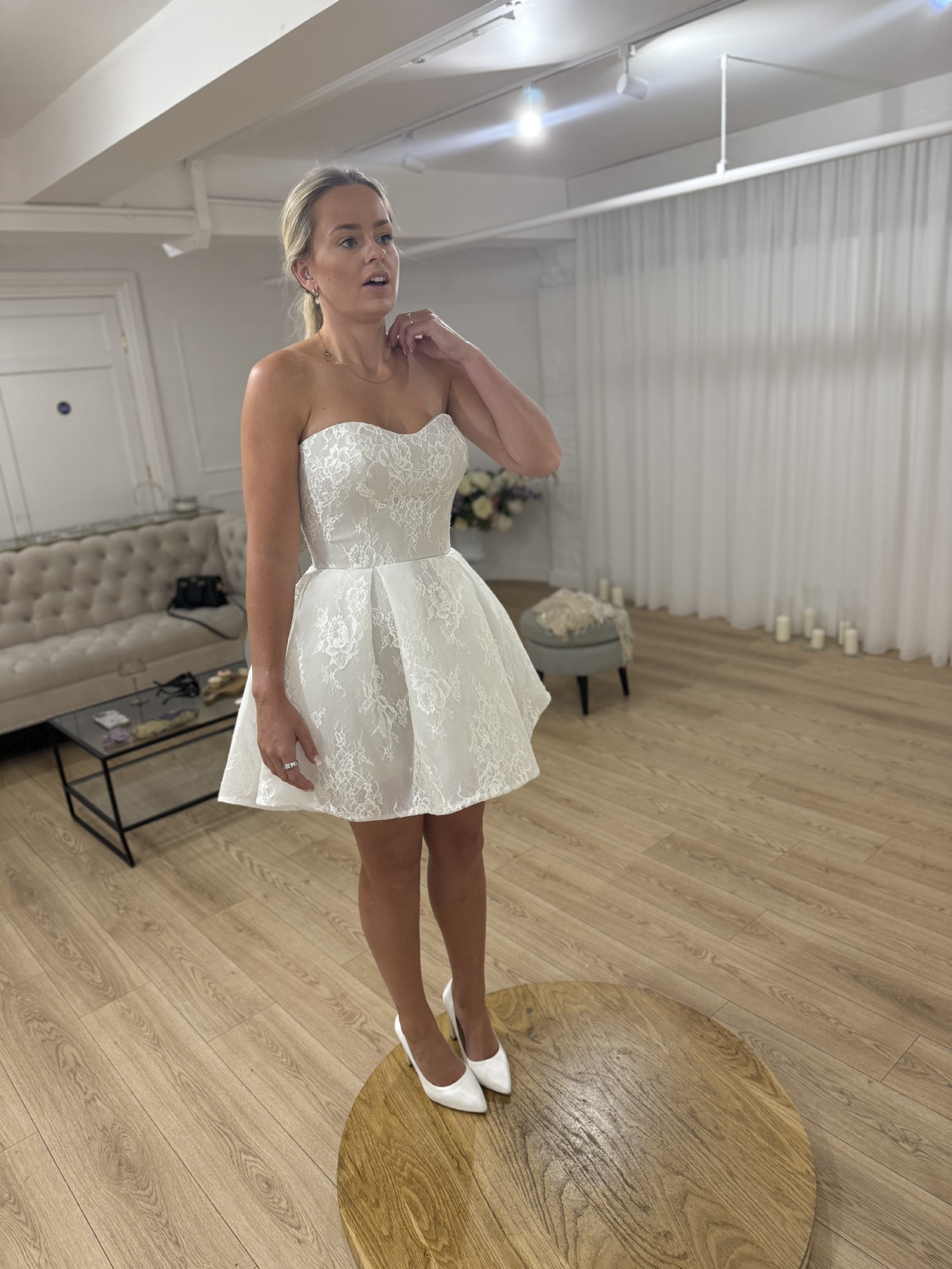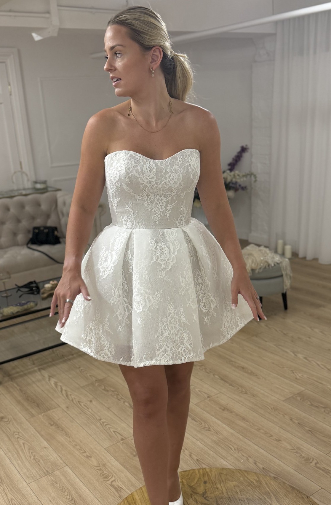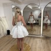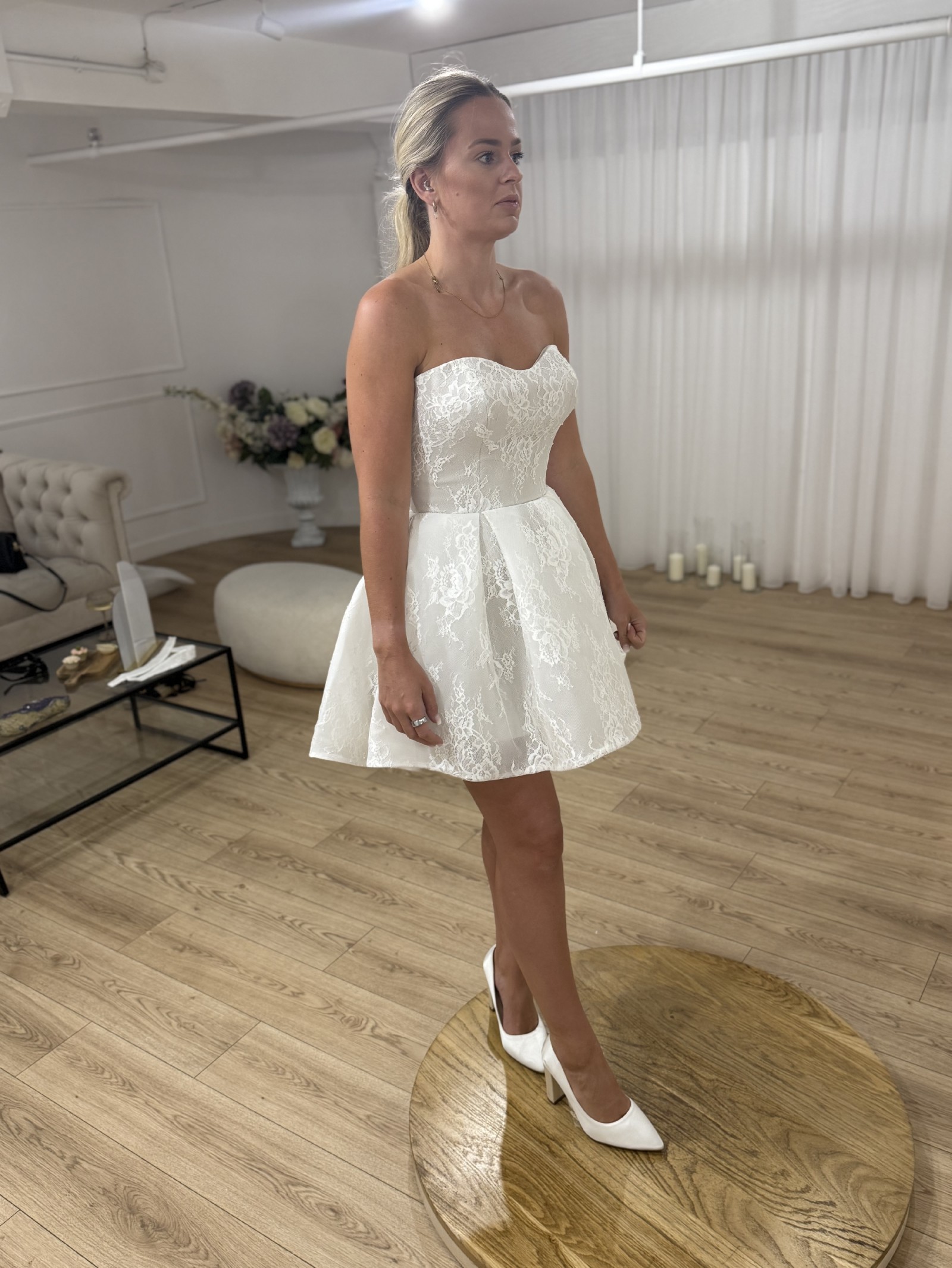 Designed for those who appreciate exquisite detail, the Cleo mini showcases delicate embroidery that elevates its whimsical aesthetic. The strapless design ensures a secure fit, while the low back adds a hint of allure, striking the perfect balance between classic and contemporary. Its above-the-knee length makes it a playful yet sophisticated option for a variety of wedding settings, from a chic city hall ceremony to a dreamy garden celebration.