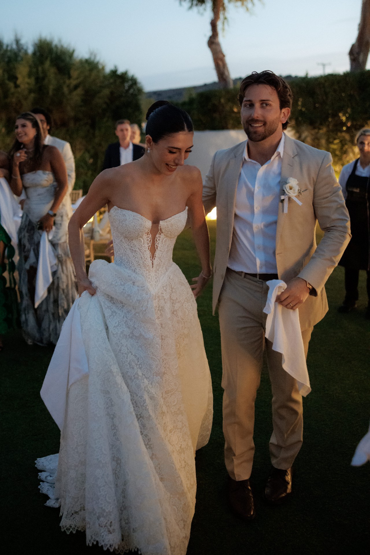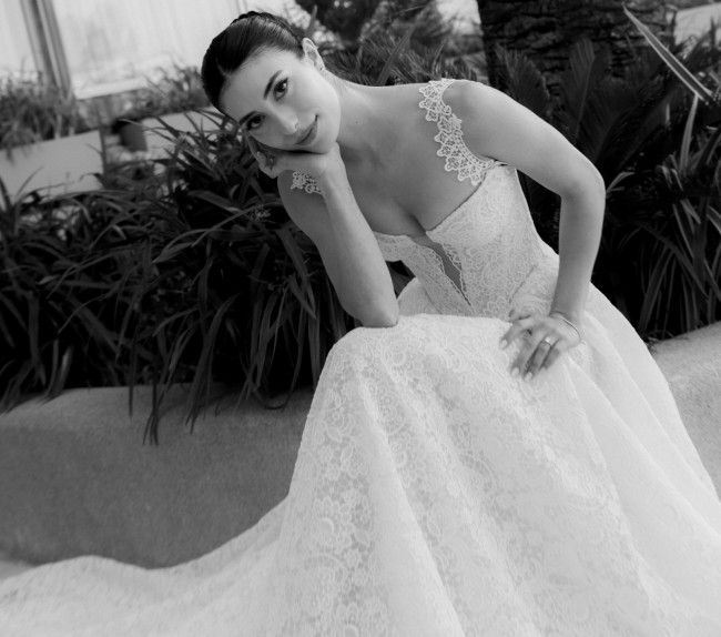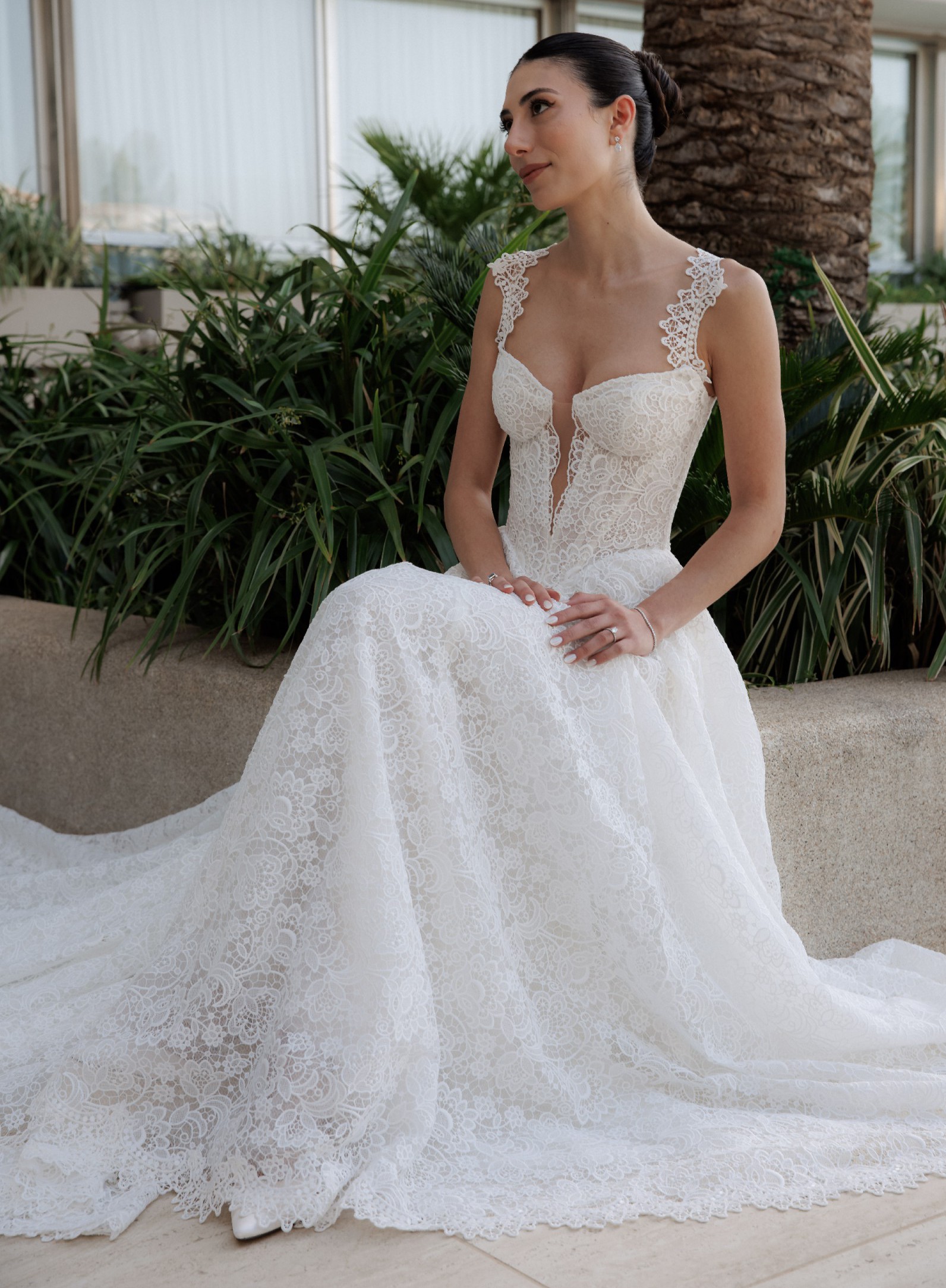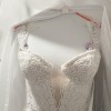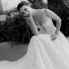 Galia is a genius. French guipure corseted drop waist ball gown with dramatic extended cathedral train. Corset bodice with zipper back, delicate plunge neckline with cat ear shape bra cups. Worn once. In excellent condition. Detachable straps included (they snap on and off from front and back). I had mine completely lined in ivory so it's not see-through.