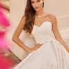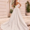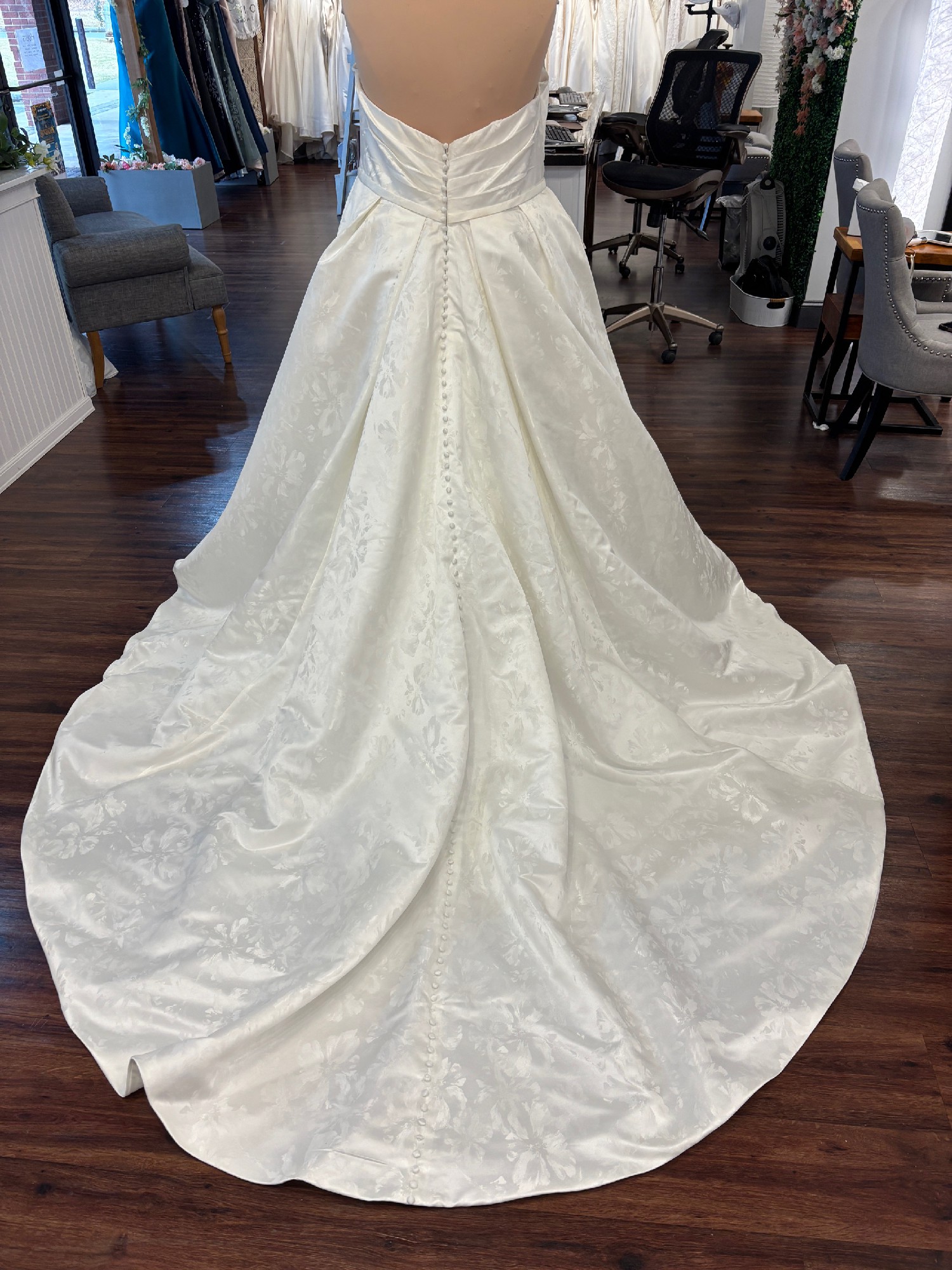 Make a regal impression in this ultra-stylish ball gown. Crafted from sumptuous satin with a delicate floral motif, this bridal style epitomizes classic elegance with a modern twist. The softly structured ruched bodice cinches the waist, while the sweeping full skirt and dramatic cathedral train creates breathtaking movement. Stylish covered buttons cascade down the cathedral train to complete this timeless bridal look