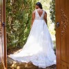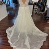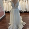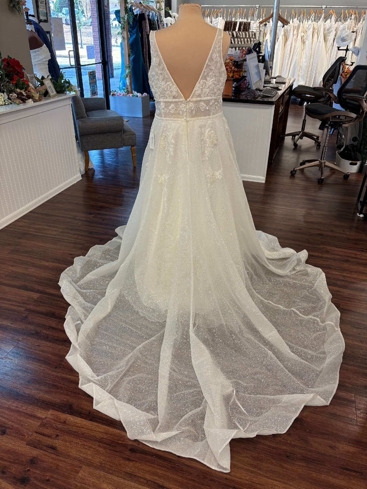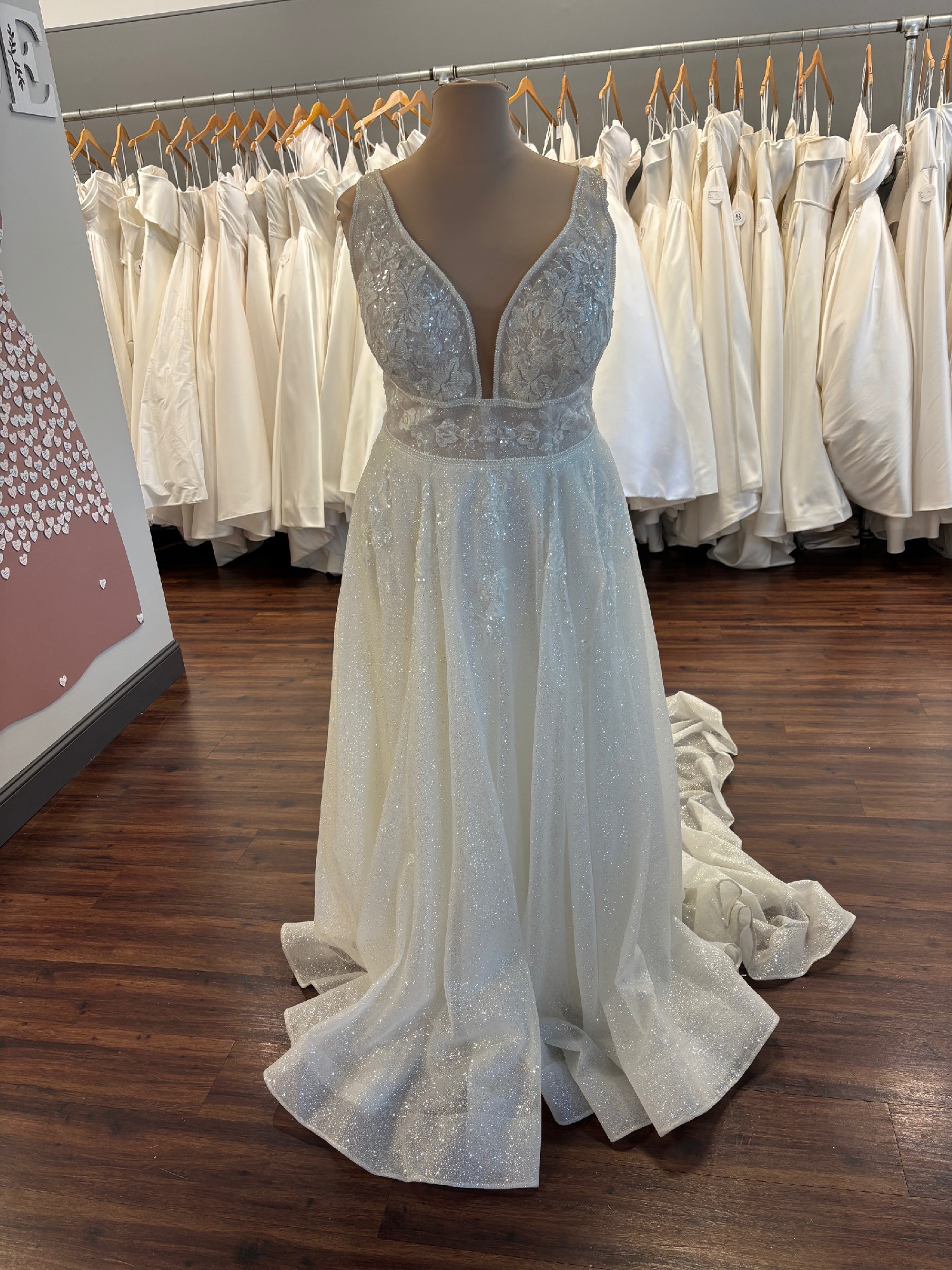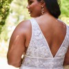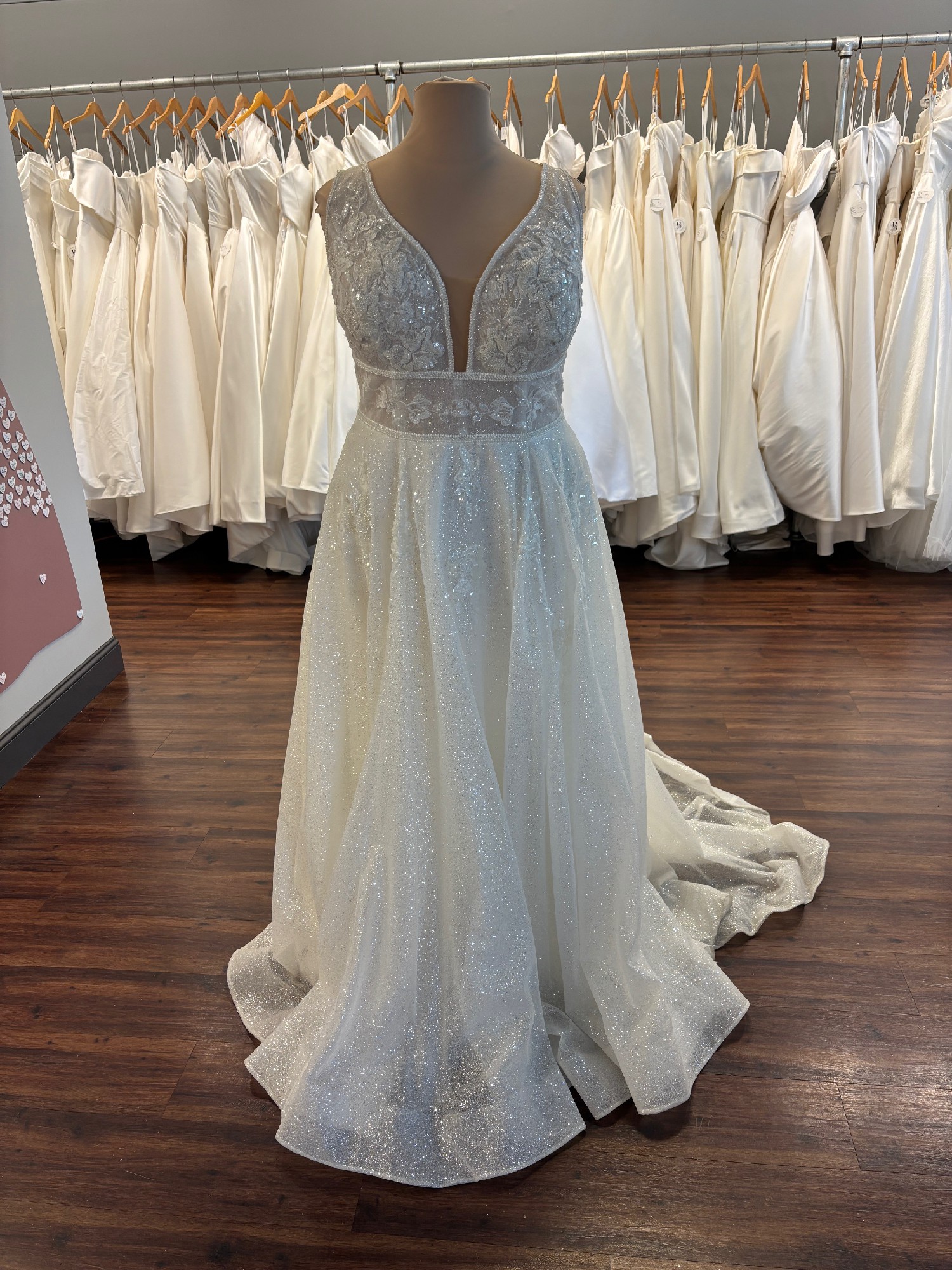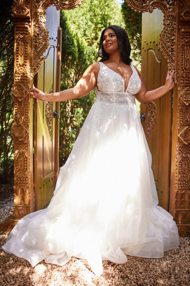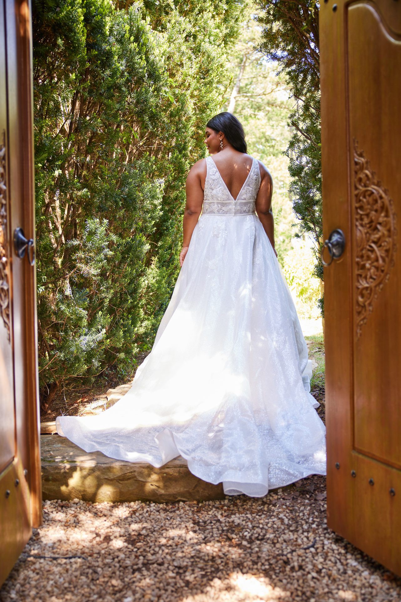 Luxury, glamour and drama come together in this gorgeous A-line wedding dress. Brittany was made for the bride who’s not afraid to sparkle. The modern lace and sequin bodice features elegant wide-set straps and a sexy plunging illusion neckline, all framed by a luxurious embroidered and beaded trim. The semi-sheer waist band highlights the delicate lace features and connects the alluring front bodice to the daring V-shaped back detail. From the natural waist, shimmering sparkle tulle floats into a royal train for the final touch of effortless glamour. This wedding dress is also available in plus sizes. Essense of Australia Style D3445